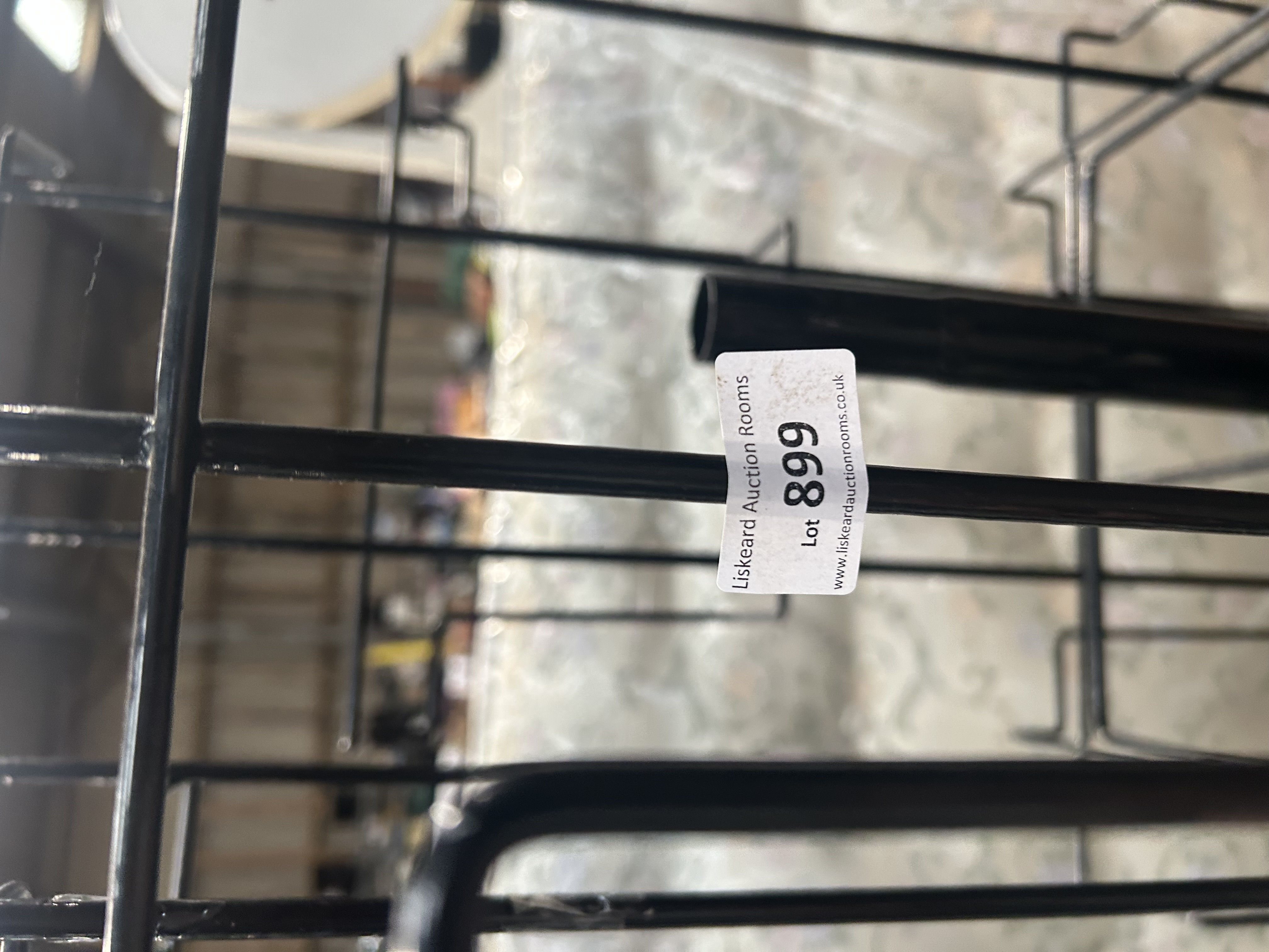 This lot comprises an assortment of retail and commercial display equipment. The collection includes several floor-standing rotating wire racks, commonly referred to as spinners, finished in black and white powder coating. These units feature multiple tiers of wire pockets designed for the display of greeting cards, postcards, or similar light media. Each rack is constructed from welded metal wire supported by a central upright pole on a stable base. Also included is a black metal multi-head adjustable spotlight display pole, featuring several cylindrical lamp housings mounted to a central column. An adhesive auction identification tag from Liskeard Auction Rooms is attached to one of the units, marked as Lot 899.