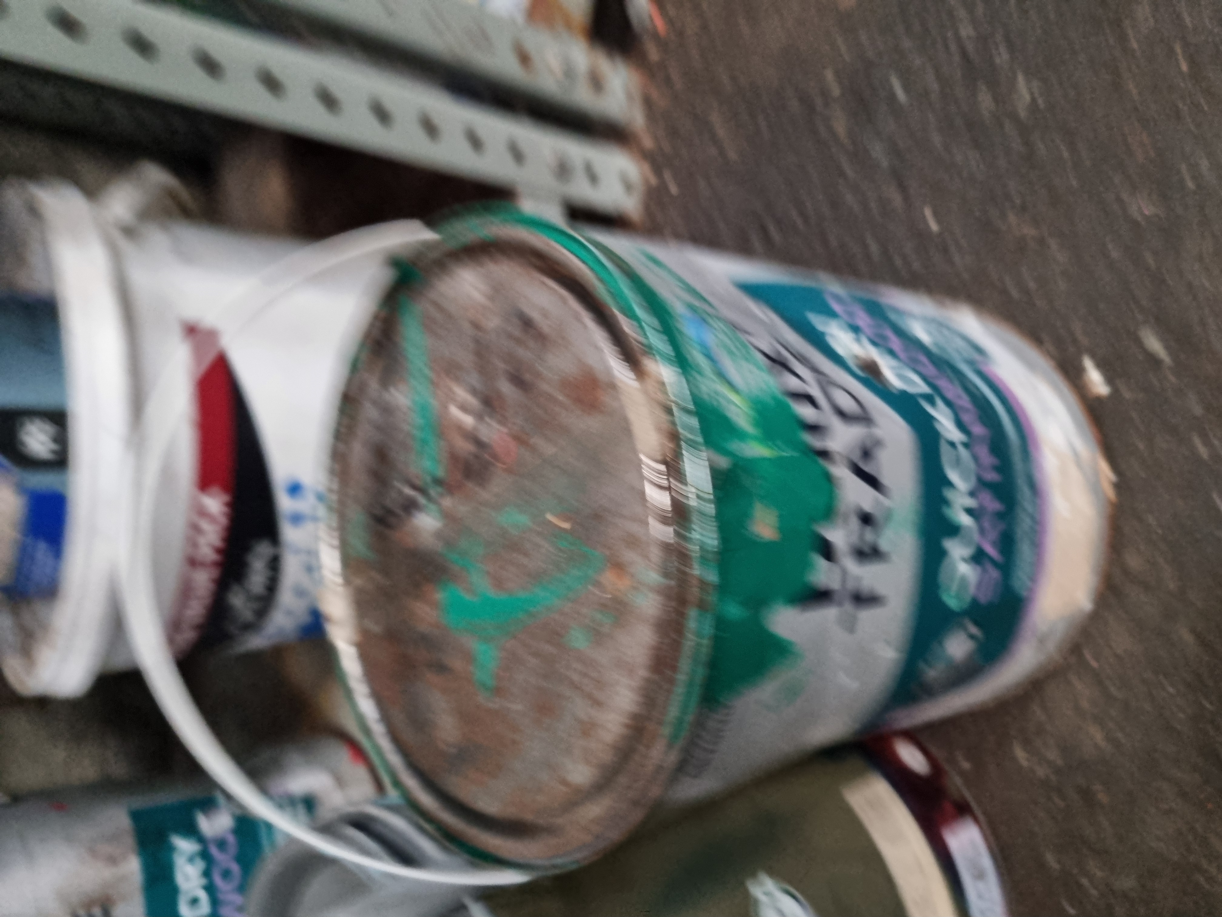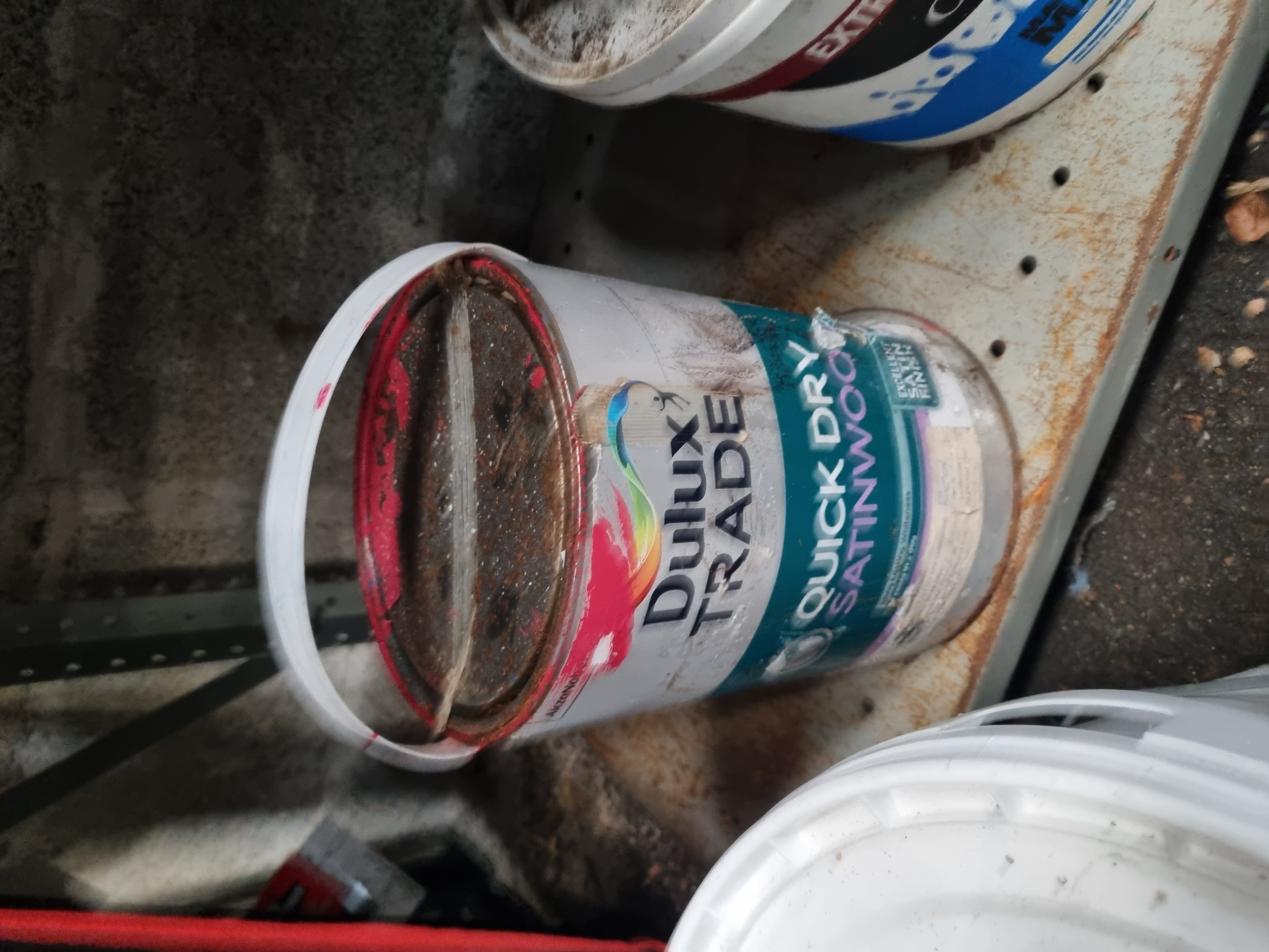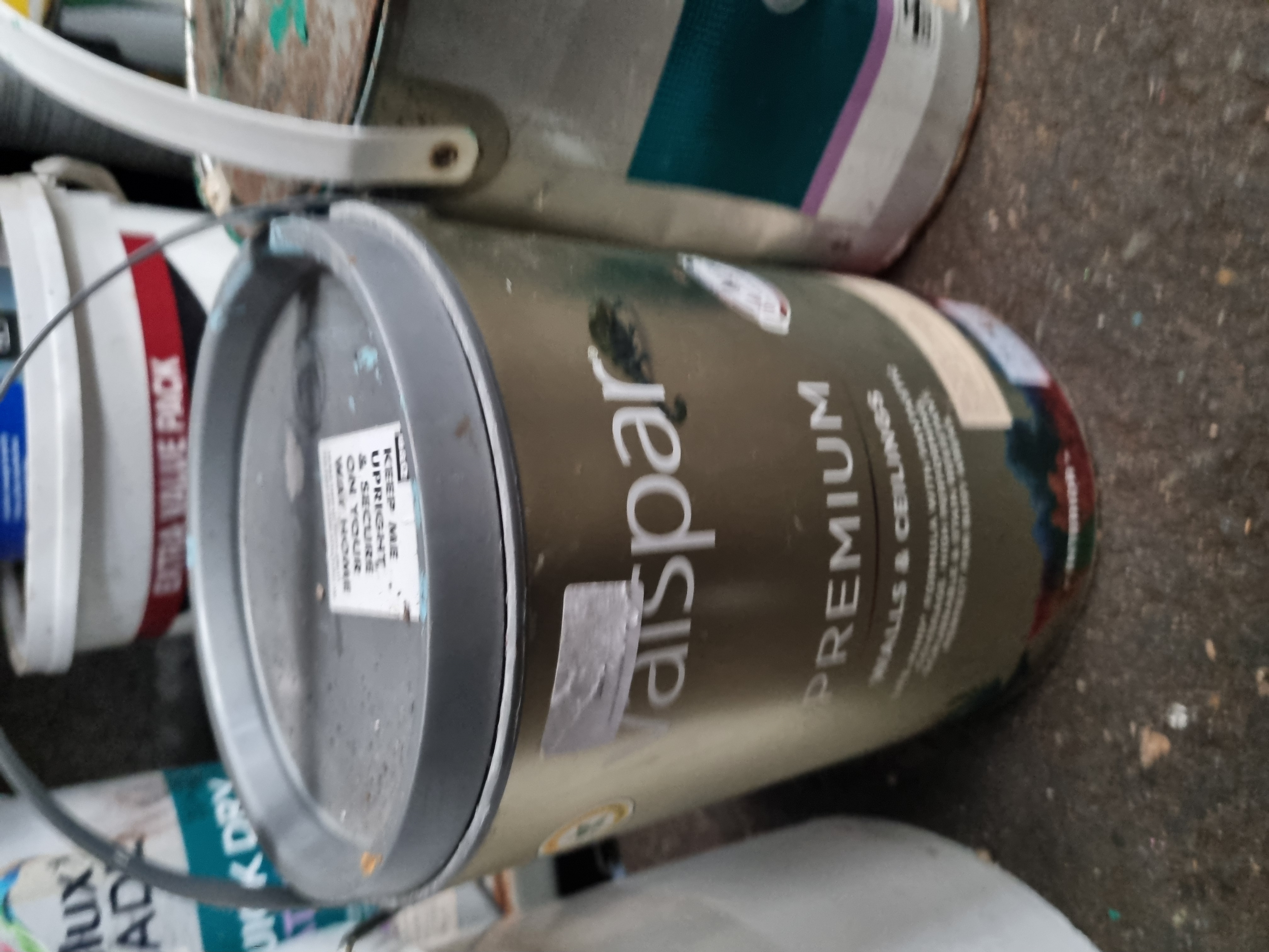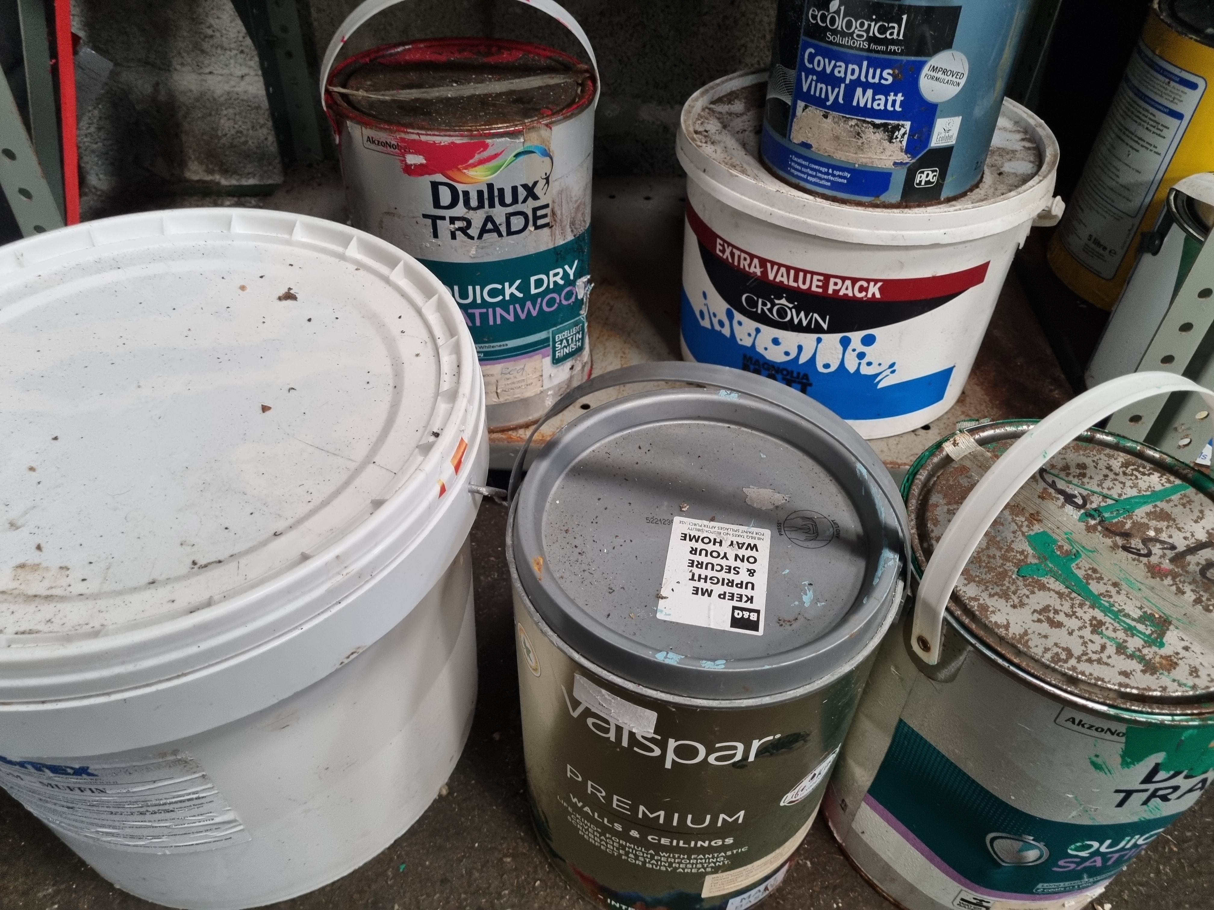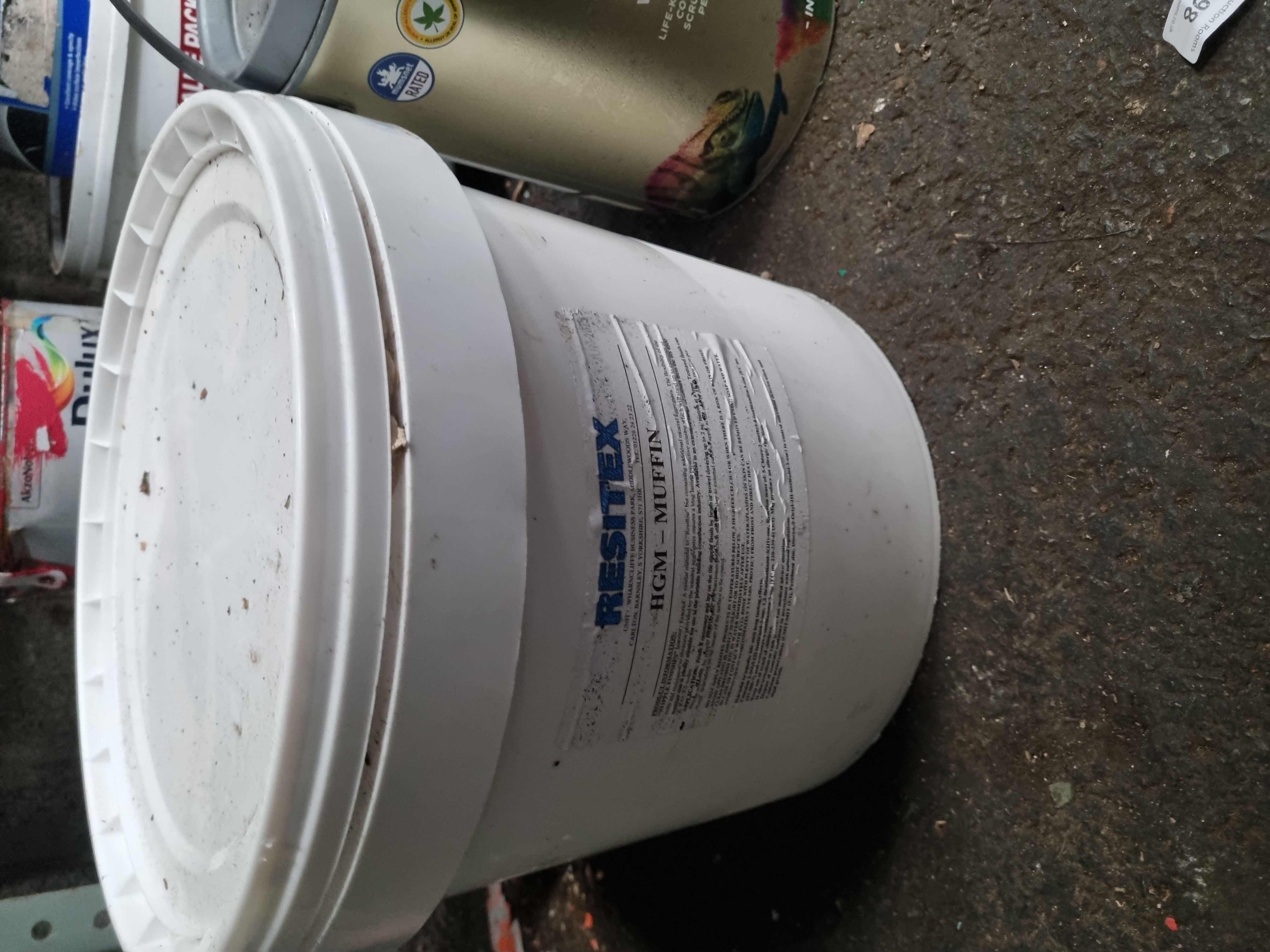 A collection of various paints and decorating materials from several manufacturers. The lot includes a metal tin of Dulux Trade Quick Dry Satinwood, a large plastic bucket of Crown Magnolia Matt from an Extra Value Pack, and a metal tin of Johnstone’s Trade Covaplus Vinyl Matt. Also present is a metal tin of Valspar Premium Walls and Ceilings and a large white plastic bucket of Resitex HGM in the shade Muffin. The containers vary in size and include both metal tins with lids and plastic buckets with integrated handles. Some lids feature retail over-stickers from B&Q.