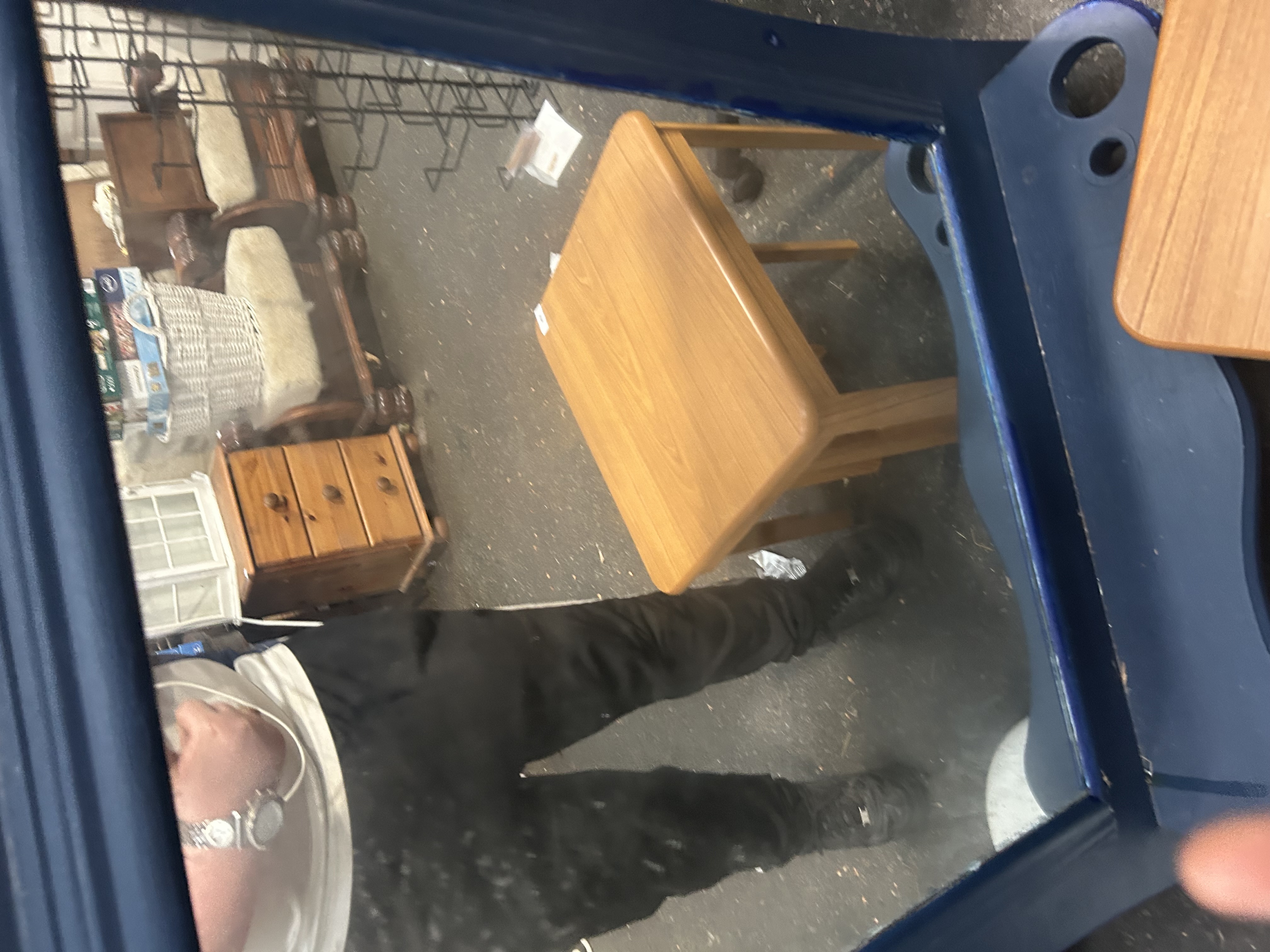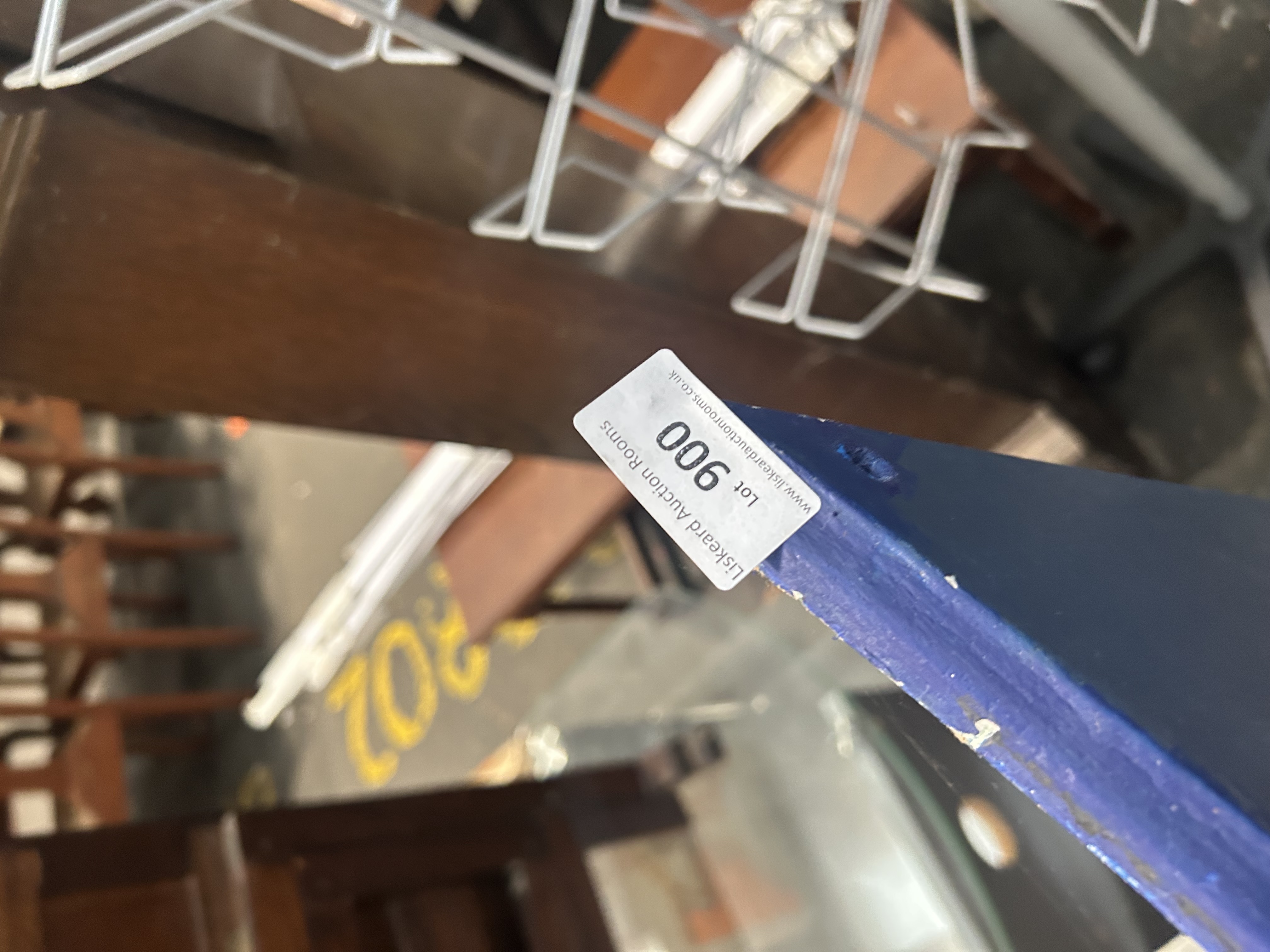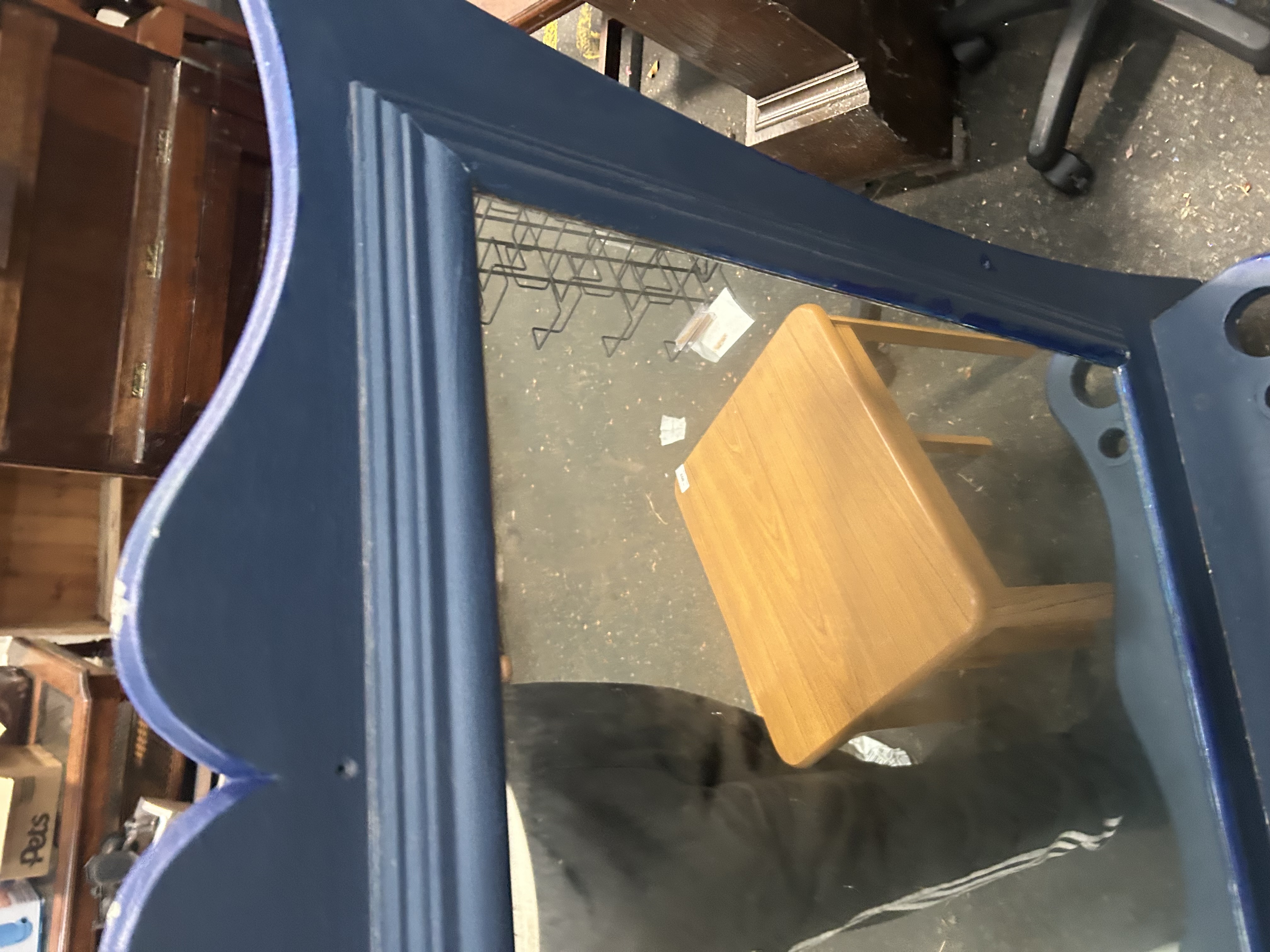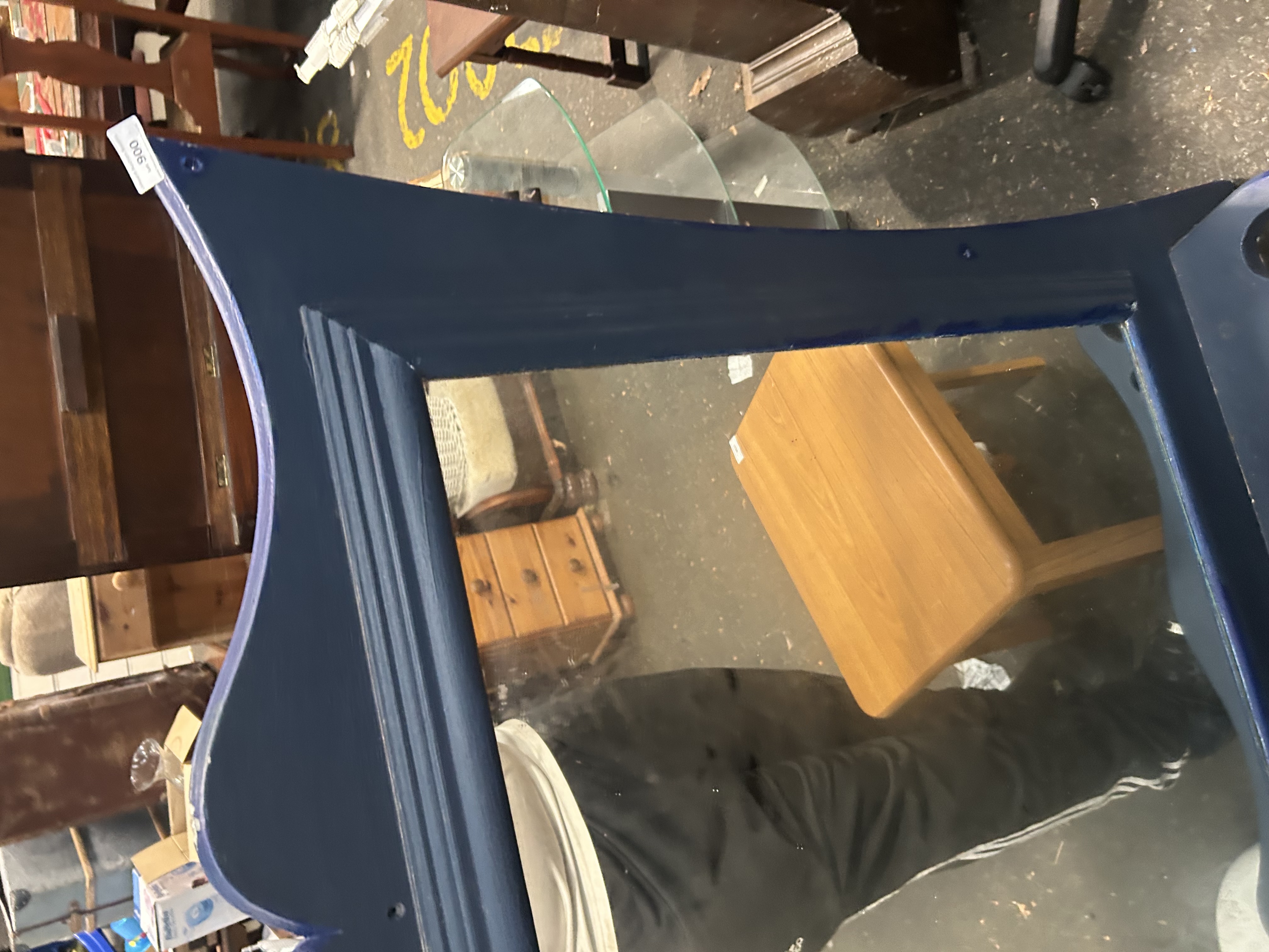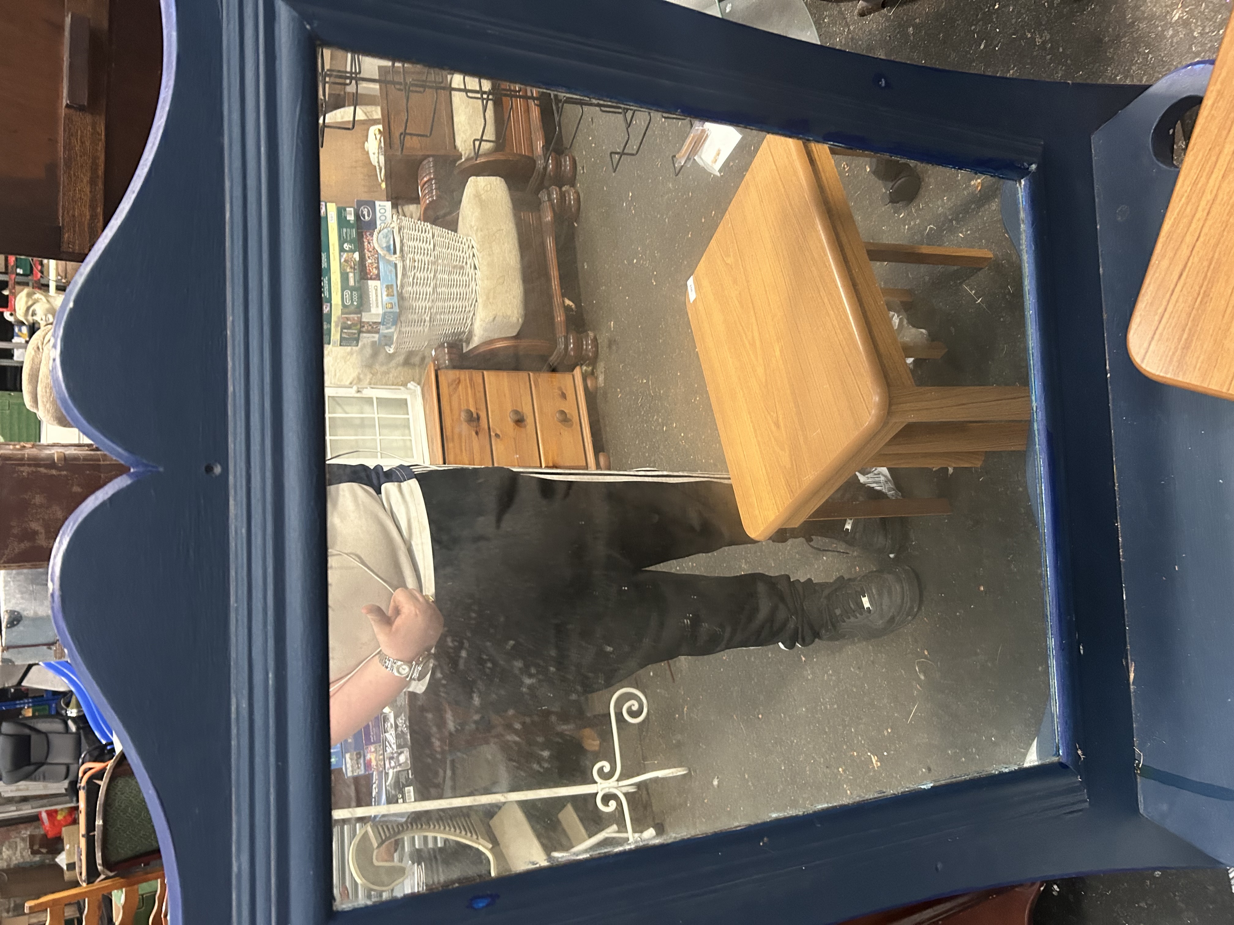 A rectangular dressing table mirror featuring a wooden frame with a decorative shaped and lobed top rail in the Queen Anne revival style. The inner edge of the frame is finished with stepped moulding around the mirror plate. The entire frame has been finished in a modern deep navy blue paint. The vertical side members of the frame extend downwards and contain pre-drilled holes, indicating its original purpose as an attached mirror for a piece of bedroom furniture. A white adhesive lot label for Liskeard Auction Rooms (Lot 900) is present on the top corner. Construction consists of a wooden frame and a silvered glass mirror plate.
