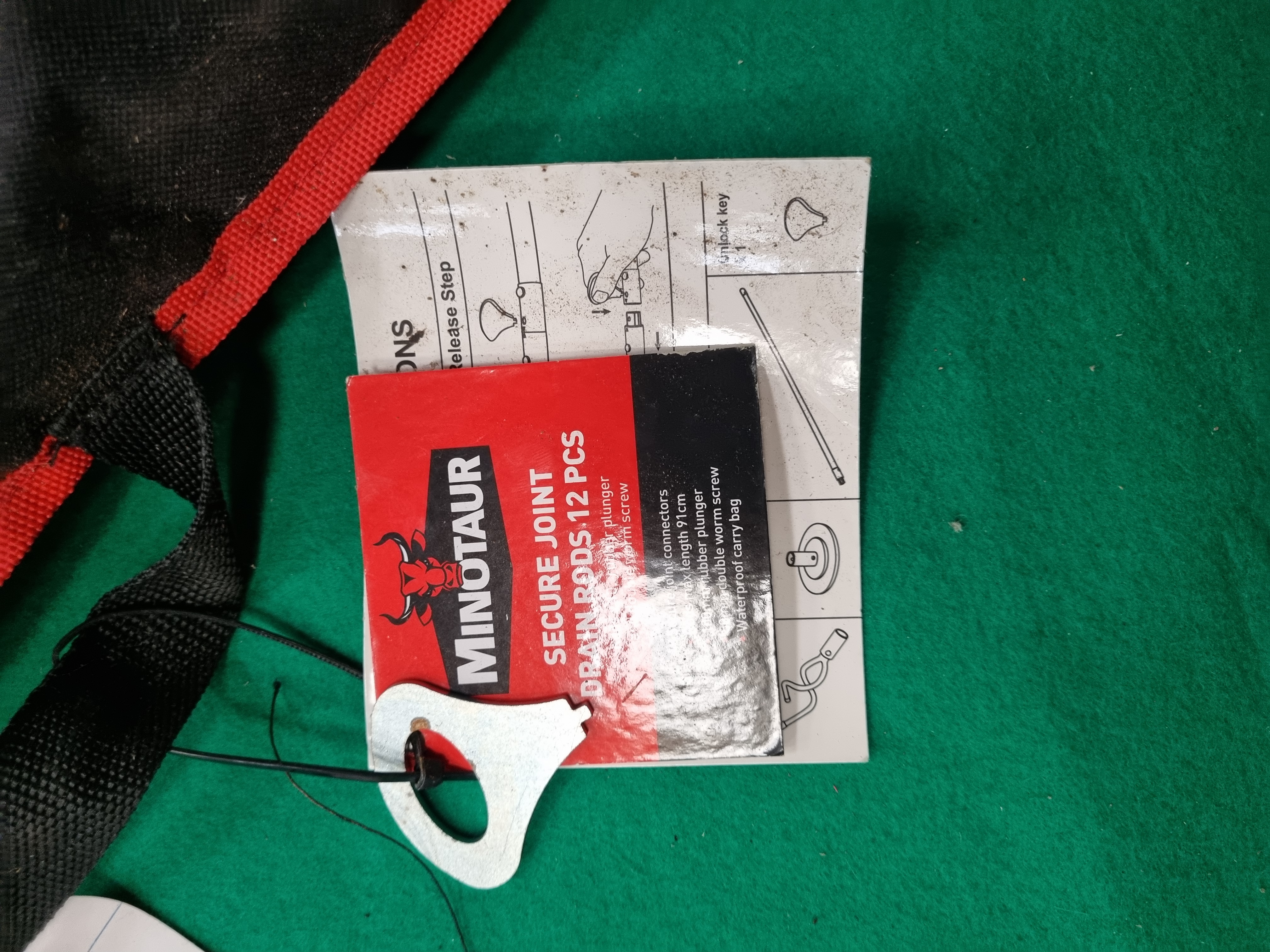 A 12-piece set of Minotaur Secure Joint drain rods. The set comprises black rods featuring metal secure-joint locking mechanisms, a 100mm rubber plunger, and a 50mm double worm screw. A metal unlock key for the joint mechanism is included. The components are housed in an original branded black and red waterproof fabric carry bag with a hook-and-loop fastening and integrated carrying handles. The original product tag and illustrated instruction sheet are present.