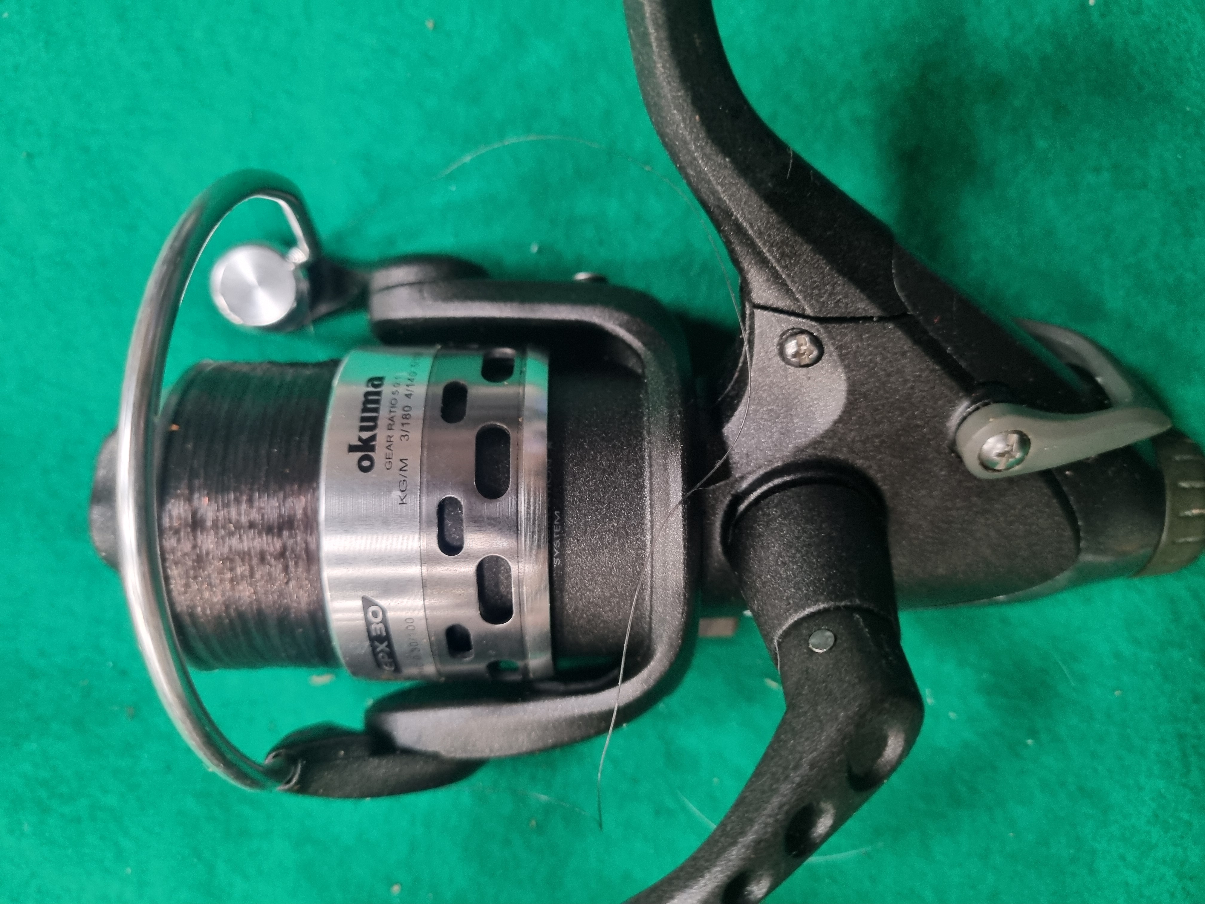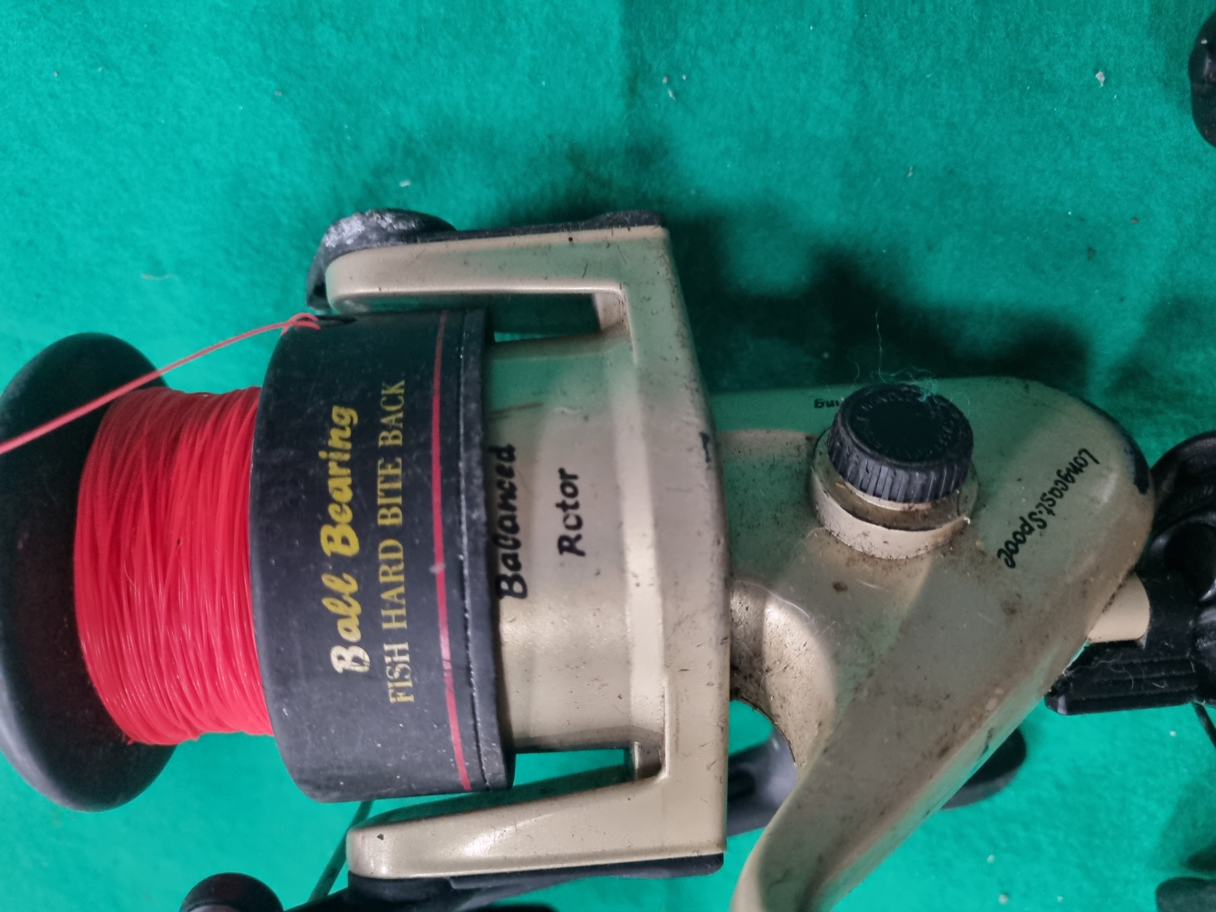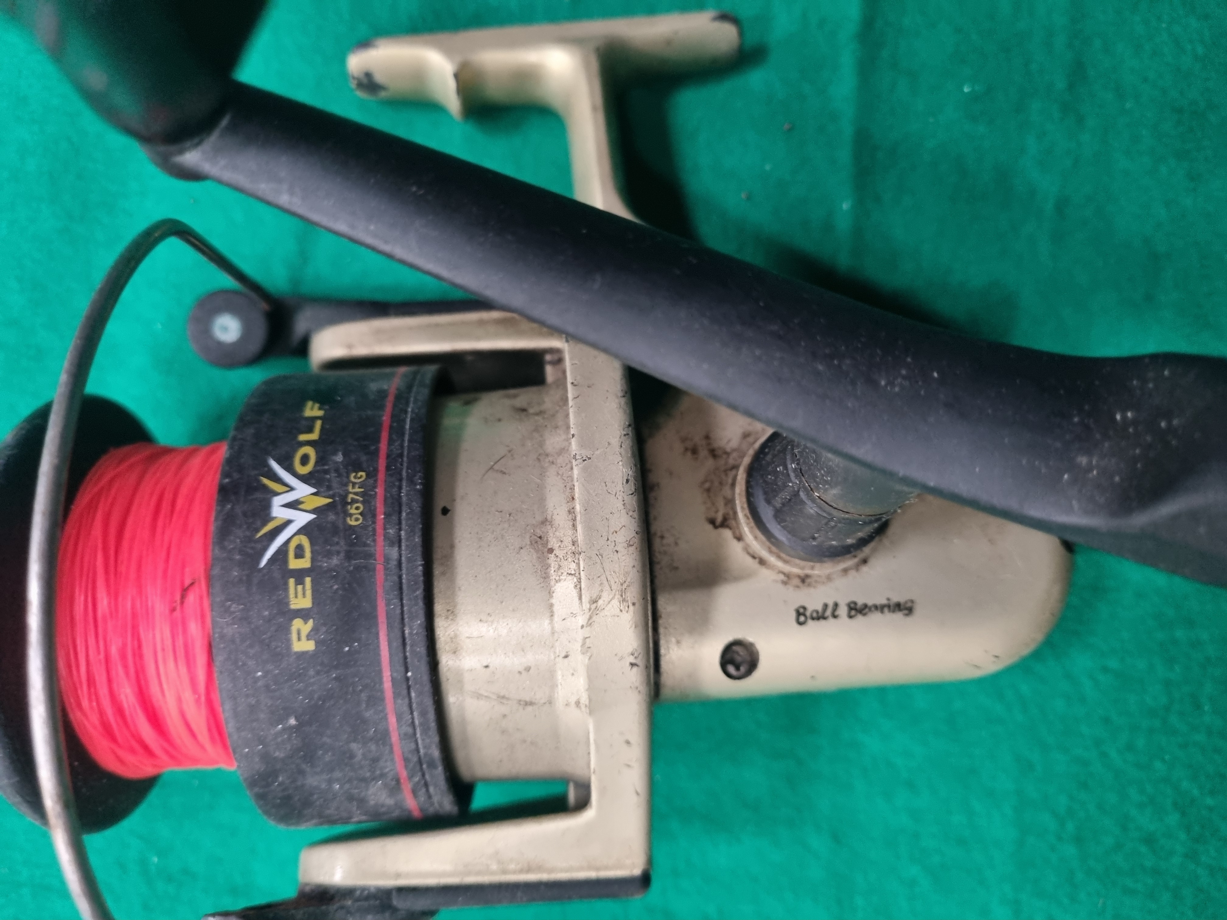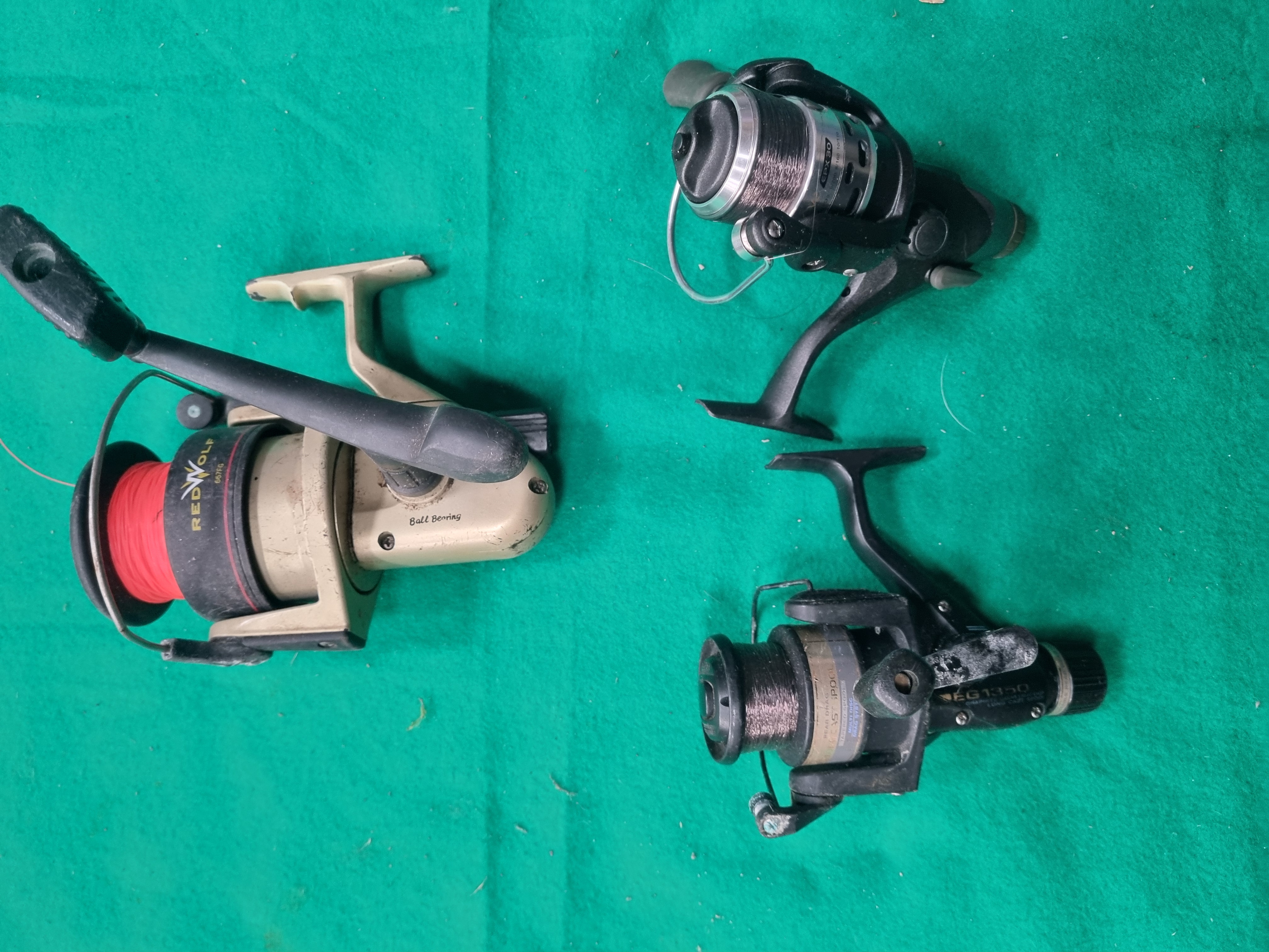 Lot 93: A Trio of Assorted Spinning Fishing Reels Including Red Wolf and Okuma Models