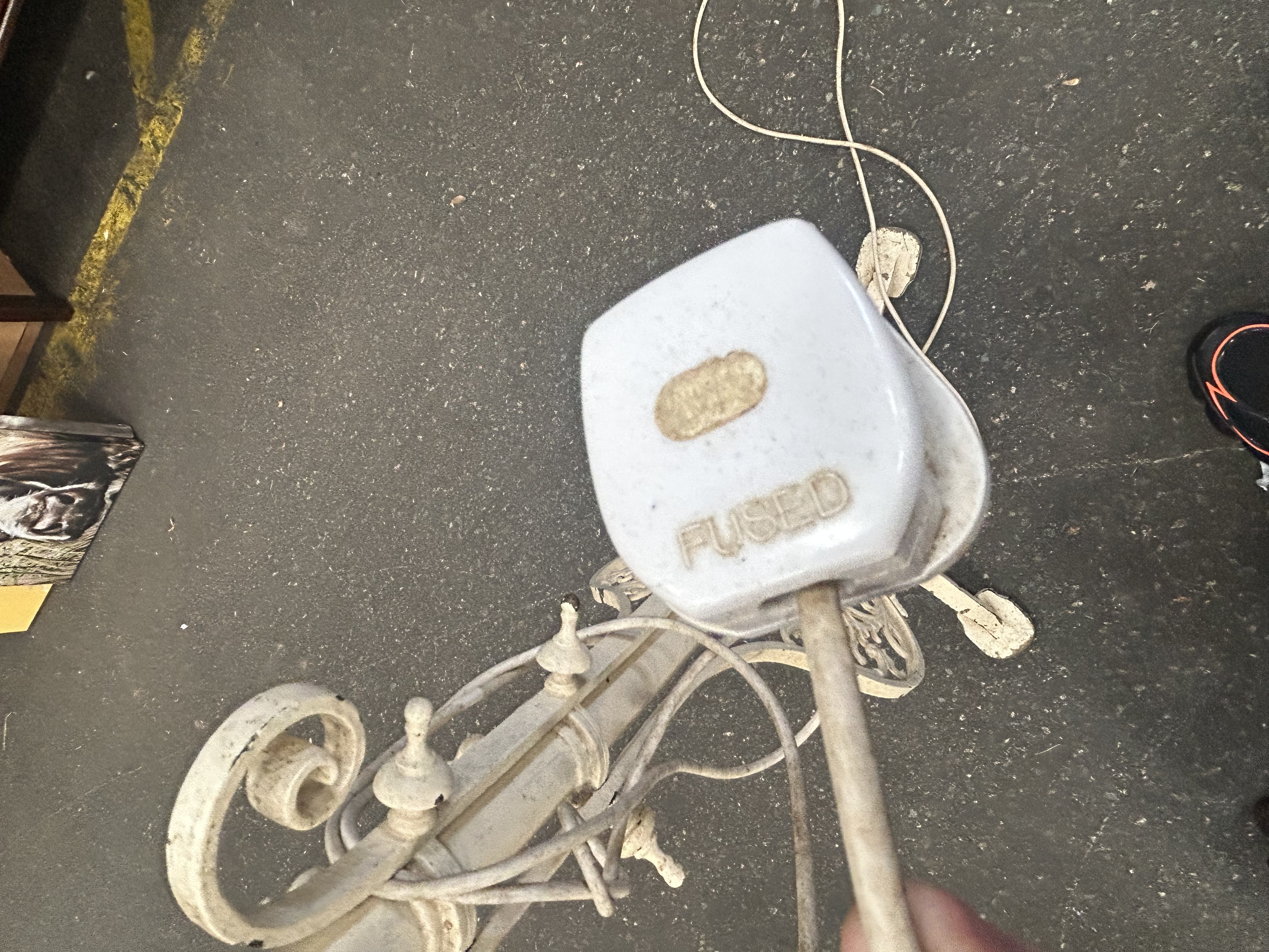 This floor lamp is constructed from cast iron with a cream-painted finish that exhibits a distressed appearance. The design incorporates an ornate tripod base with scrollwork motifs and a central stem fitted with three scrolled hooks and multiple turned finials, suggesting the item may be an adapted early 20th-century hall stand. It features a brass bayonet cap lamp holder and is currently fitted with a candle-style bulb. The electrical wiring consists of a modern white PVC-insulated cable and a standard UK three-pin fused plug. No manufacturer marks were identified on the base or column.