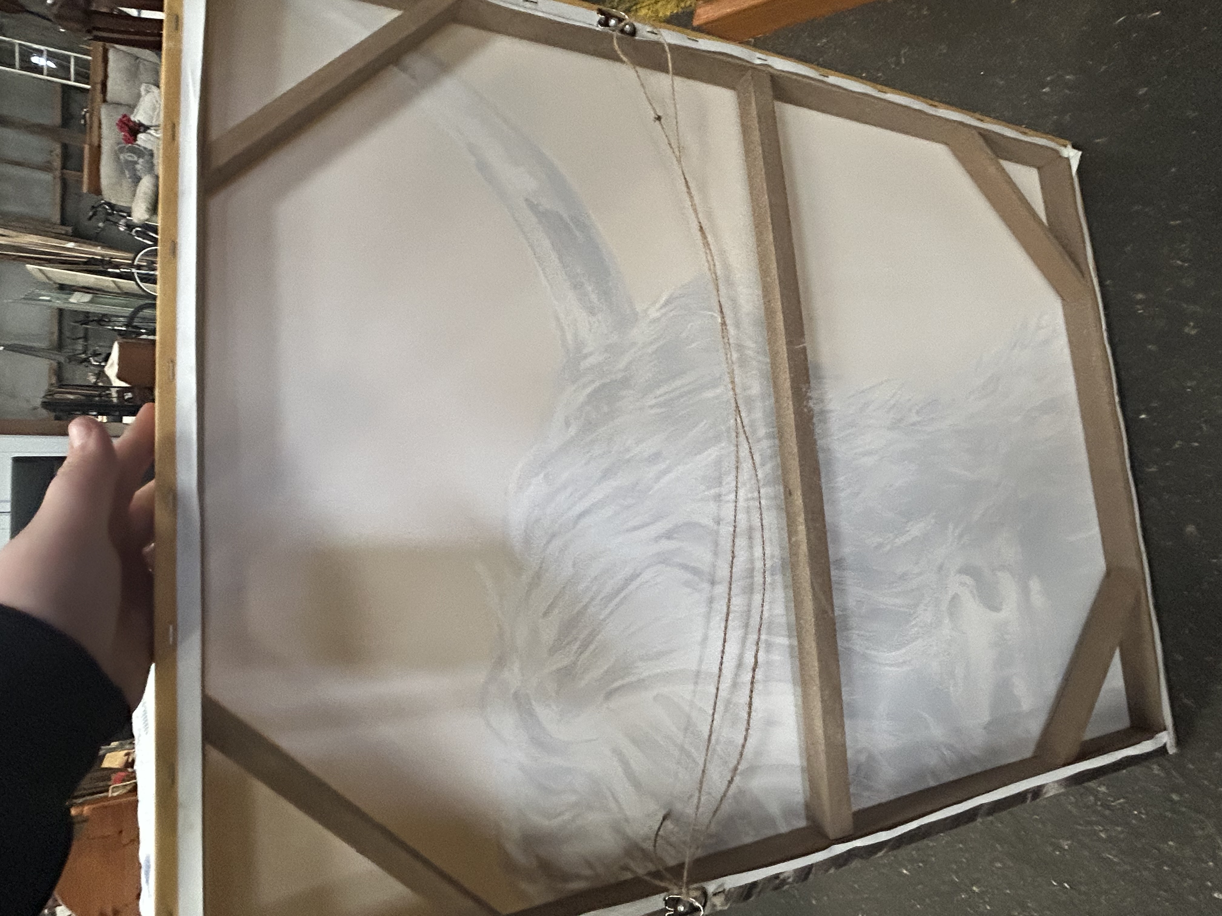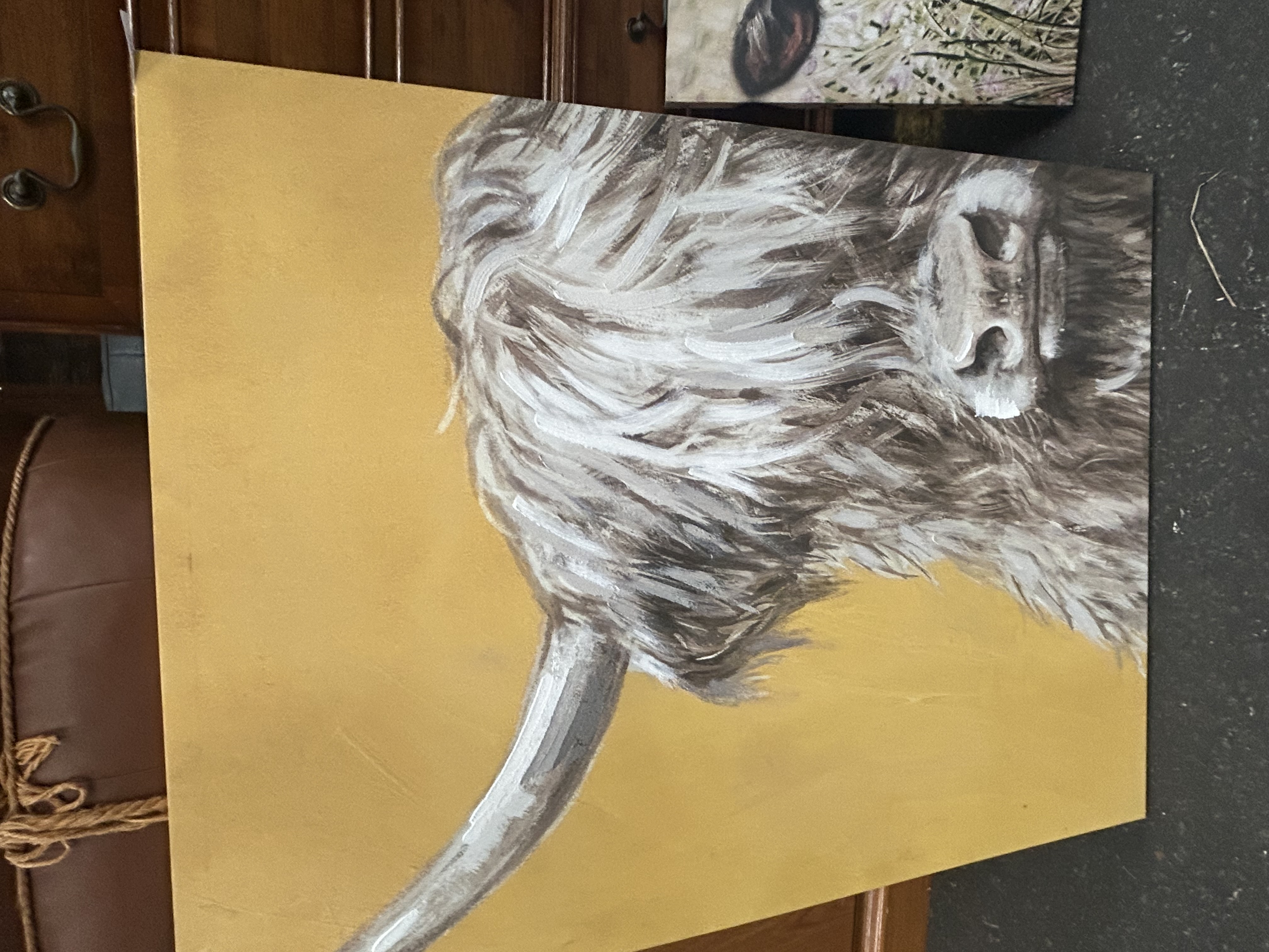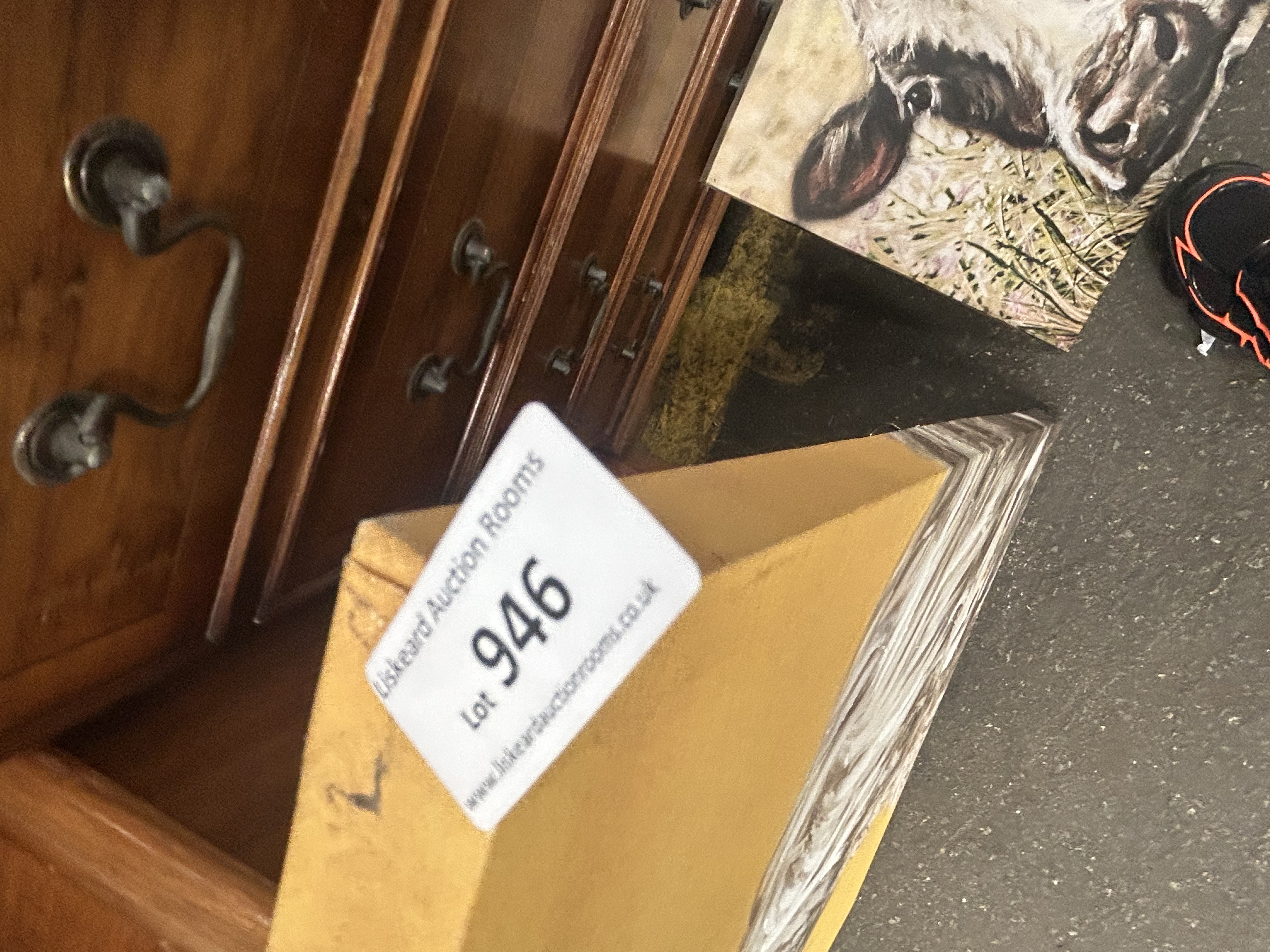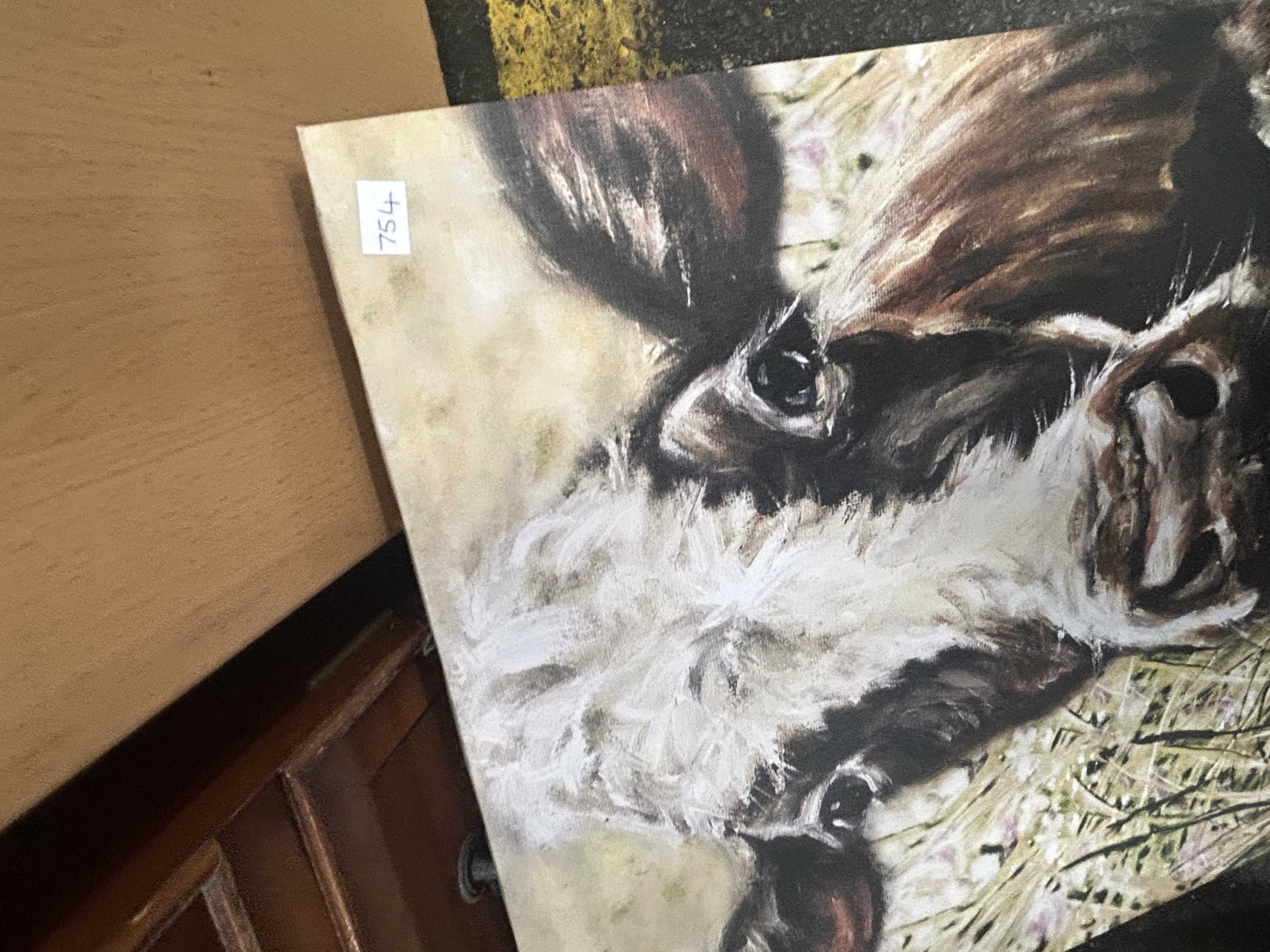 Two contemporary decorative animalier studies executed in a painterly style on stretched canvas, depicting bovine subjects. The larger vertical work features a Highland cow head rendered with energetic, textured brushwork against a flat ochre-yellow background. The smaller square canvas depicts a cow head in a field with a more varied colour palette and similarly vigorous application of paint. Both pieces appear to be mass-produced decorative wall art consistent with items sold through major retail outlets. Neither work bears a visible signature, date, or artist’s mark. The larger canvas is mounted on a standard wooden stretcher frame with corner bracing and is fitted with a hanging wire on the reverse. The items are identified with auction labels, including one for Liskeard Auction Rooms as Lot 946.