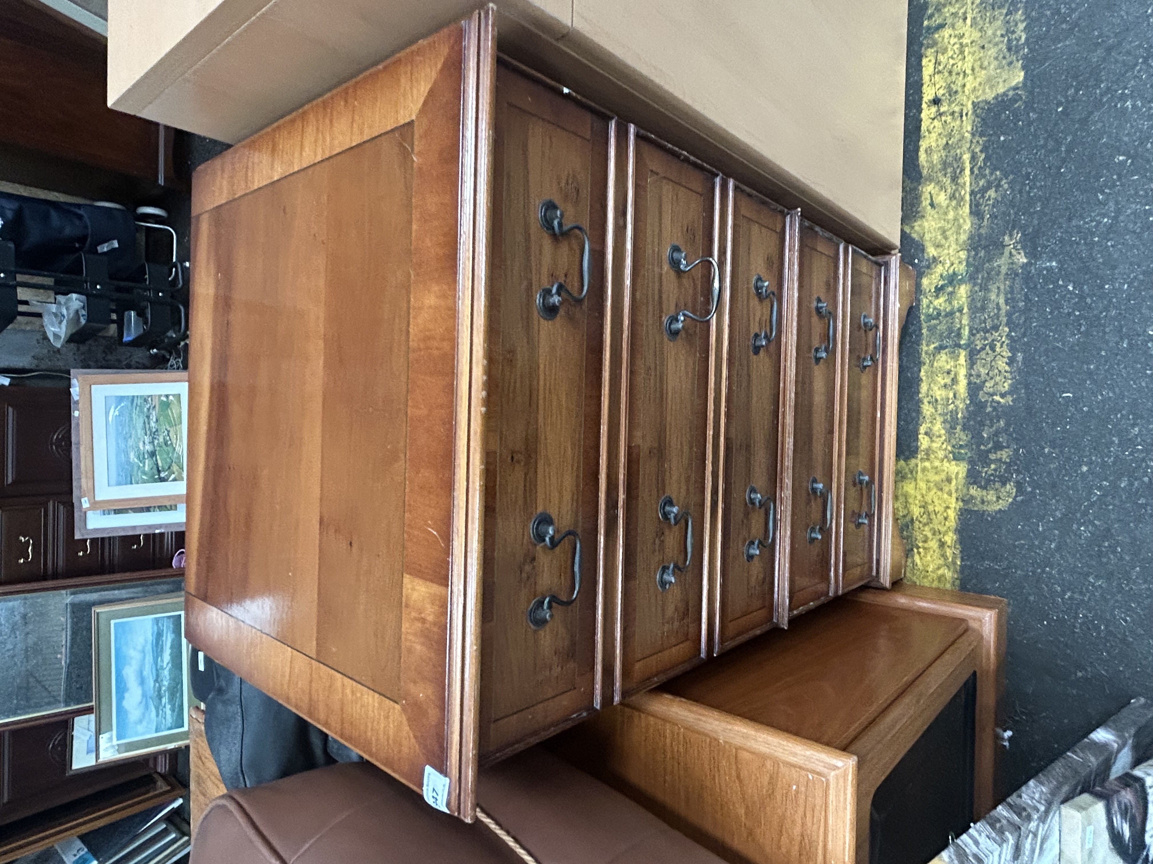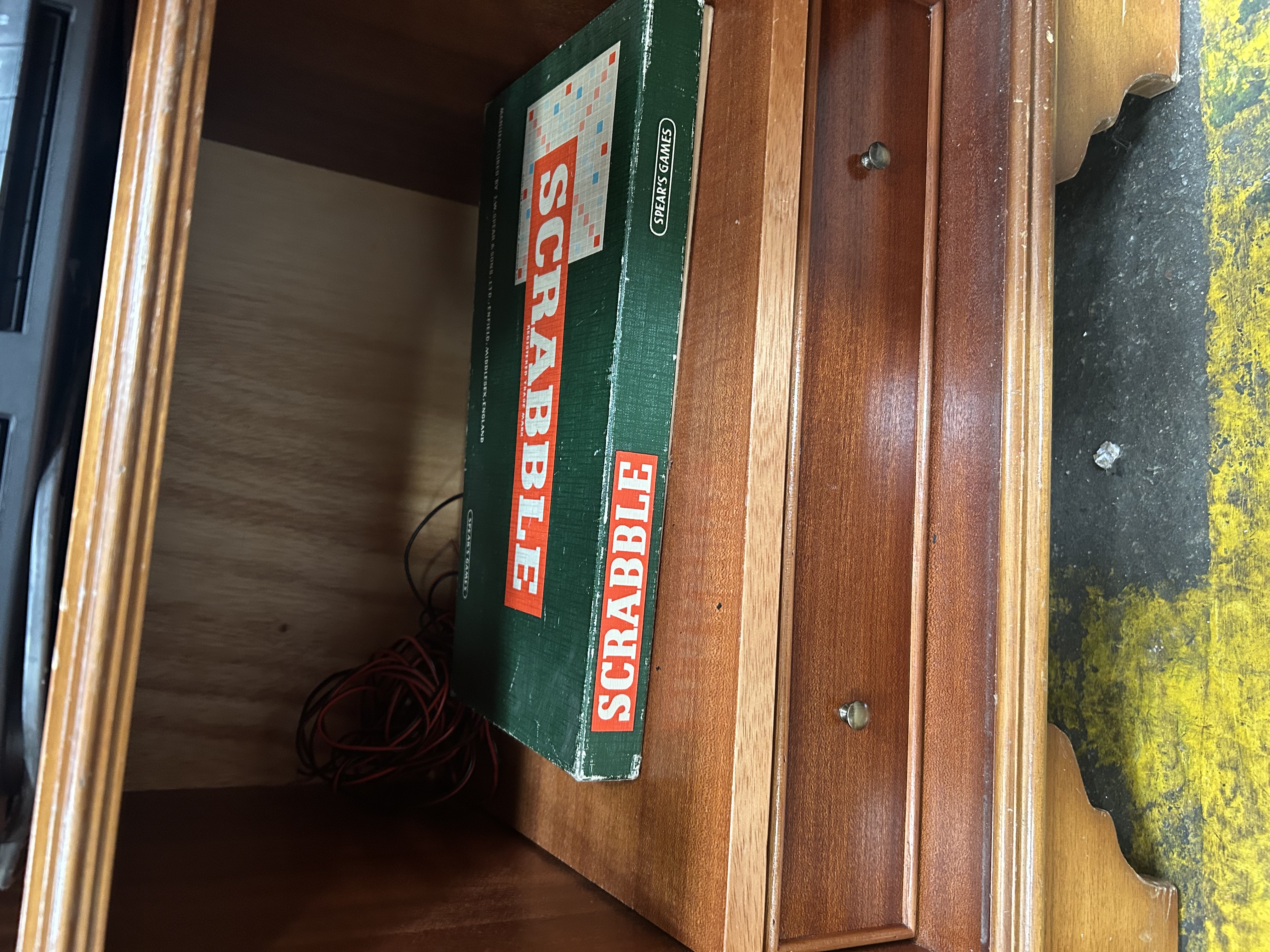 A Sony LBT-V202 Compact Hi-Fi Stereo System, manufactured circa 1990, housed in a late 20th-century traditional reproduction wooden cabinet with a mahogany-toned finish. The cabinet is designed with a faux drawer front to resemble a small chest of drawers, featuring ten antiqued metal drop-pull handles. The front panel is a side-hinged door that opens to reveal the main component stack, while the top lid is hinged with a brass-coloured stay, providing access to the turntable. The integrated Sony system, Model LBT-V202CD, comprises a PS-LX43P servo-controlled turntable, a CDP-M18 compact disc player, an ST-V202 FM/AM/LW 3-band tuner, an LBT-V202 stereo deck receiver with a built-in graphic equaliser, and an integrated dual cassette deck. The cabinet is constructed from wood and veneers. The lot includes the original operating instructions and a vintage Spear’s Games Scrabble board game.
