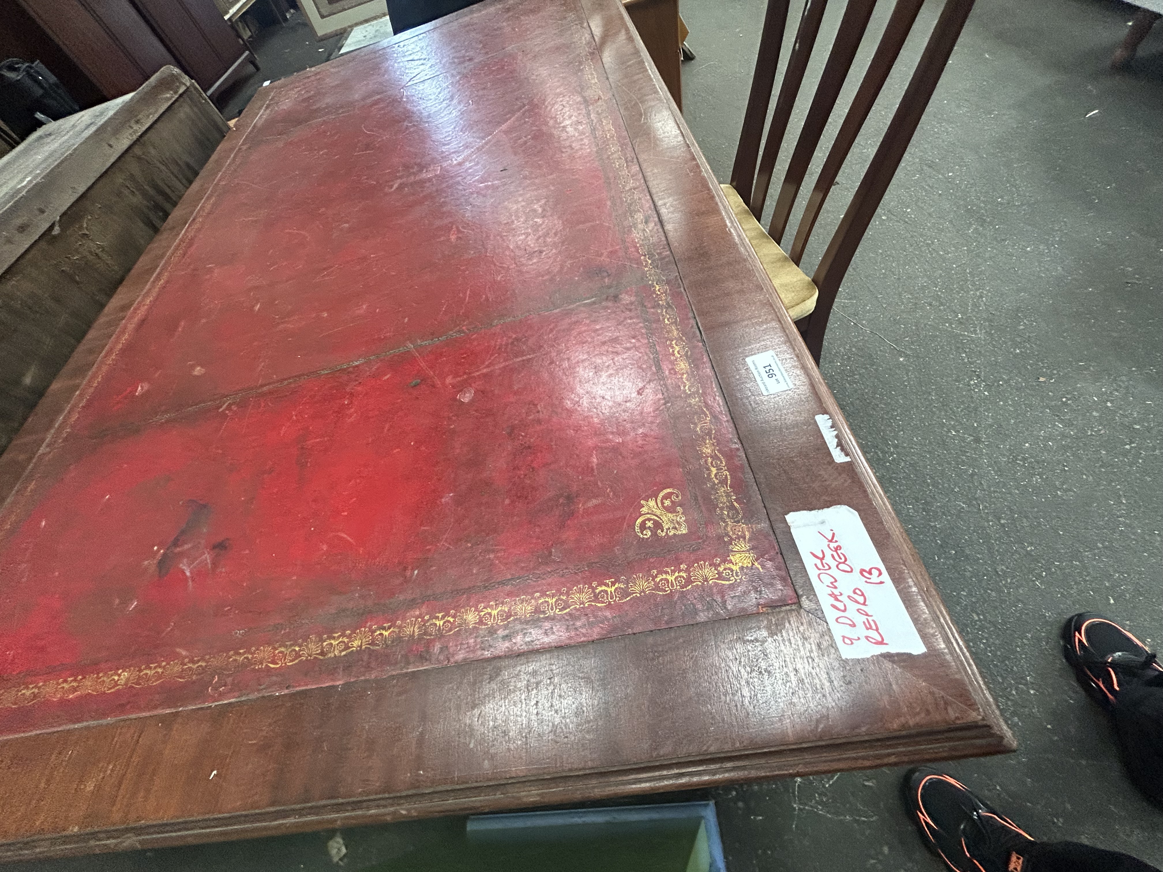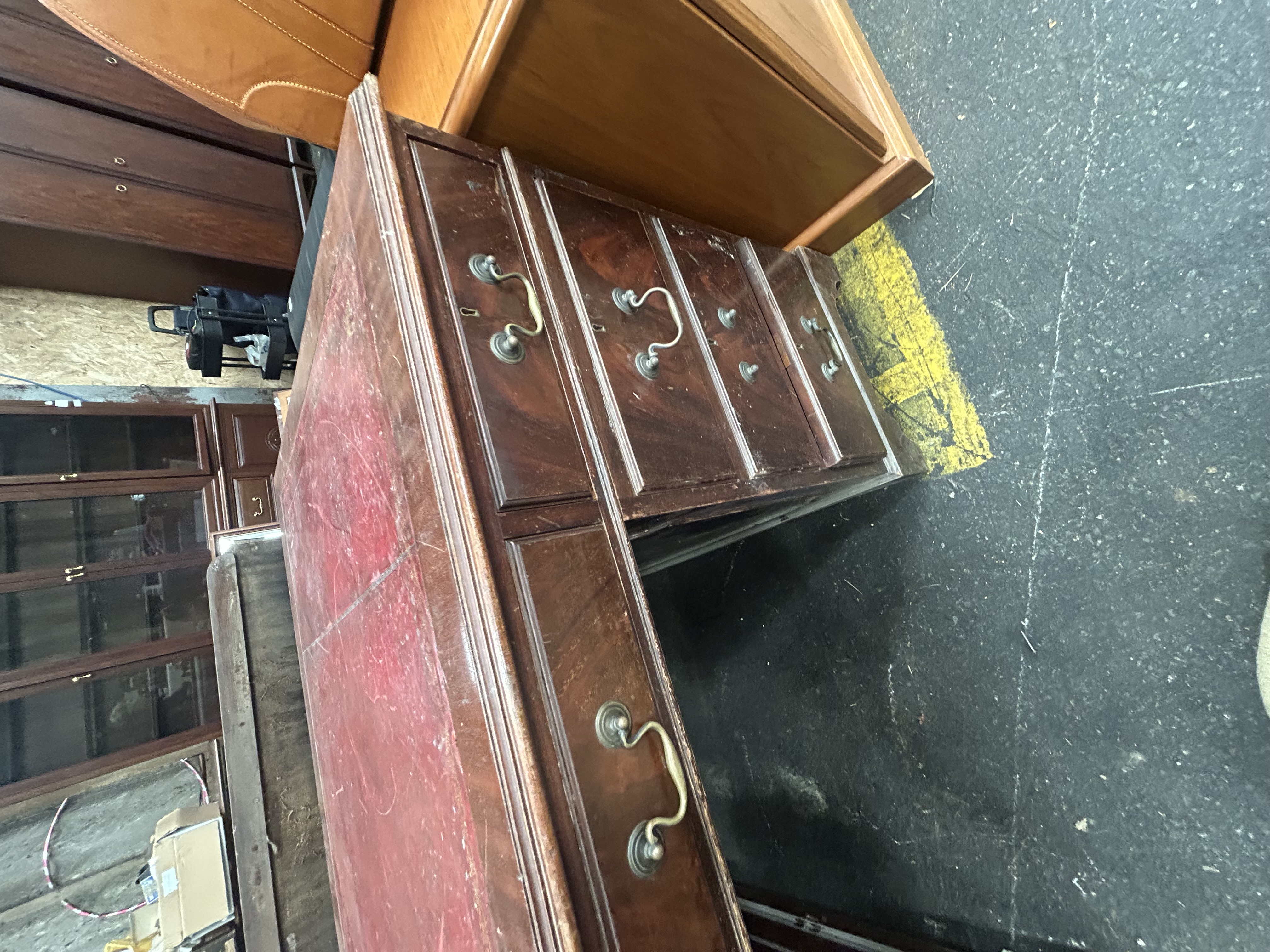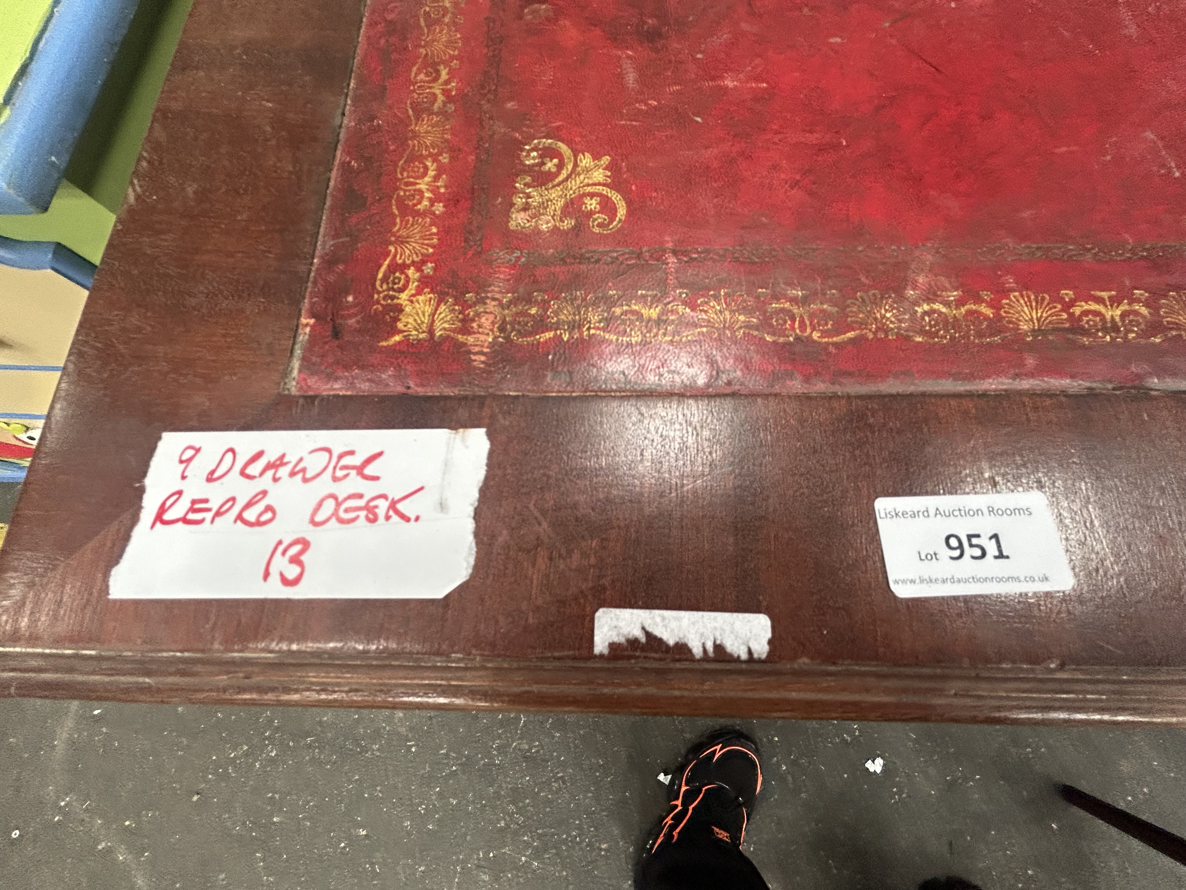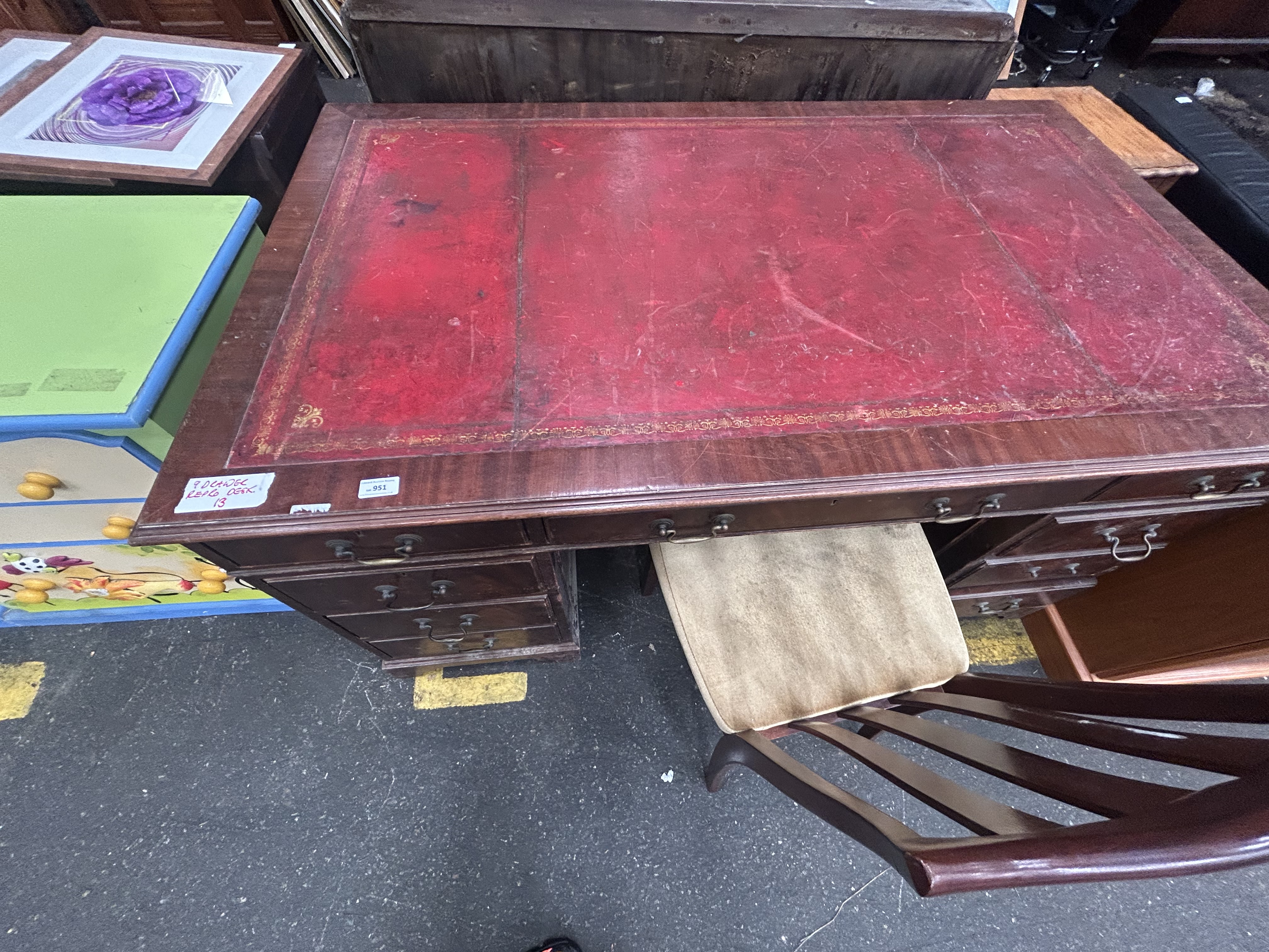 Lot 951: A Reproduction Mahogany-Finished Nine-Drawer Pedestal Desk and Associated Chair