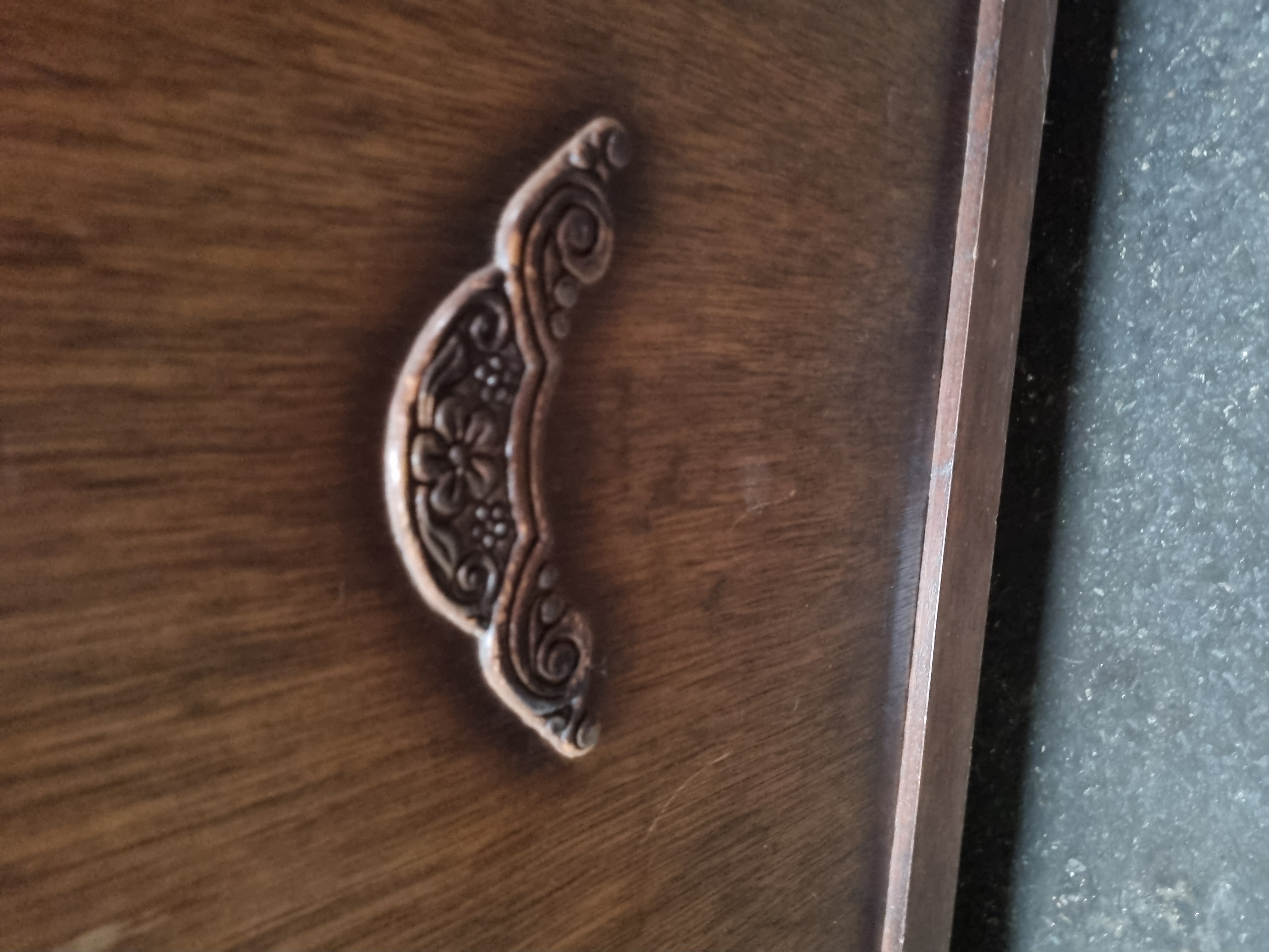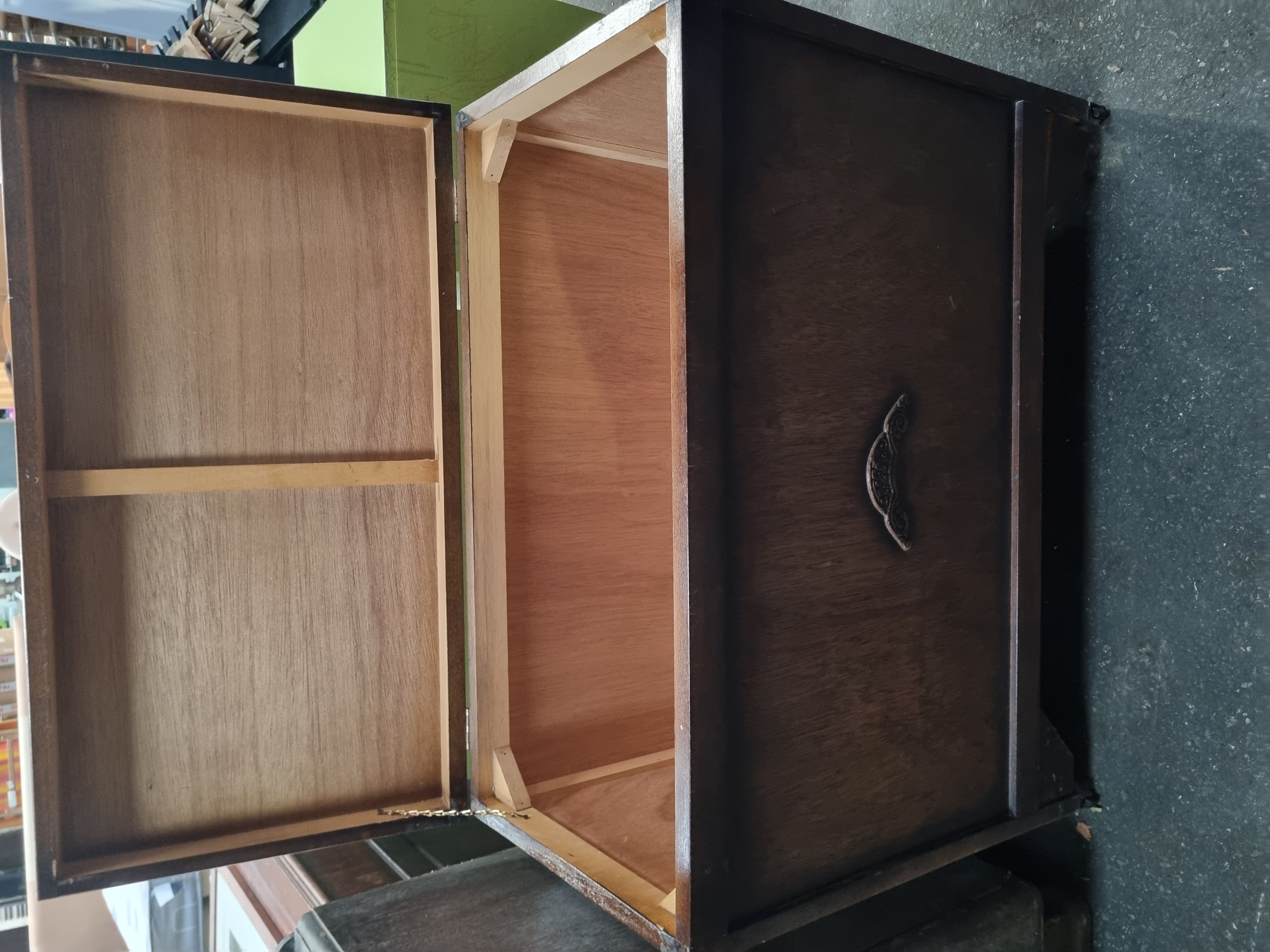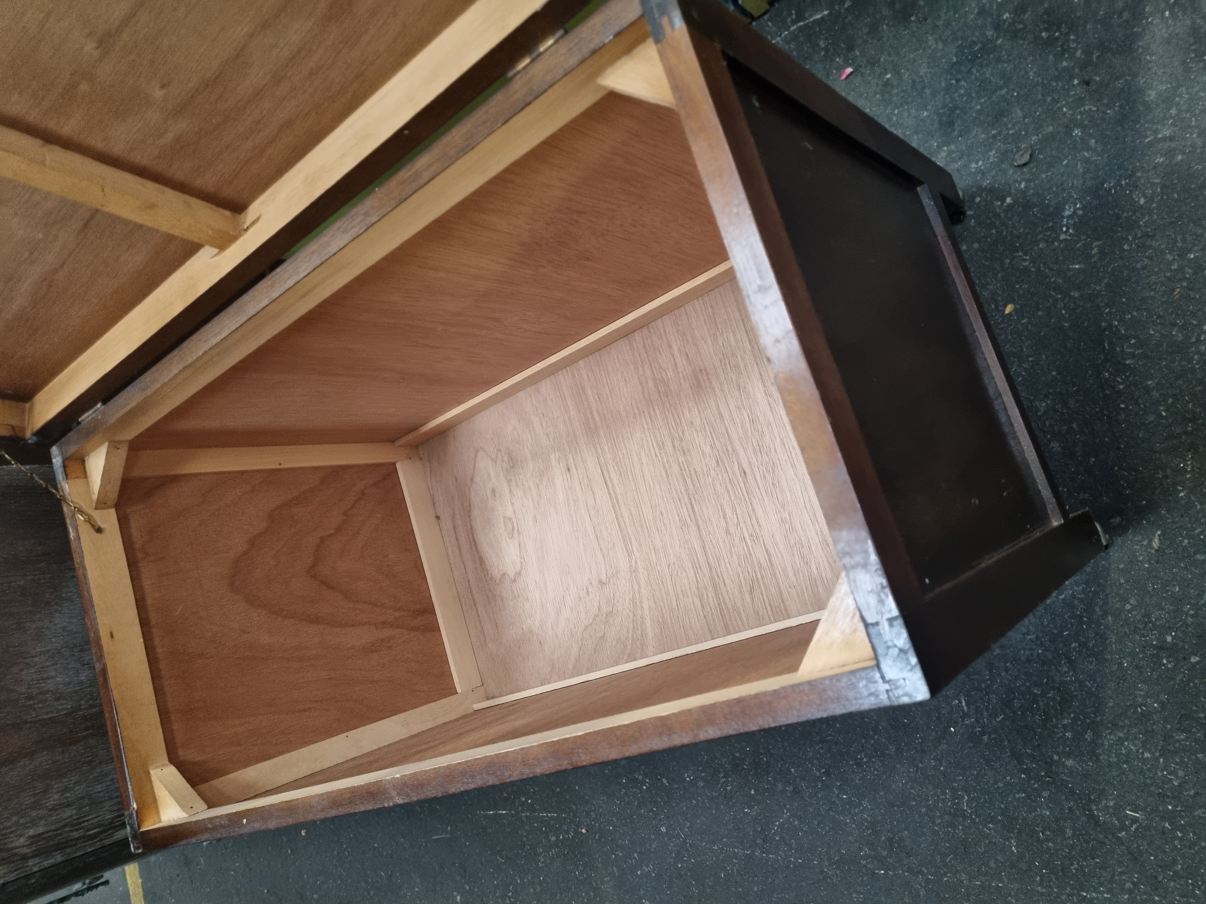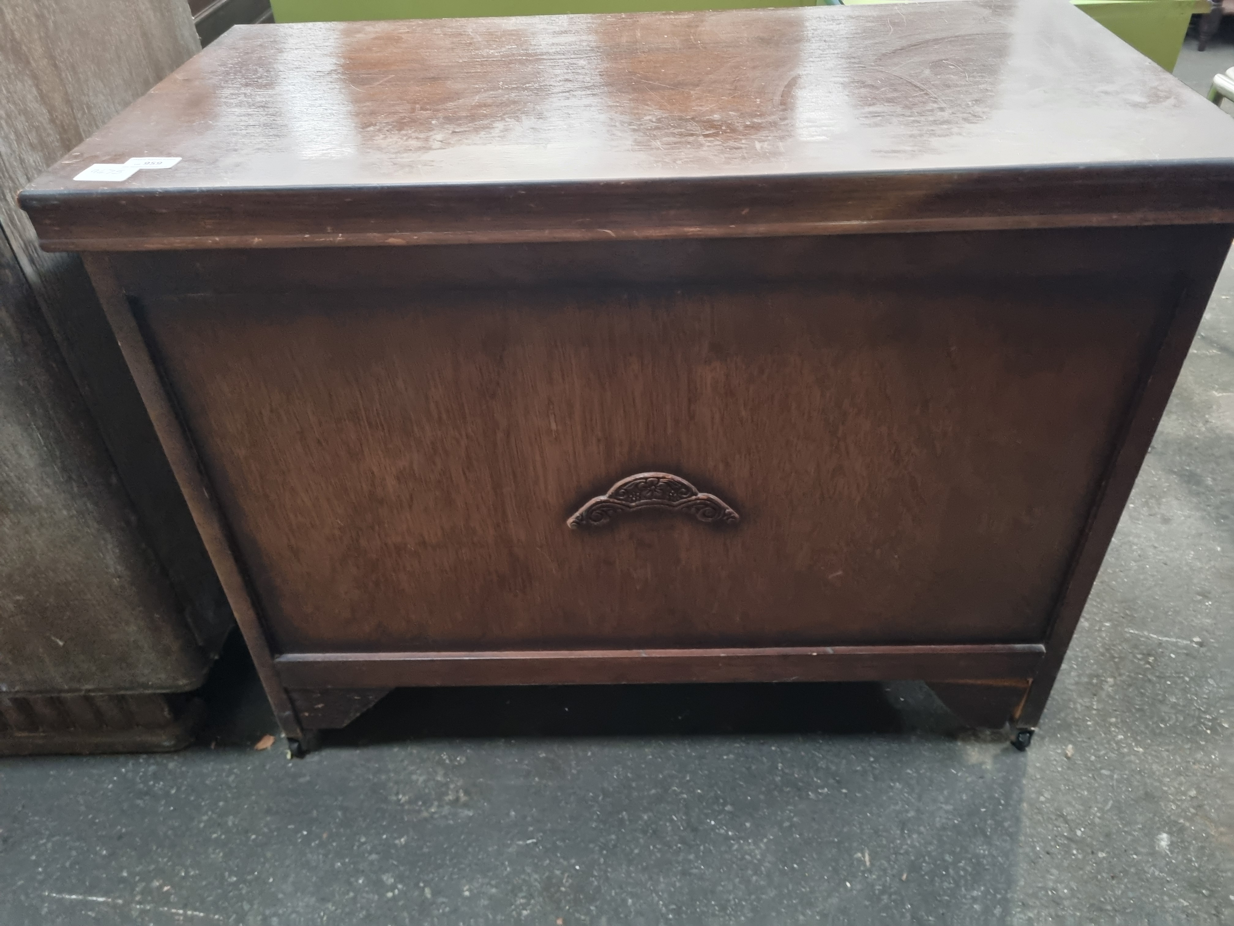 A mid-20th-century storage chest or blanket box of rectangular form. The piece is constructed from a plywood carcass finished in a dark-stained wood veneer with a mahogany effect. The interior is lined with a lighter-toned wood-faced plywood and is reinforced with internal triangular corner blocks at the joints. It features a hinged lid with an overhanging lip, fitted with an internal metal safety chain stay. The front panel is embellished with a single scrolled and foliate cast metal motif. The chest stands on a simple plinth base with bracket-style cutouts at the front. No manufacturer’s marks or stamps are visible on the item.
