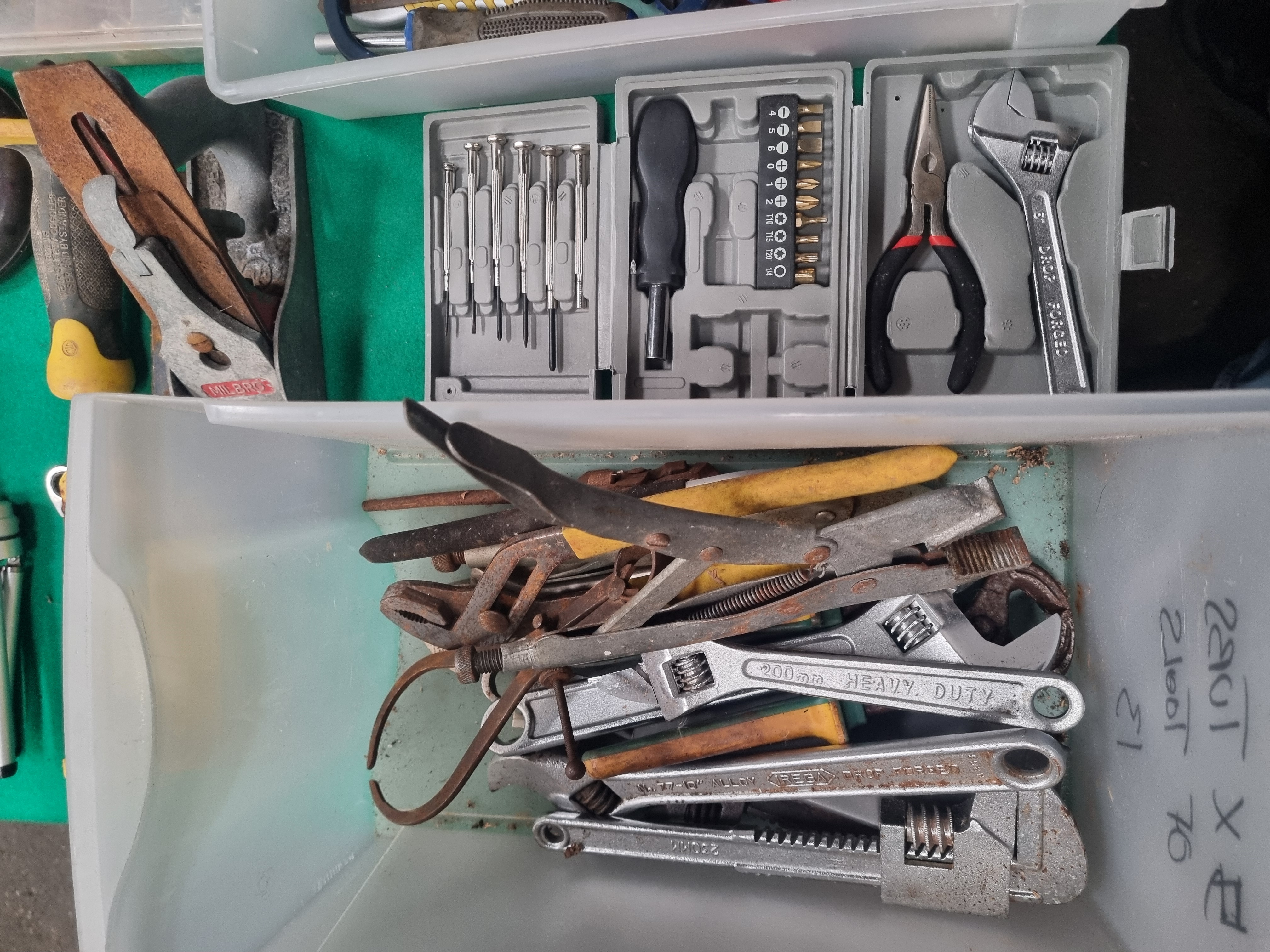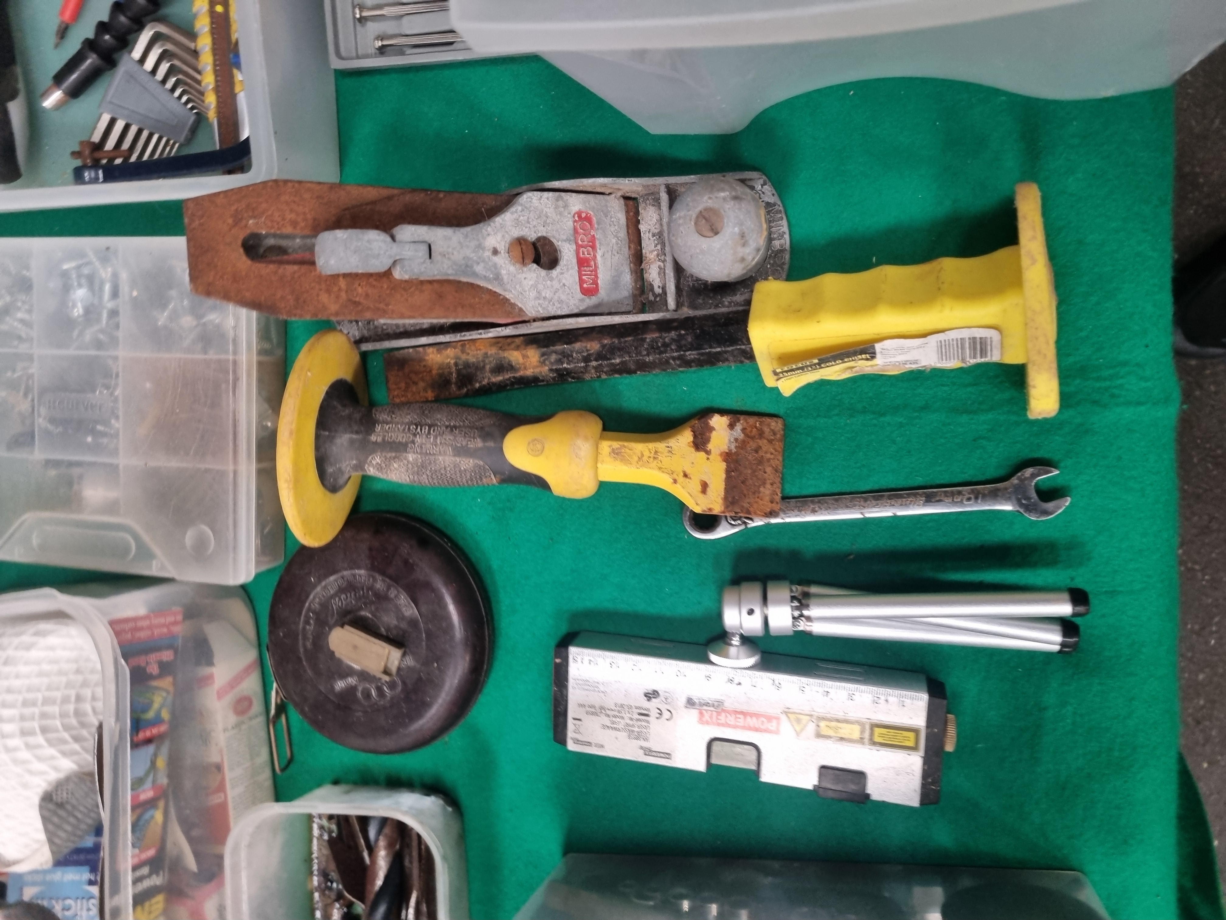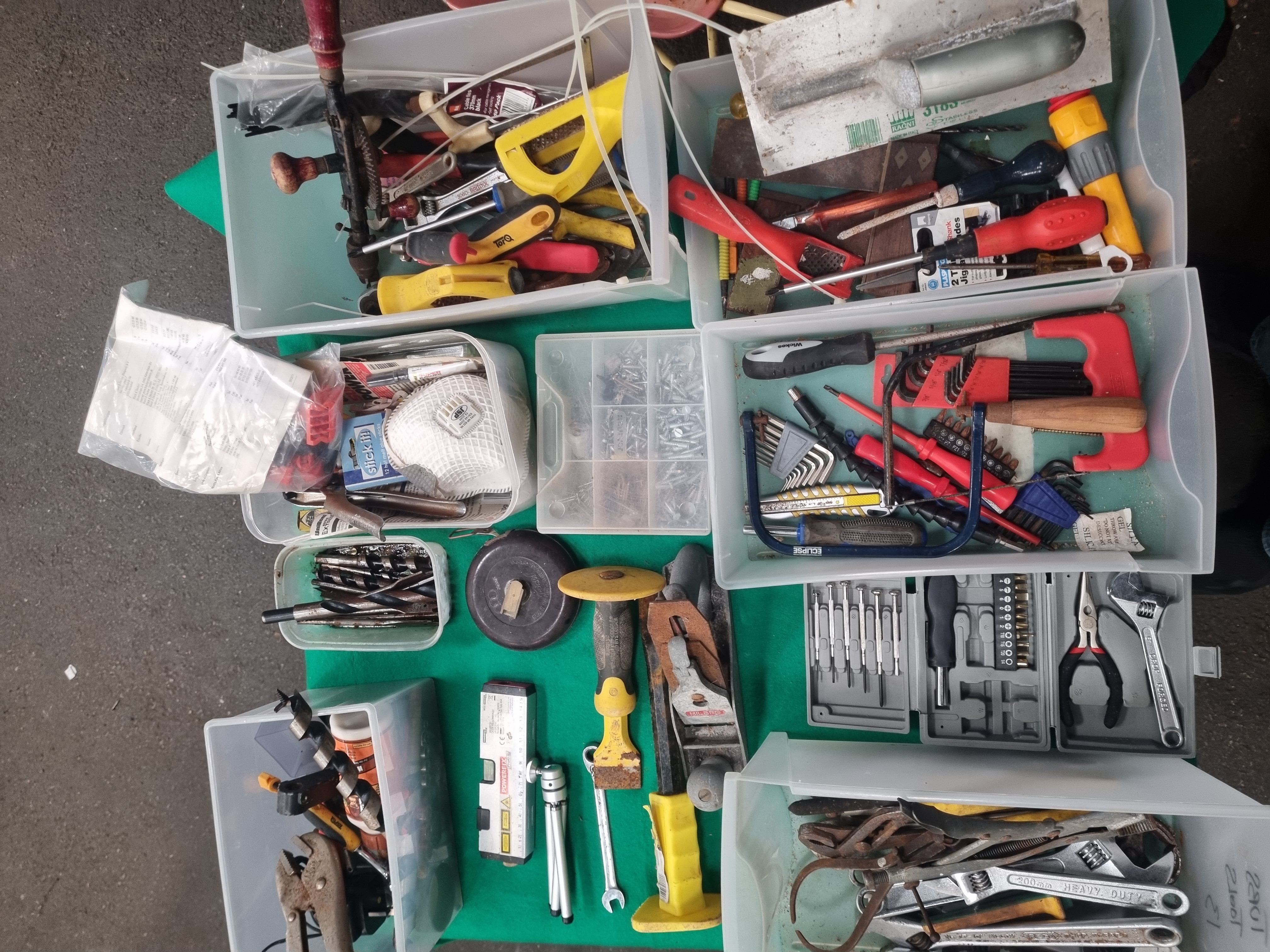A collection of workshop tools and maintenance equipment comprising items for cutting, shaping, fastening, and measuring. The lot includes a Milbro block plane with a red lever cap, a Ragni 318S plastering trowel, and an Eclipse hacksaw frame. Fastening tools feature multiple adjustable wrenches including a 10-inch No. 77-10 Rega drop-forged wrench, a 200mm heavy-duty wrench, and a Britool chrome spanner. The assortment contains various wood chisels, a 35mm heavy-duty cold chisel, and a large variety of screwdrivers with handles marked Wickes and Torq. Measuring and layout equipment includes a Powerfix digital laser level with a silver-tone mini tripod and a vintage-style circular tape measure in a dark brown casing embossed with a three-ring logo and Made in the People’s Republic of China. Additional items include various pliers, locking grips, hex key sets in plastic holders, a precision screwdriver bit set, and a JSP brand dust mask. The tools are constructed from a mix of drop-forged steel, chrome-vanadium alloys, wood, and modern plastics.