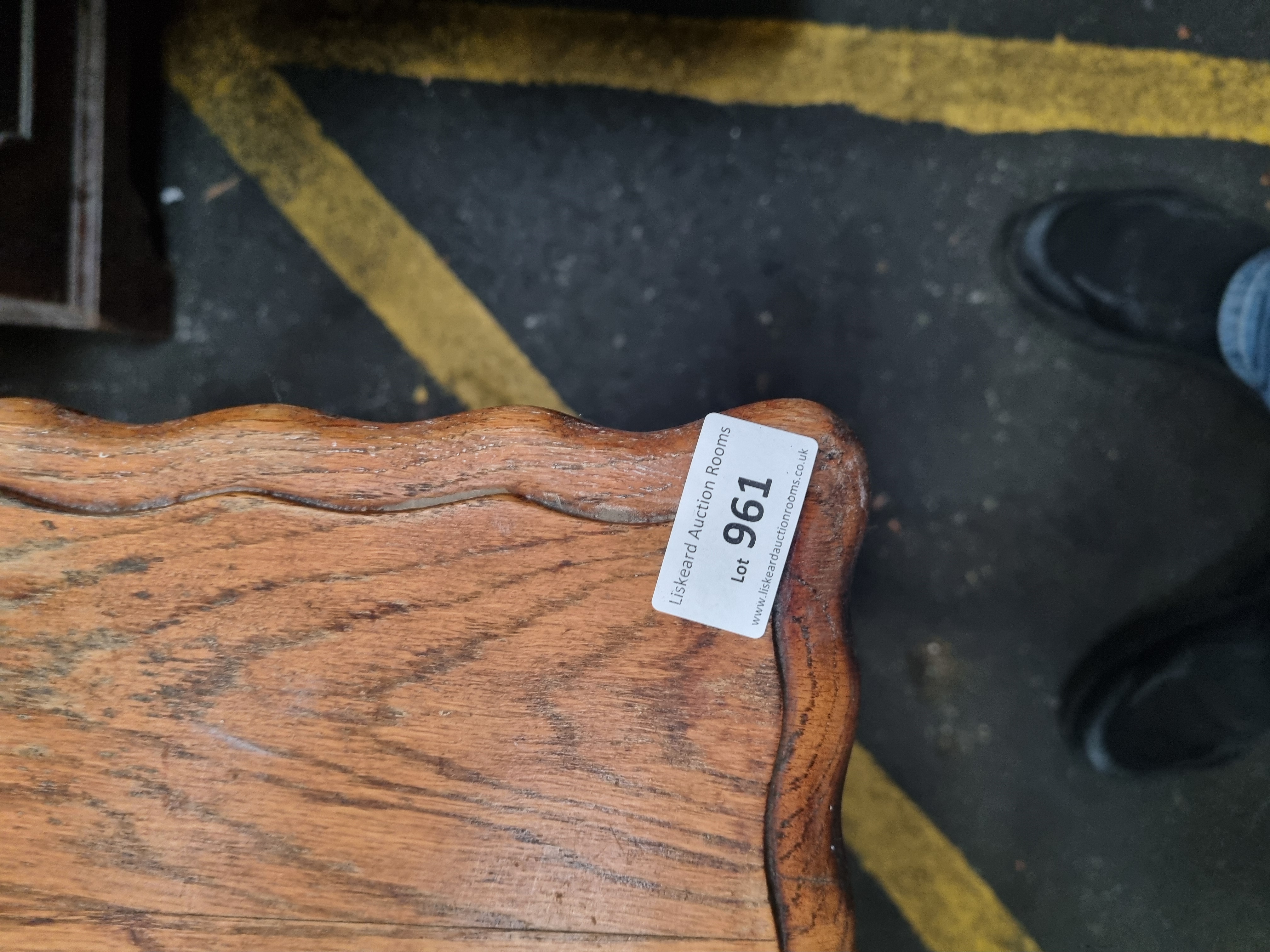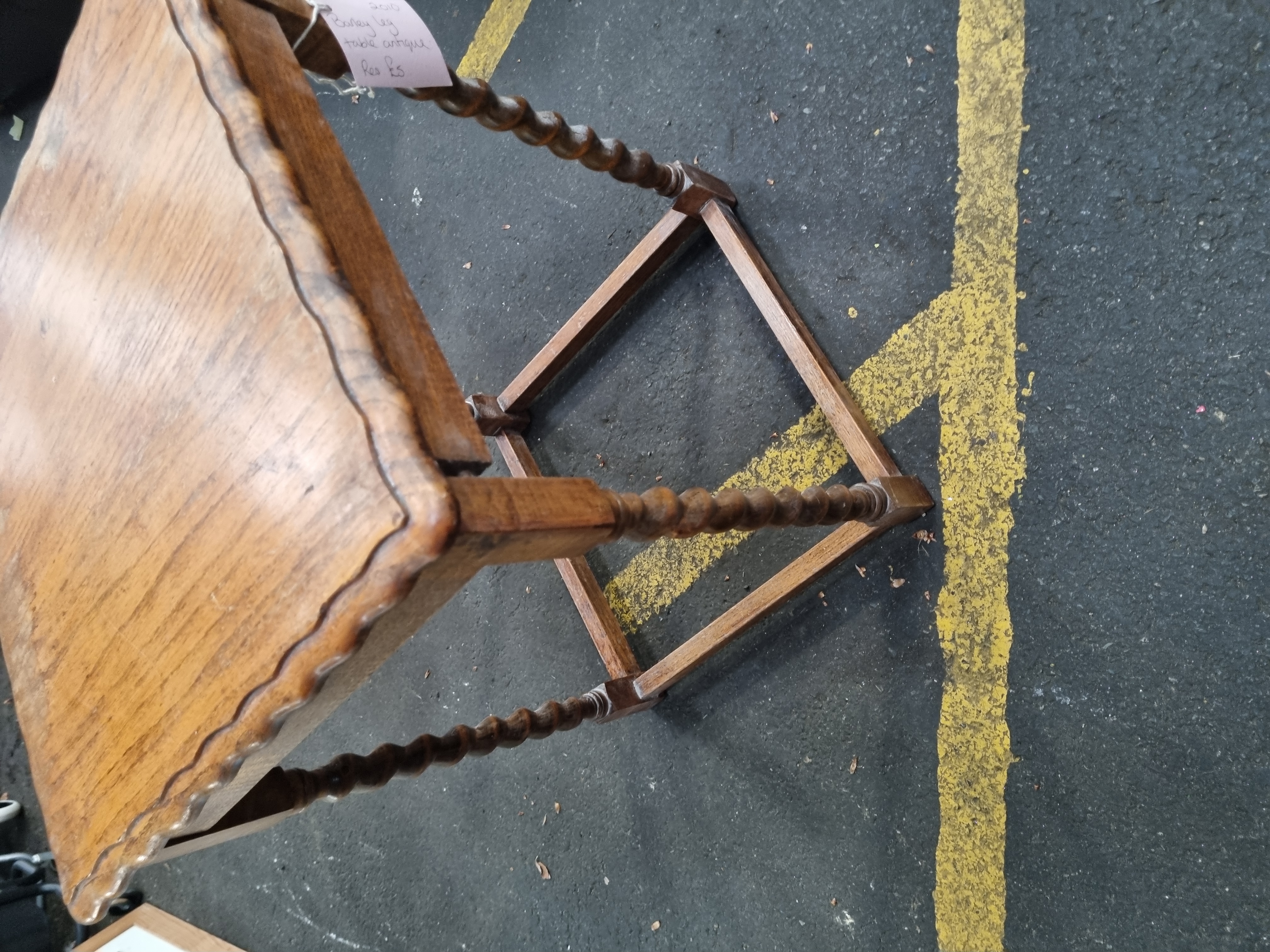 This oak side table is designed in the Jacobean Revival style, likely dating from the early 20th century. It features a rectangular solid oak top with a decoratively scalloped pie-crust edge. The base is constructed with four barley-twist turned legs, which are joined by a low-set square perimeter stretcher for stability. The wood has a medium-toned finish. The table currently bears a white adhesive lot label from Liskeard Auction Rooms and a handwritten pink vendor tag. No maker’s marks or stamps are visible on the piece.