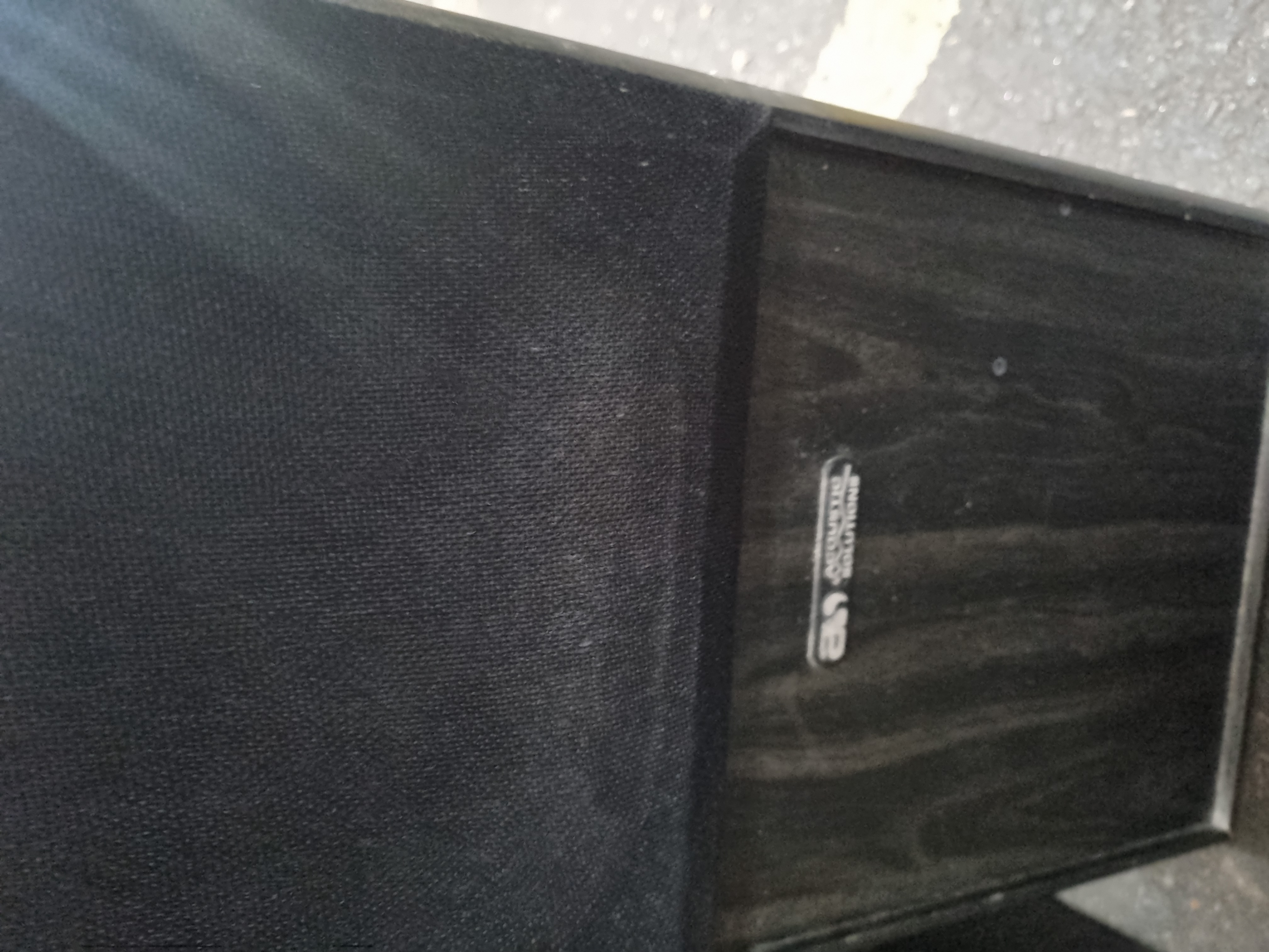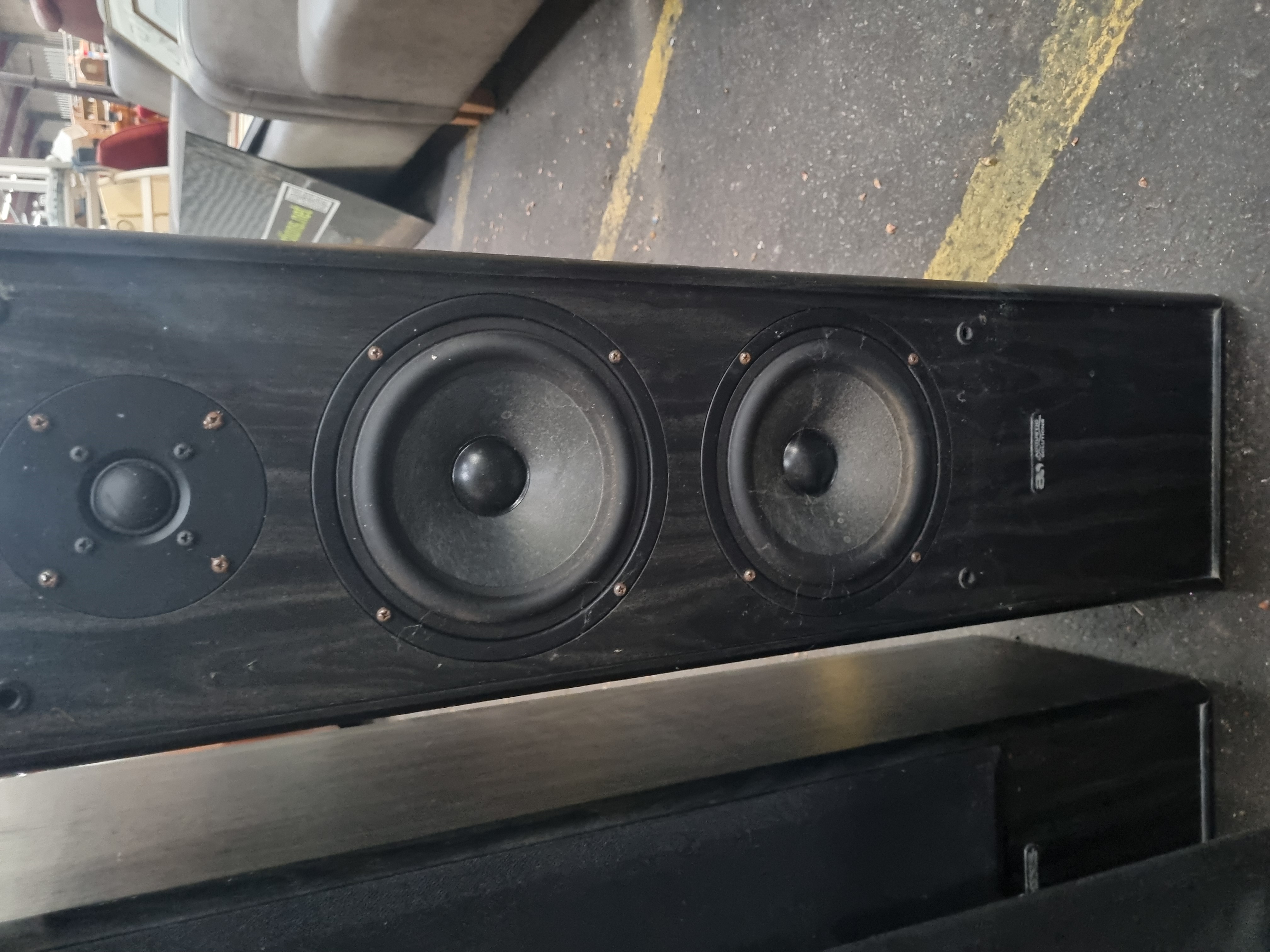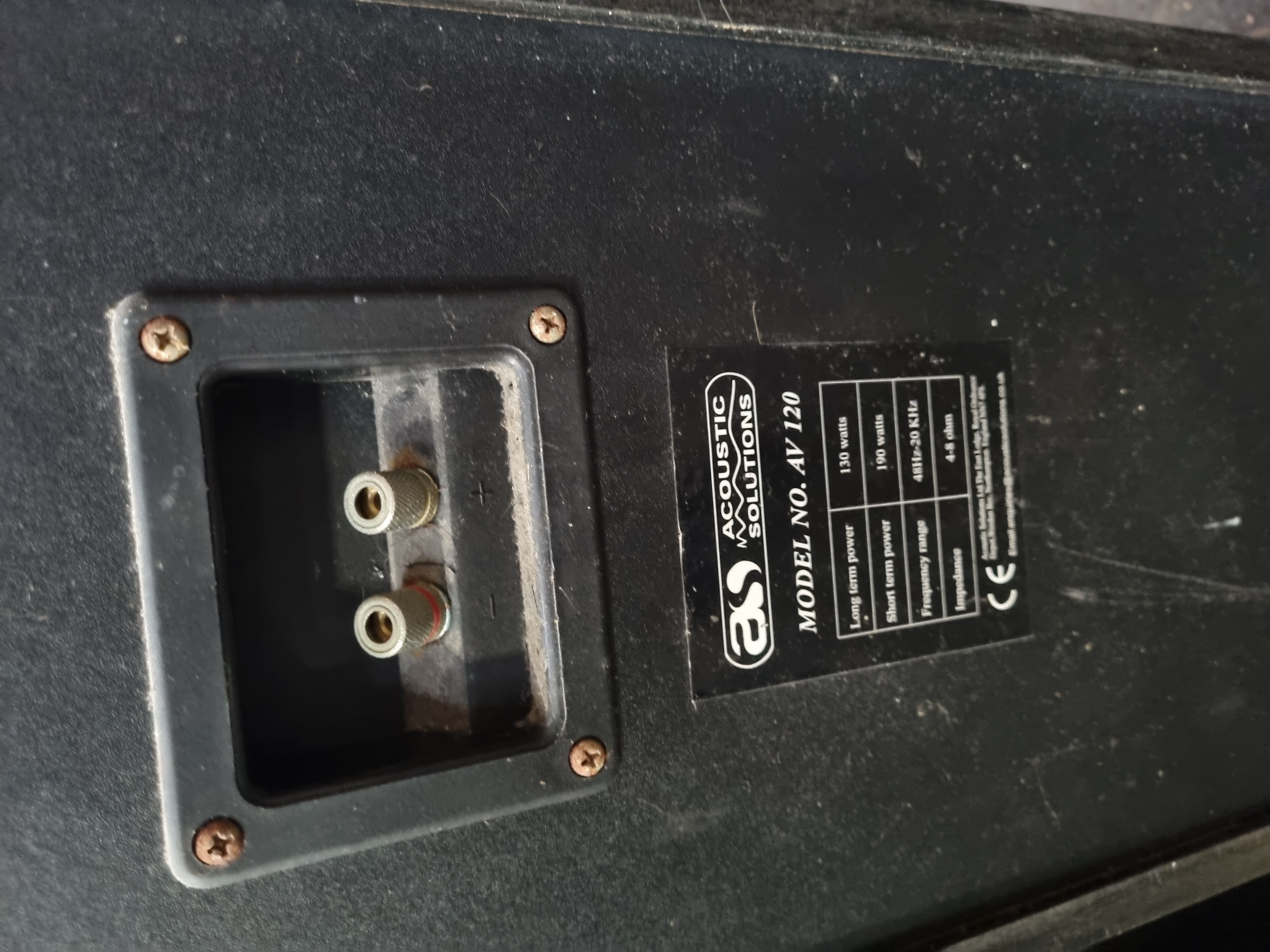 A pair of Acoustic Solutions AV 120 floor-standing loudspeakers. Each cabinet is finished in a black wood-grain effect vinyl wrap and houses a three-driver configuration consisting of a single tweeter and two mid-bass drivers. The units feature removable black fabric grilles and are equipped with a pair of gold-plated binding post terminals located in a recessed panel on the rear for connectivity. According to the manufacturer’s label, technical specifications include a long term power handling of 130 watts, short term power of 190 watts, a frequency range of 48Hz-20 KHz, and an impedance of 4-8 ohms. A lot tag from Liskeard Auction Rooms is present on one cabinet. No additional cables or accessories are included.