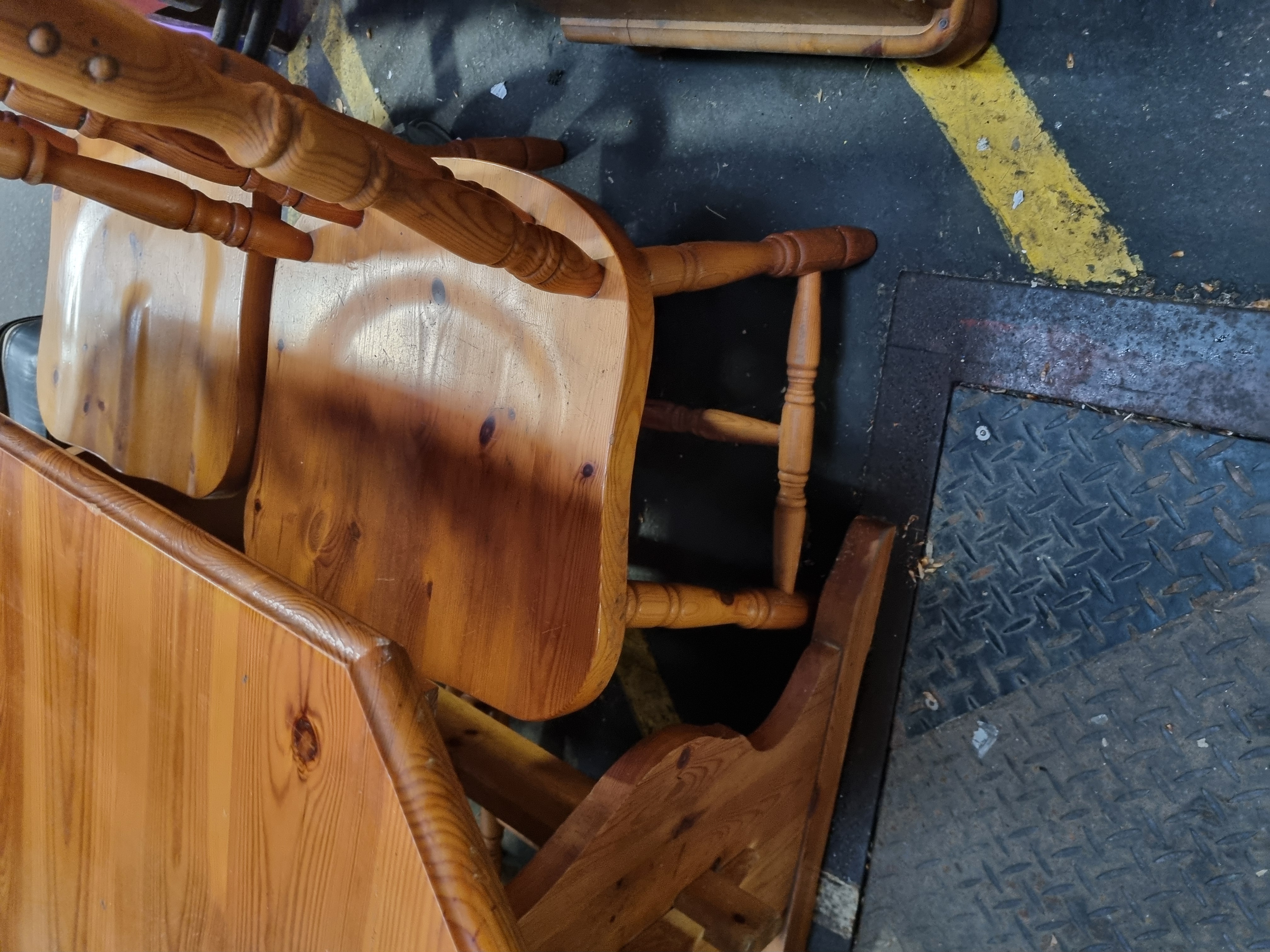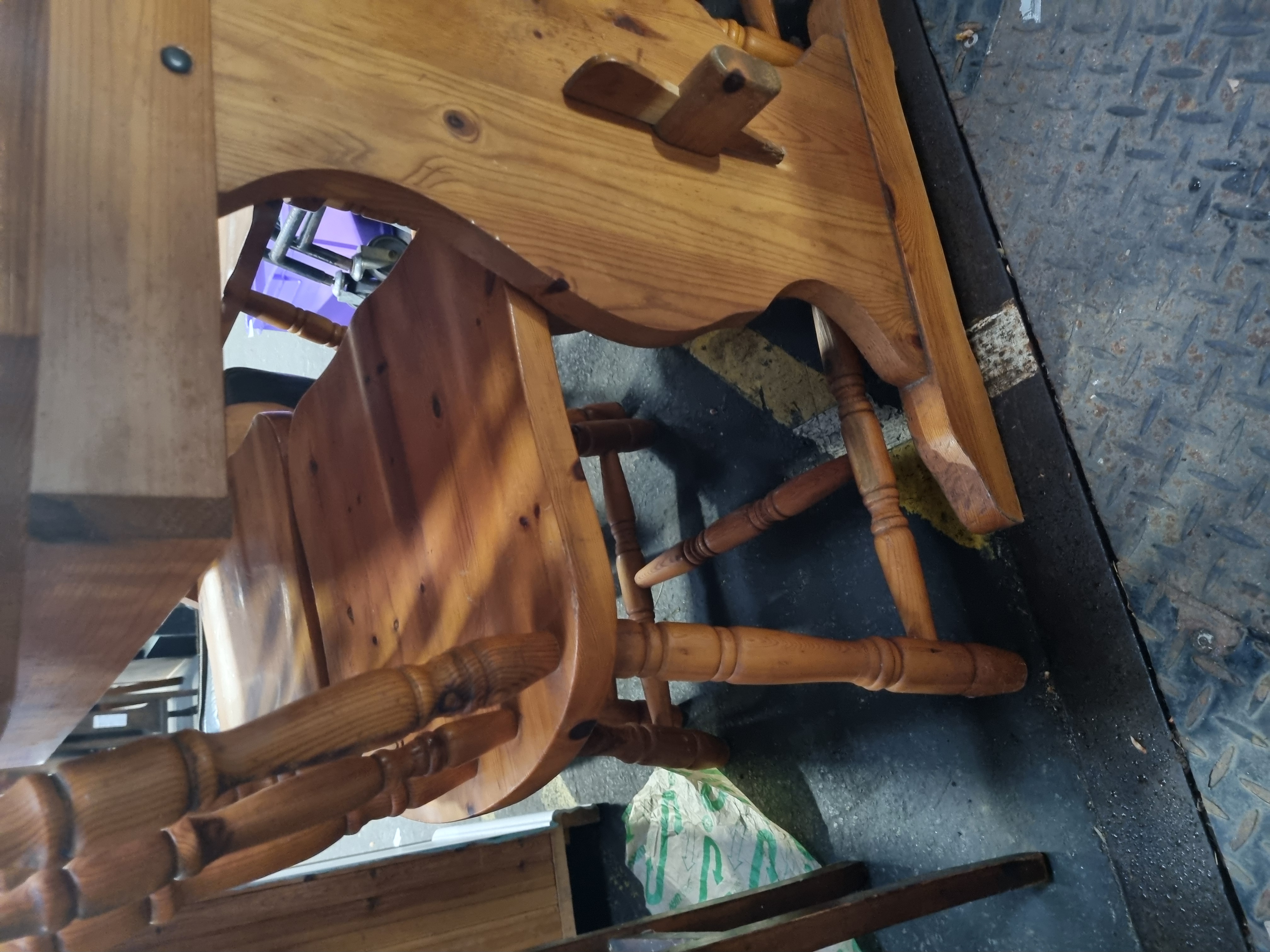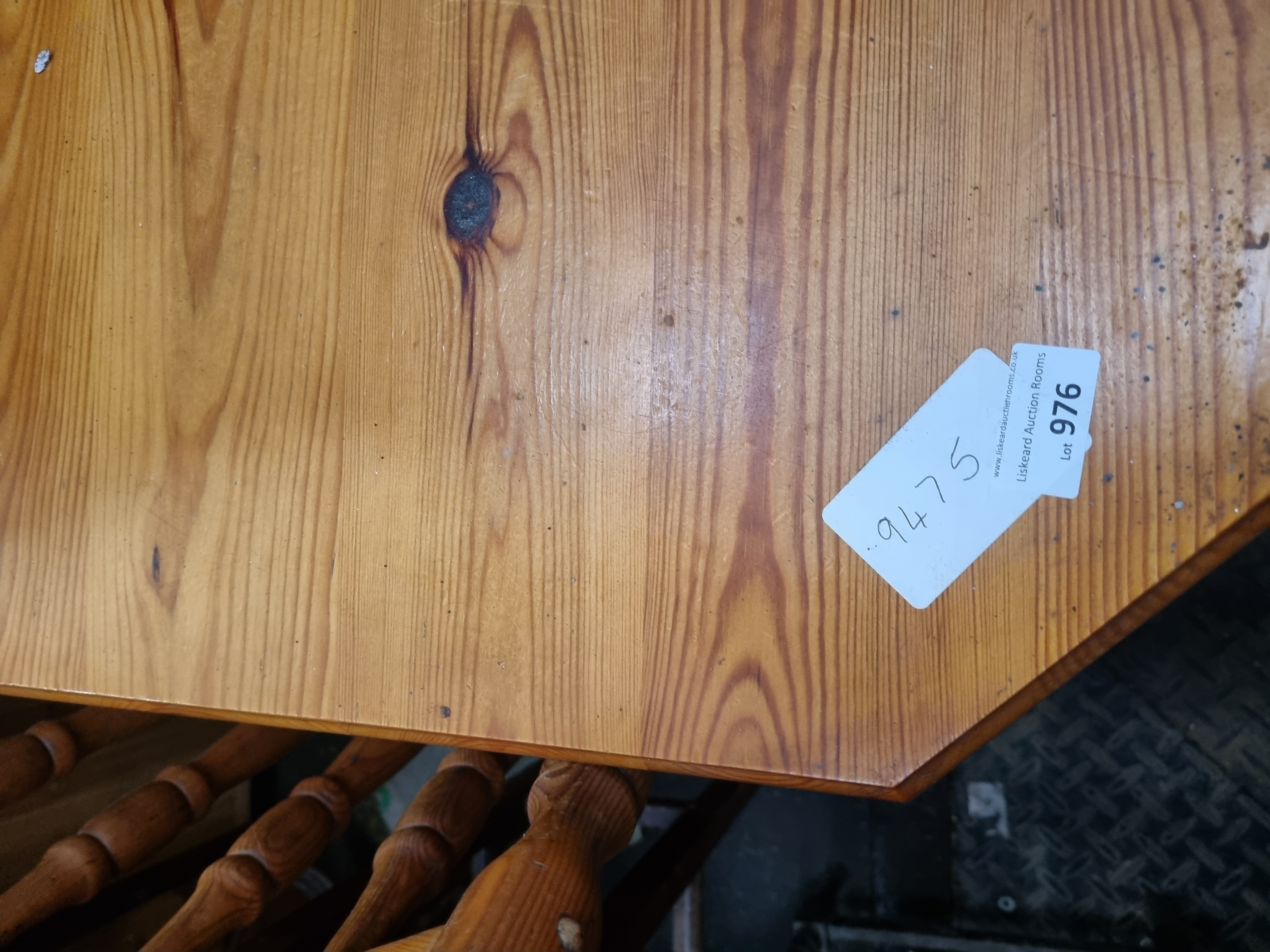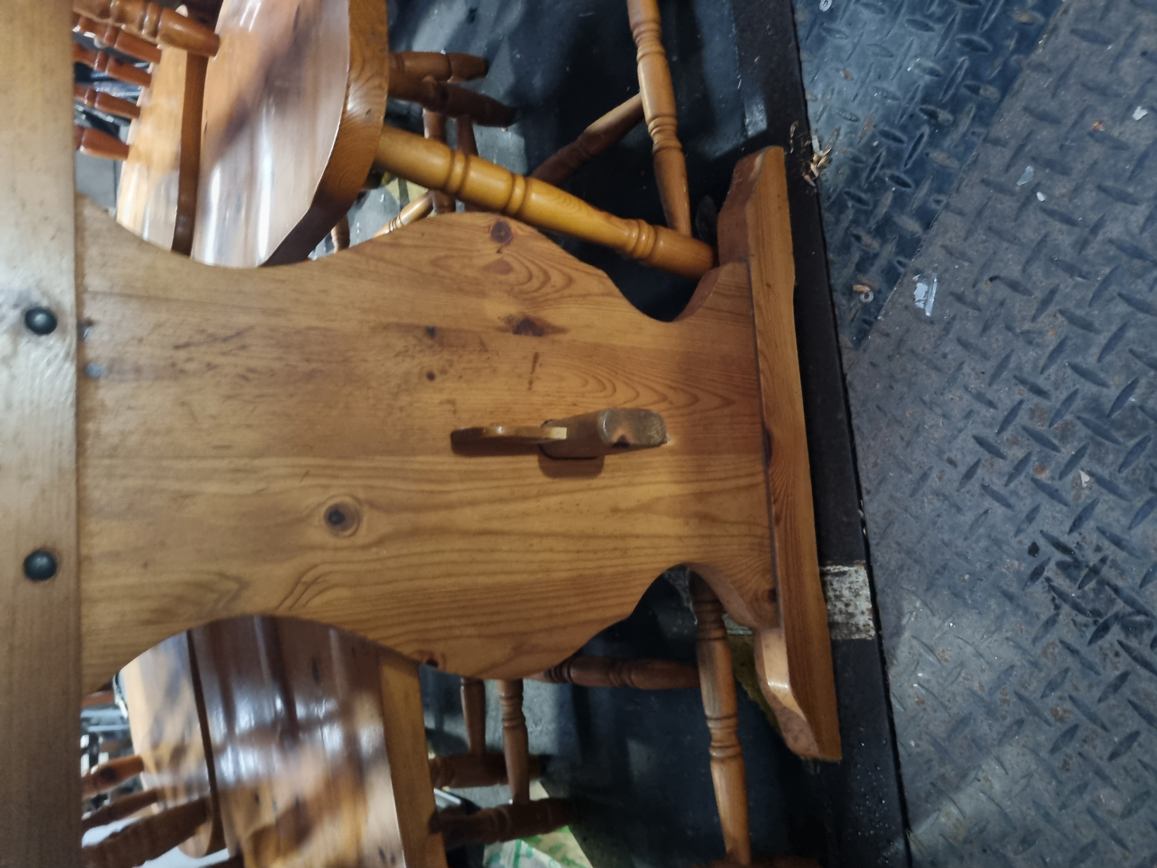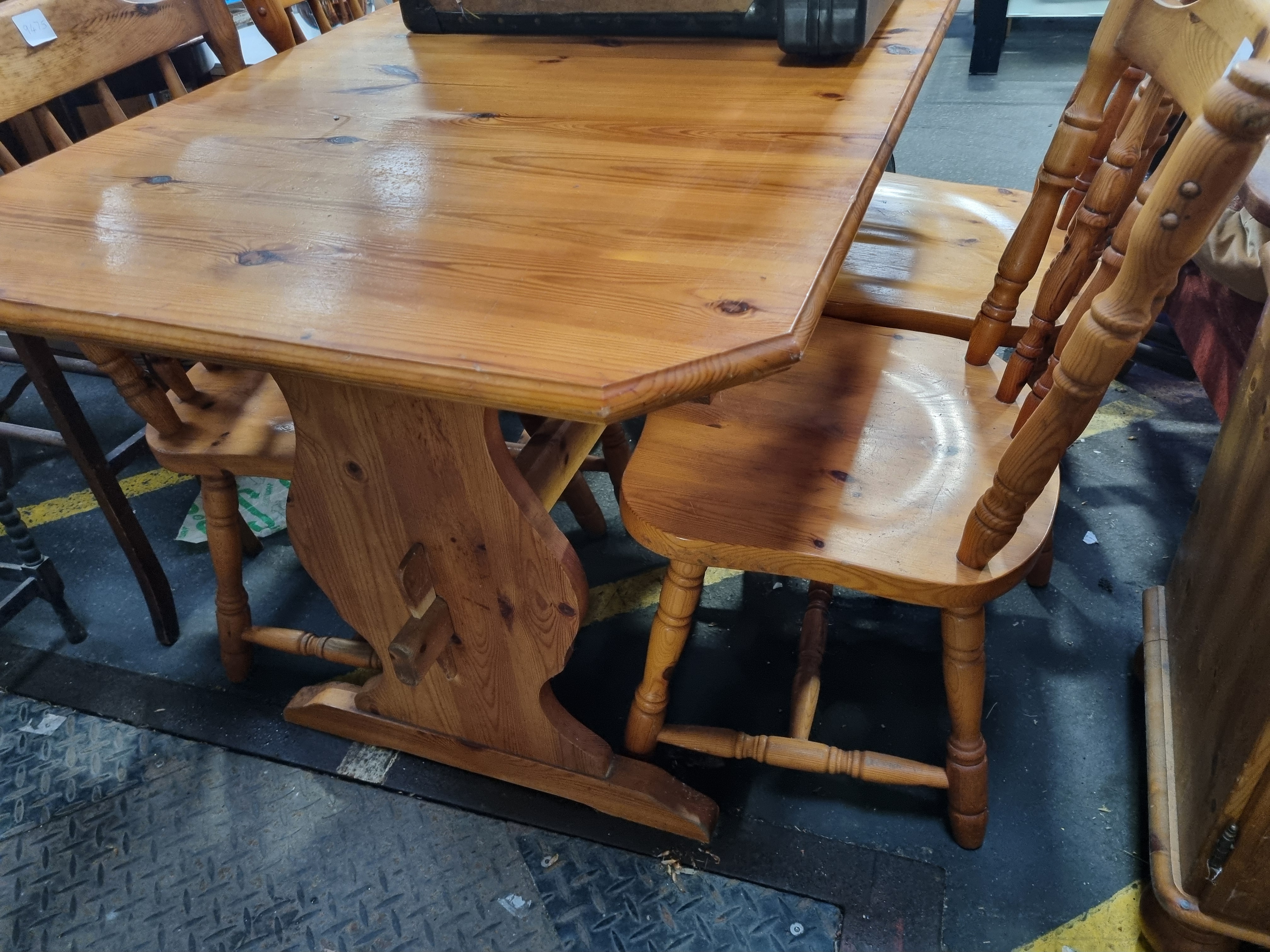 This dining suite is constructed from solid pine and finished with a honey-coloured wax, characteristic of traditional country-style furniture from the 1970s or 1980s. The table features a fixed, solid pine top with clipped corners creating an octagonal form. It is supported by a sturdy trestle-style base with two shaped upright supports connected by a central stretcher, which is secured using traditional through-tenon and wooden wedge-peg construction. The matching spindle-back chairs feature shaped solid pine seats, turned outer back posts with central turned spindles, and turned legs joined by H-shaped stretchers. The item bears auction lot tags from Liskeard Auction Rooms.