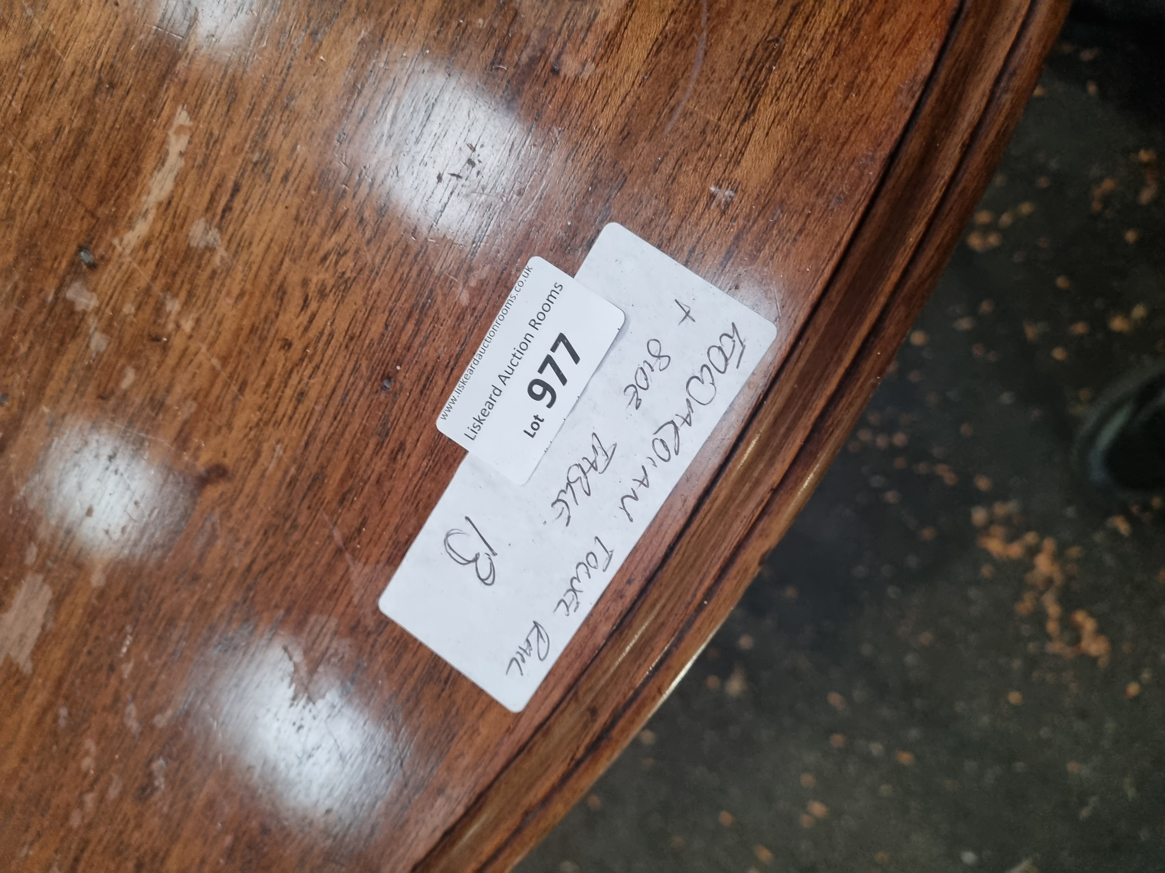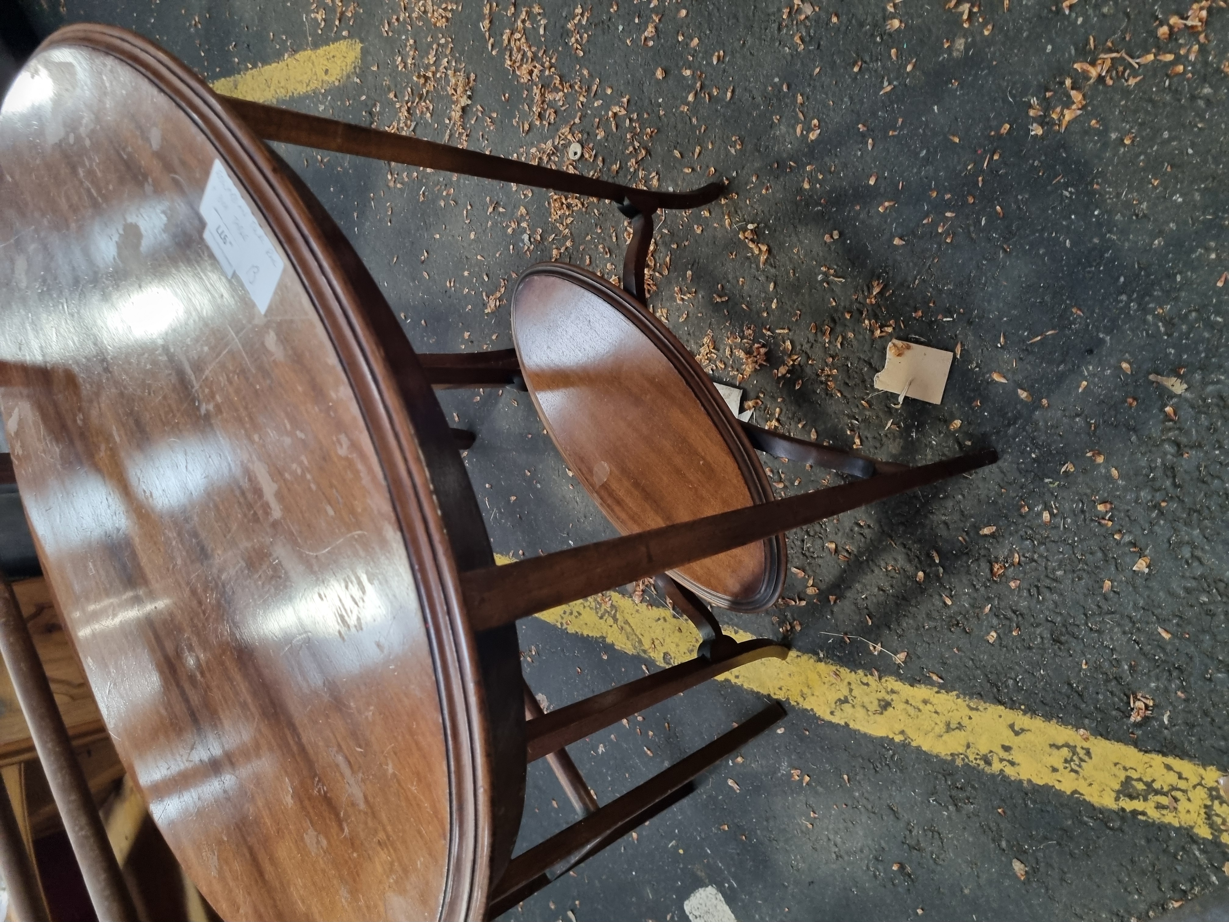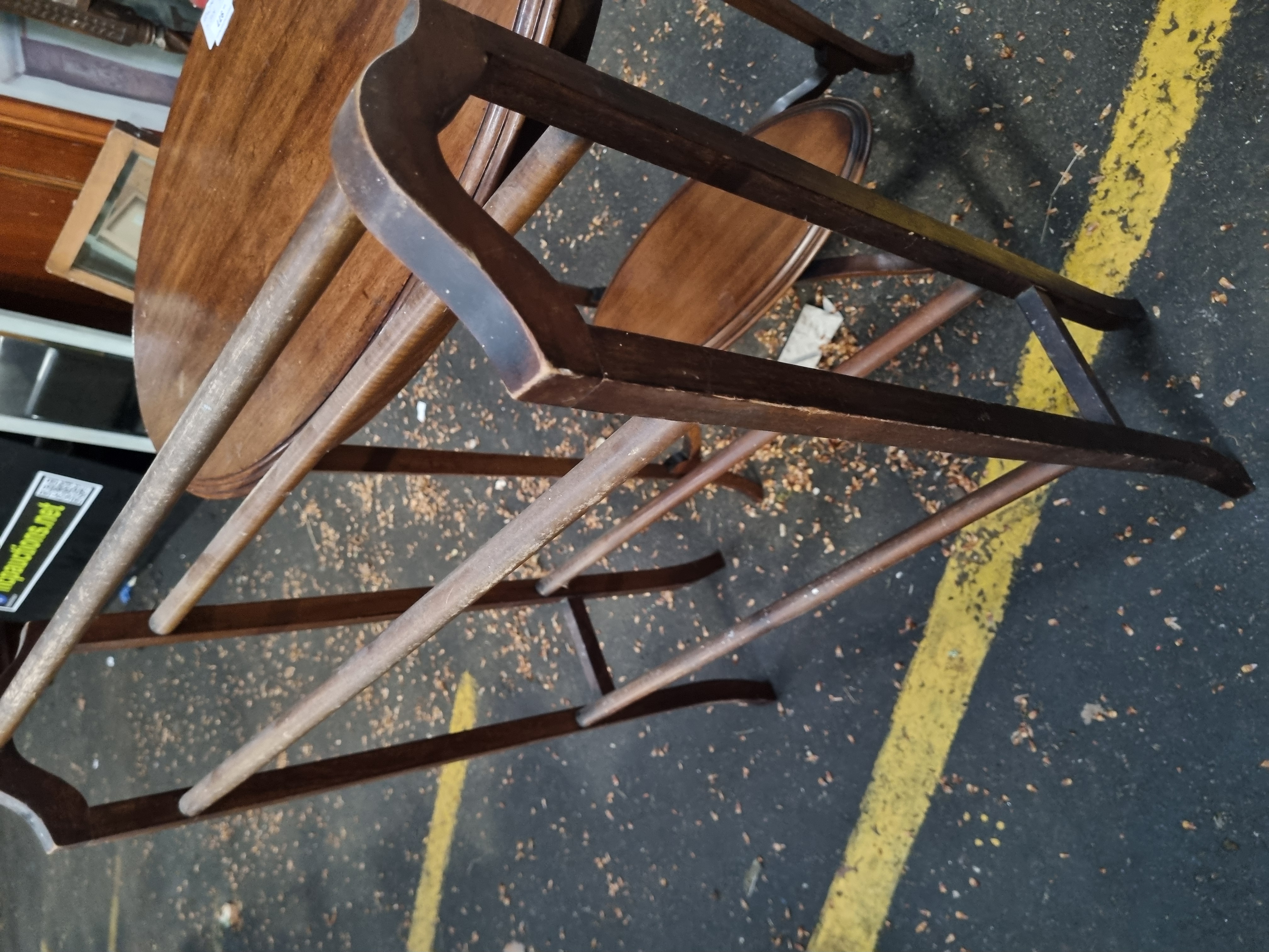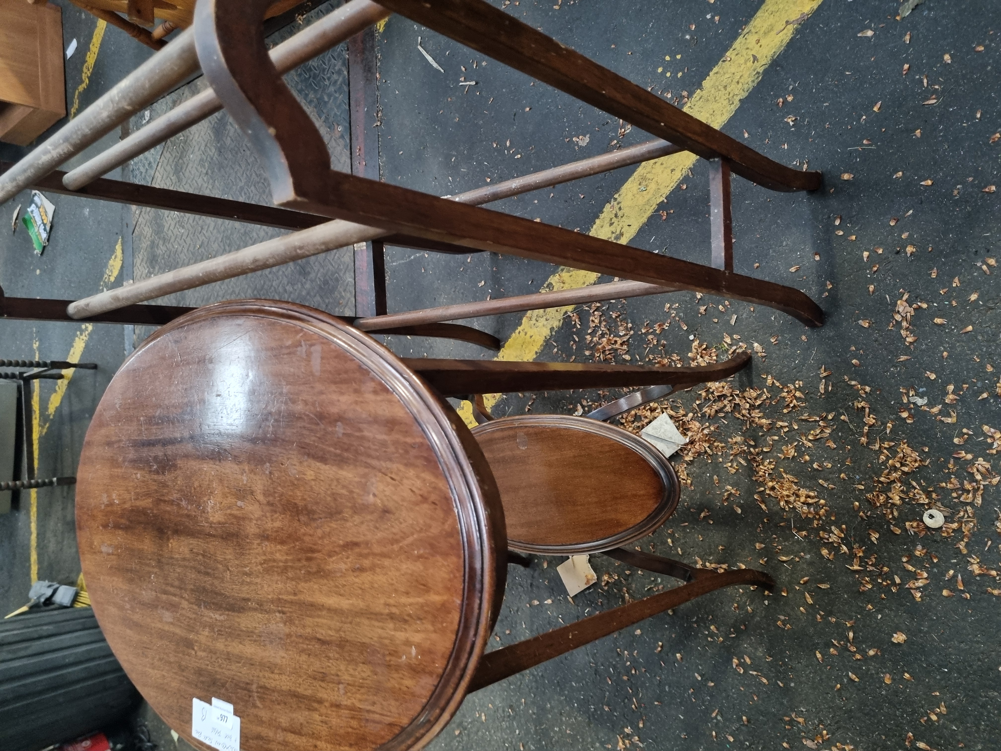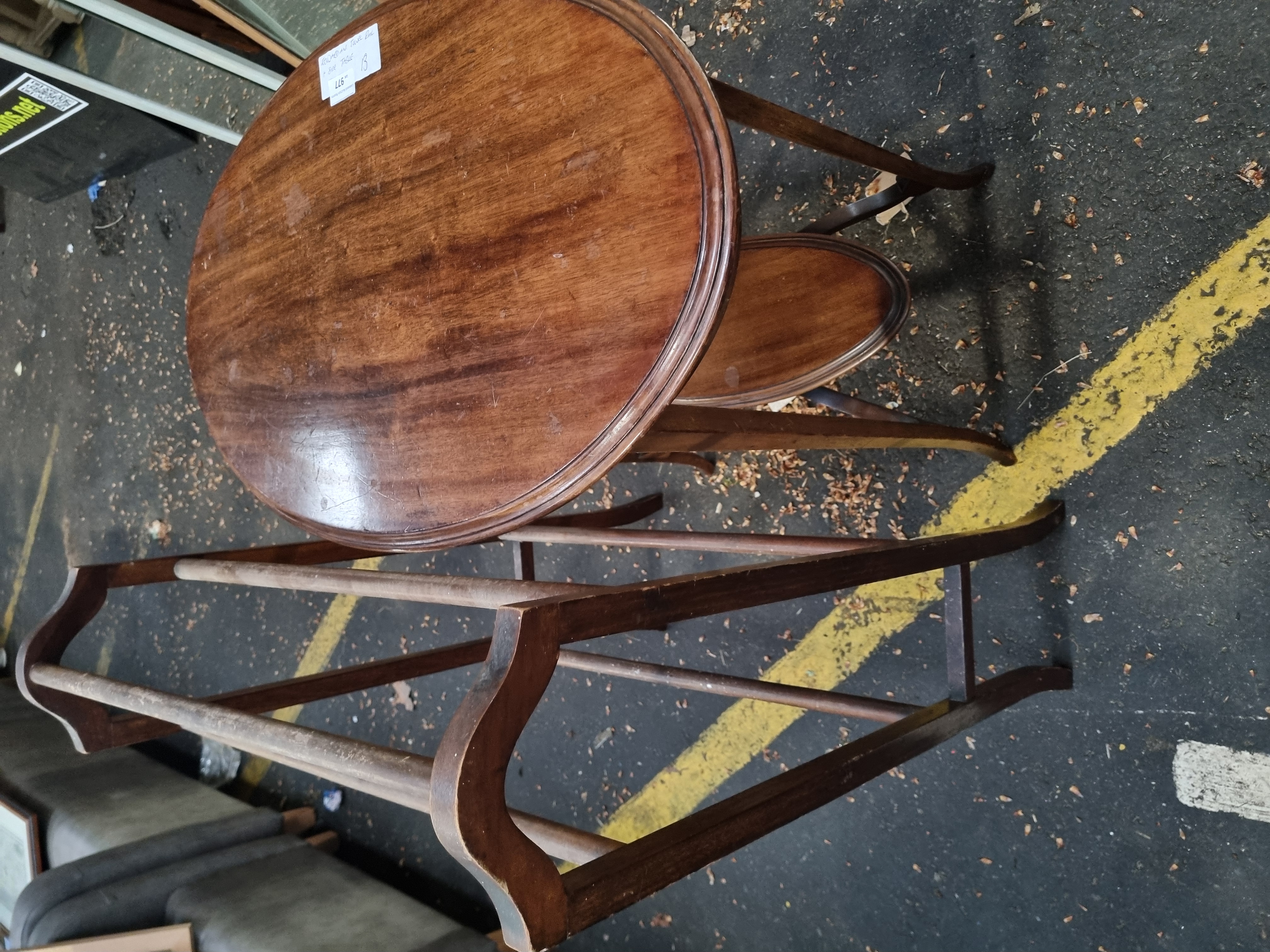 This lot consists of an Edwardian-style mahogany finished occasional side table and a wooden floor-standing towel rail. The side table features a circular top with a moulded edge, supported by three slender, tapering square-section legs. These legs are braced by a smaller, matching circular under-shelf positioned at mid-height. The towel rail is of traditional wooden construction, featuring four horizontal rails supported by two end-frames with shaped, curved top rails and upright supports. A white adhesive auction label from Liskeard Auction Rooms is present on the table top, identifying the lot as number 977 and describing the items as an Edwardian towel rail and side table.