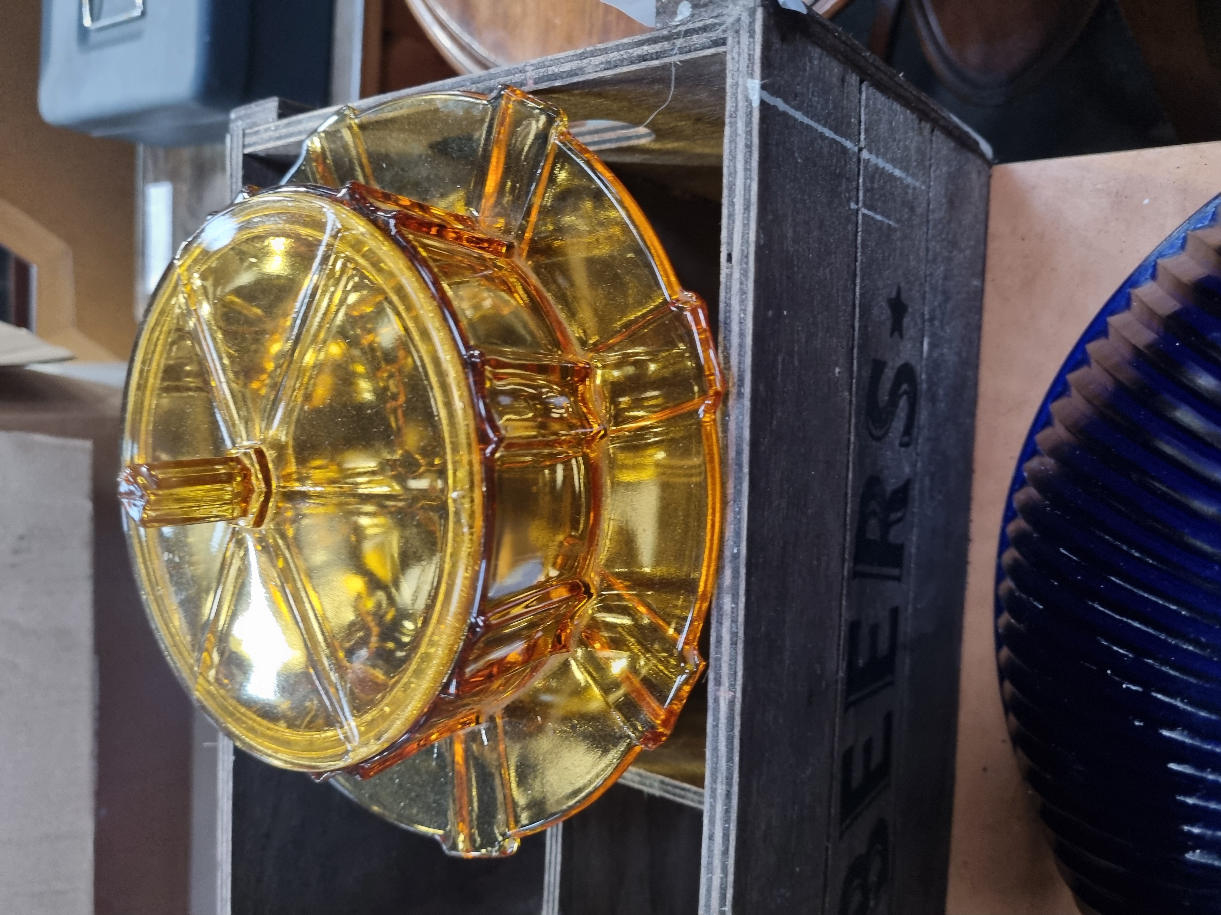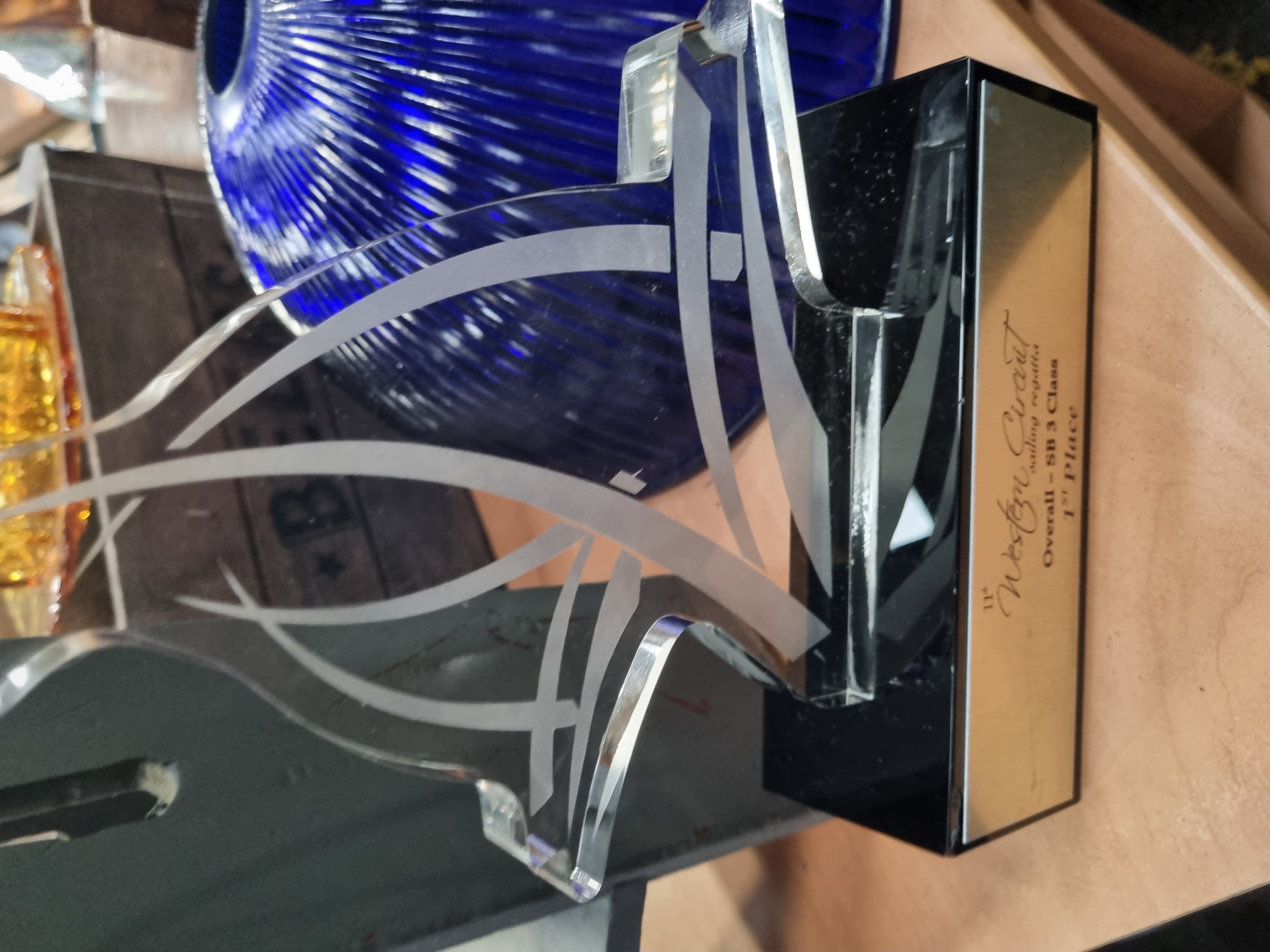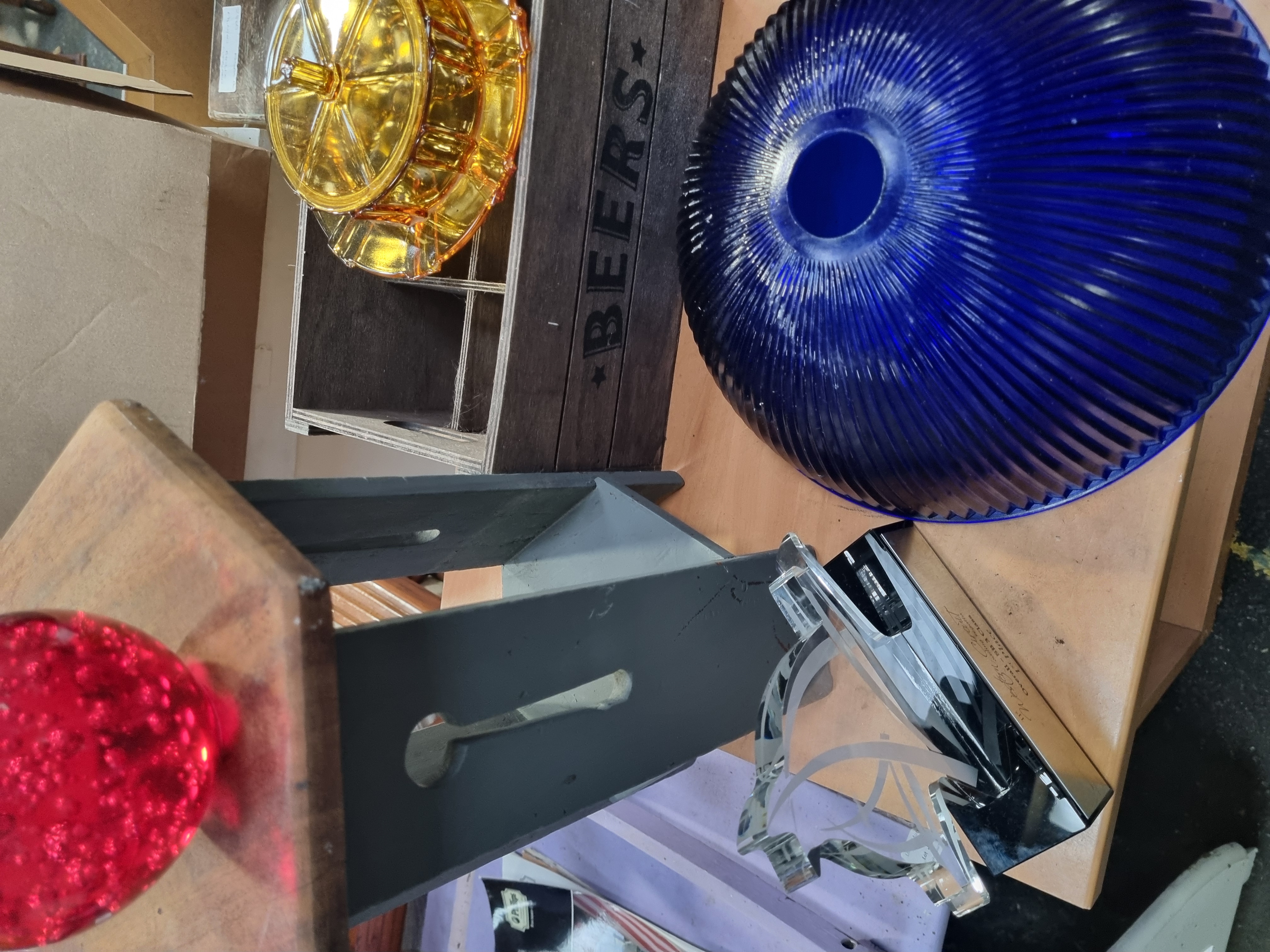 An assortment of decorative glass and commemorative items. The collection includes a large cobalt blue glass shade or bowl featuring dense radial ribbing extending from a central aperture. Also present is a pressed amber glass lidded dish with a scalloped edge on the base and a radial starburst pattern on the lid, which is topped with a central finial. The lot includes a red glass spherical paperweight with a controlled-bubble (bullicante) internal pattern, mounted on a tiered wooden and grey-painted display stand. A commemorative trophy is included, consisting of an etched clear acrylic or glass plaque on a black rectangular base with a silver-tone plaque inscribed: 11th Western Circuit sailing regatta, Overall – SB 3 Class, 1st Place. These items are accompanied by a dark-stained wooden storage crate branded with the text BEERS flanked by two five-pointed stars. The crate carries a Liskeard Auction Rooms label for Lot 979.