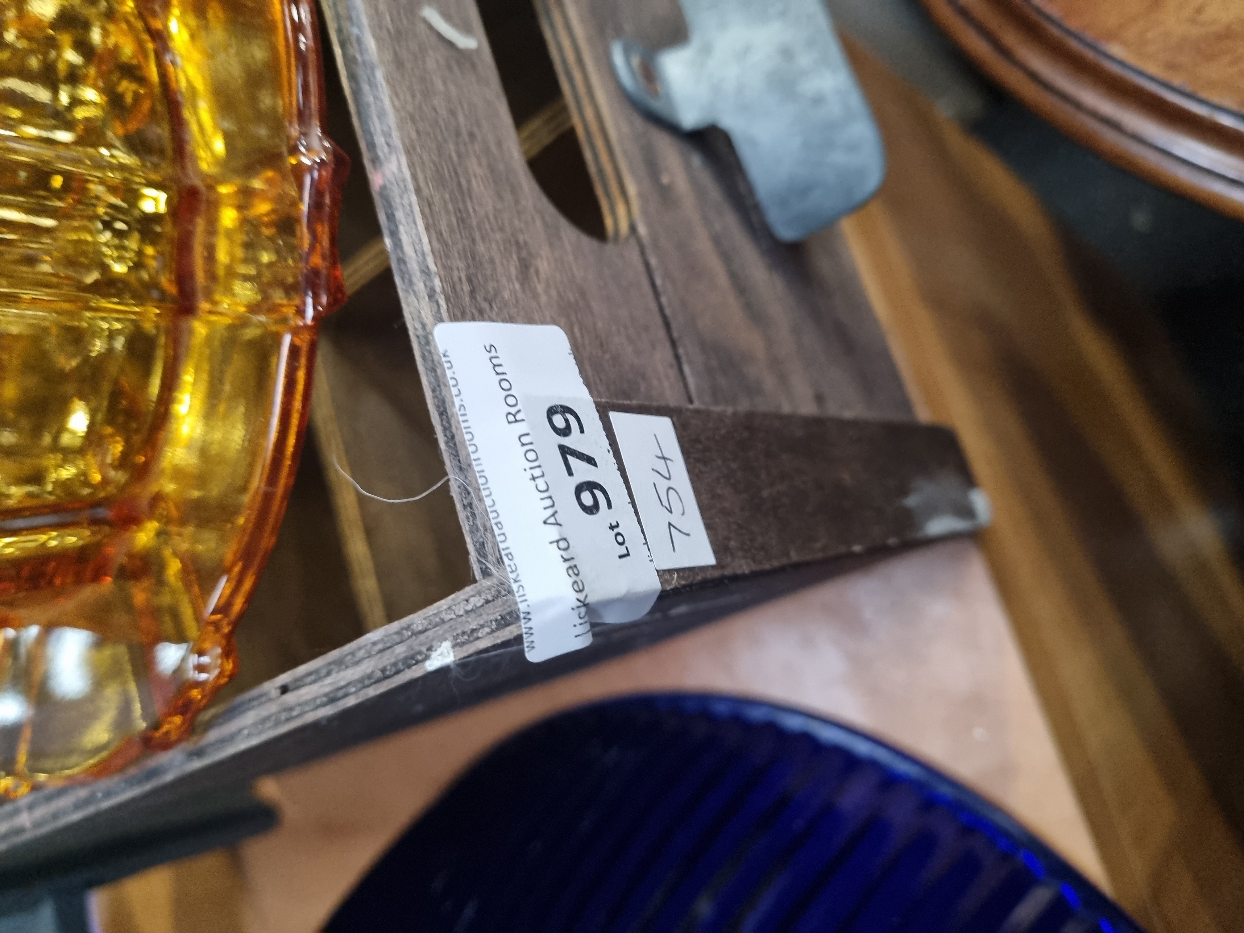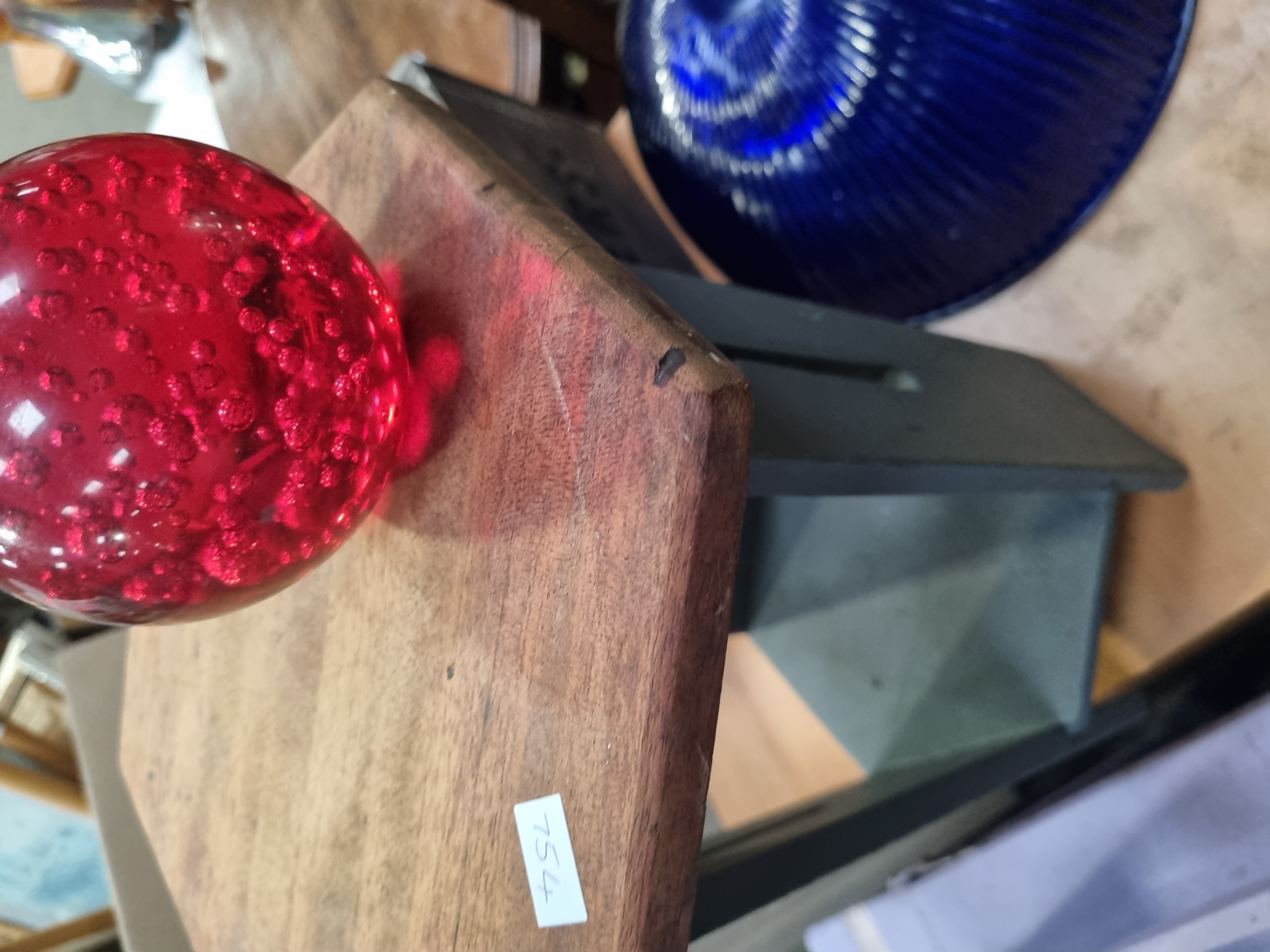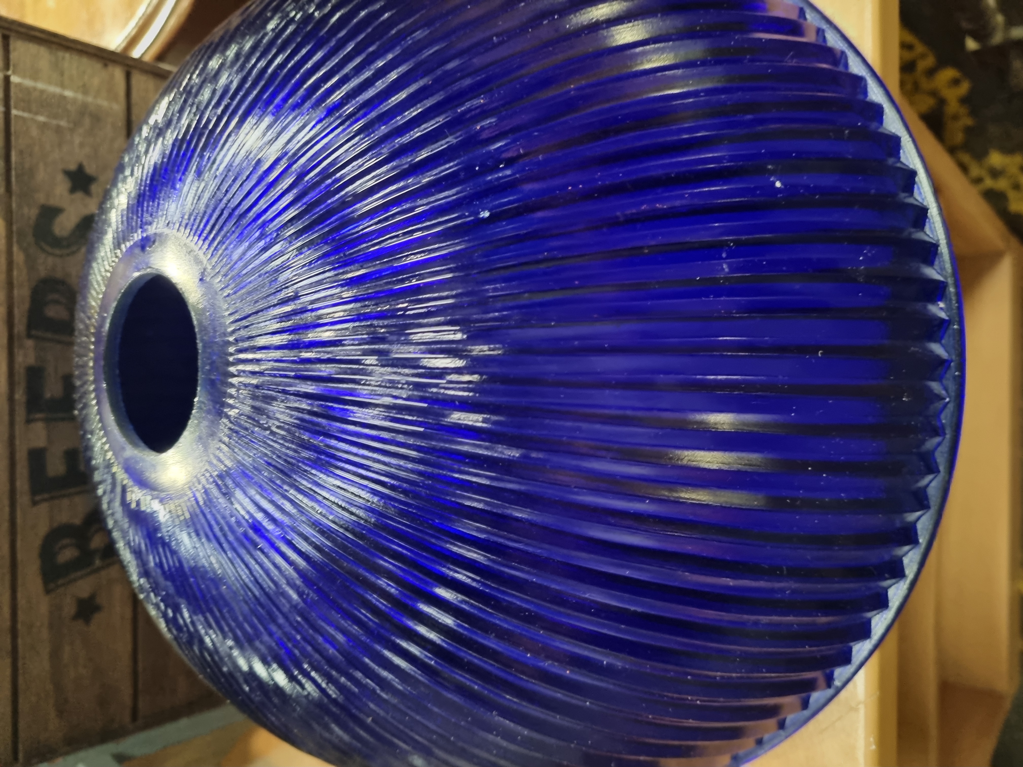 An assortment of decorative glass and commemorative items. The collection includes a large cobalt blue glass shade or bowl featuring dense radial ribbing extending from a central aperture. Also present is a pressed amber glass lidded dish with a scalloped edge on the base and a radial starburst pattern on the lid, which is topped with a central finial. The lot includes a red glass spherical paperweight with a controlled-bubble (bullicante) internal pattern, mounted on a tiered wooden and grey-painted display stand. A commemorative trophy is included, consisting of an etched clear acrylic or glass plaque on a black rectangular base with a silver-tone plaque inscribed: 11th Western Circuit sailing regatta, Overall – SB 3 Class, 1st Place. These items are accompanied by a dark-stained wooden storage crate branded with the text BEERS flanked by two five-pointed stars. The crate carries a Liskeard Auction Rooms label for Lot 979.
