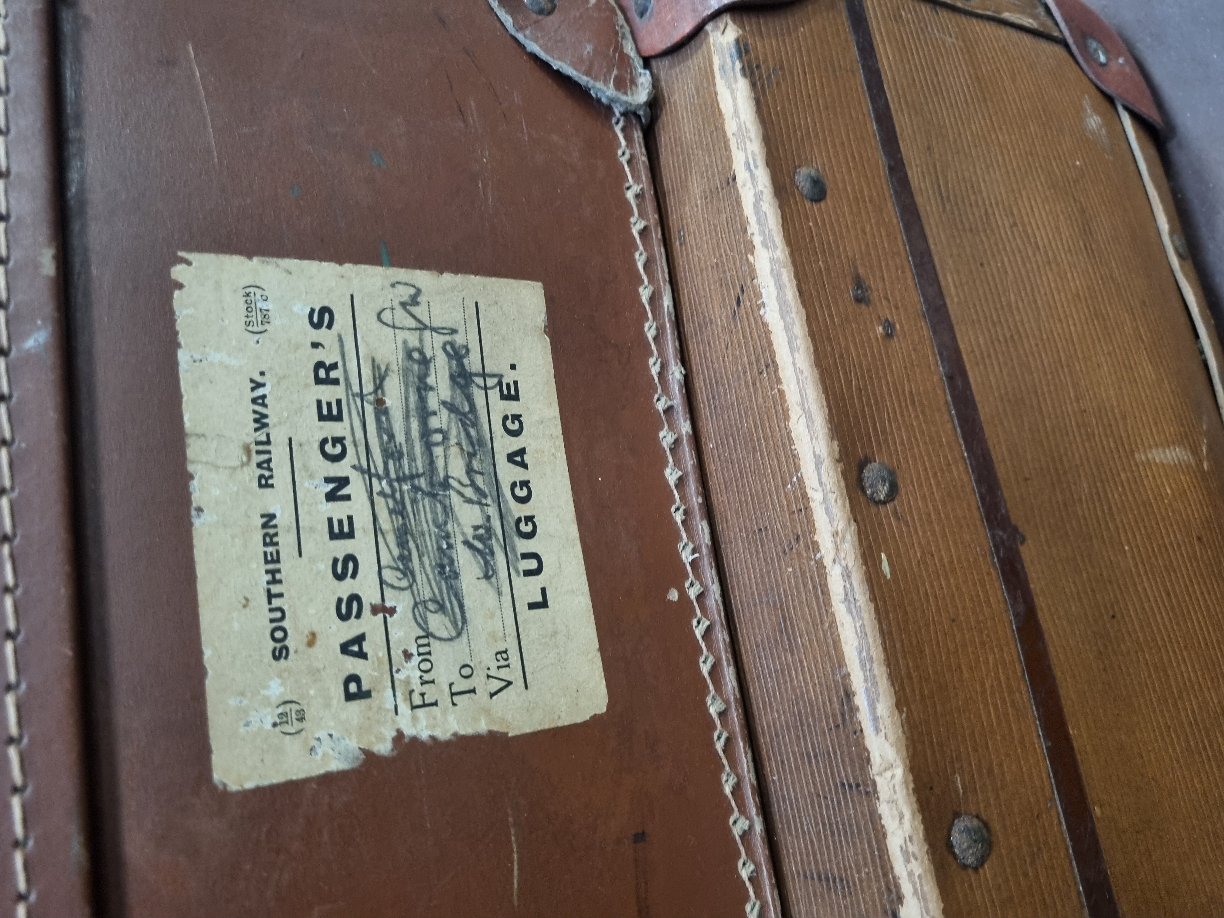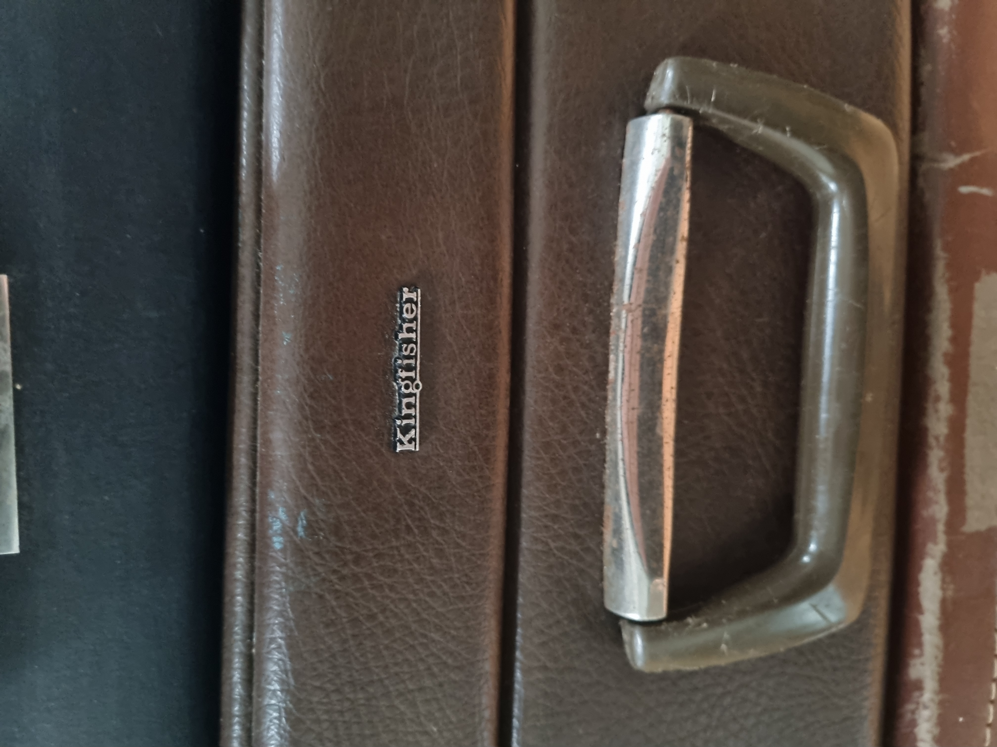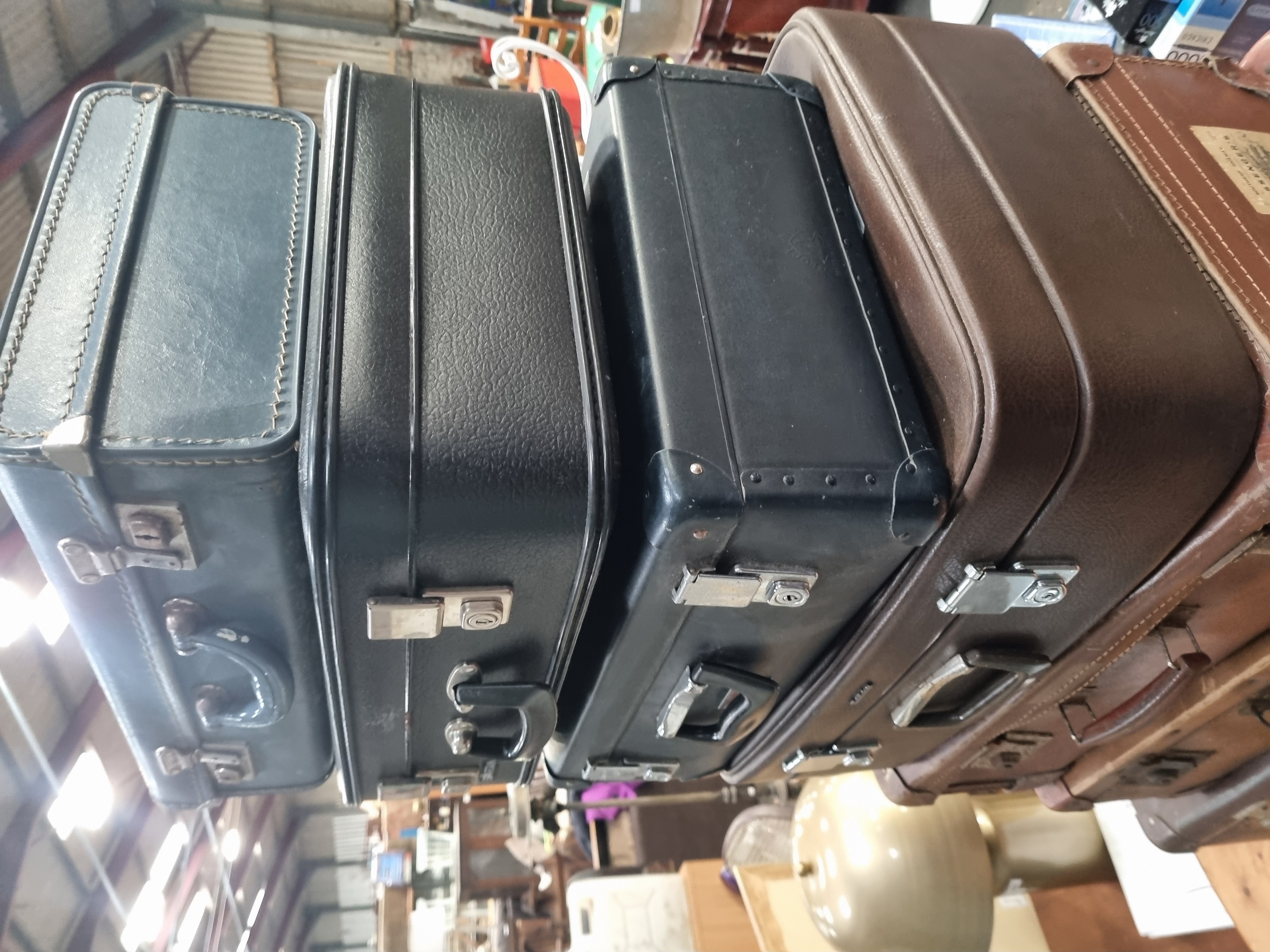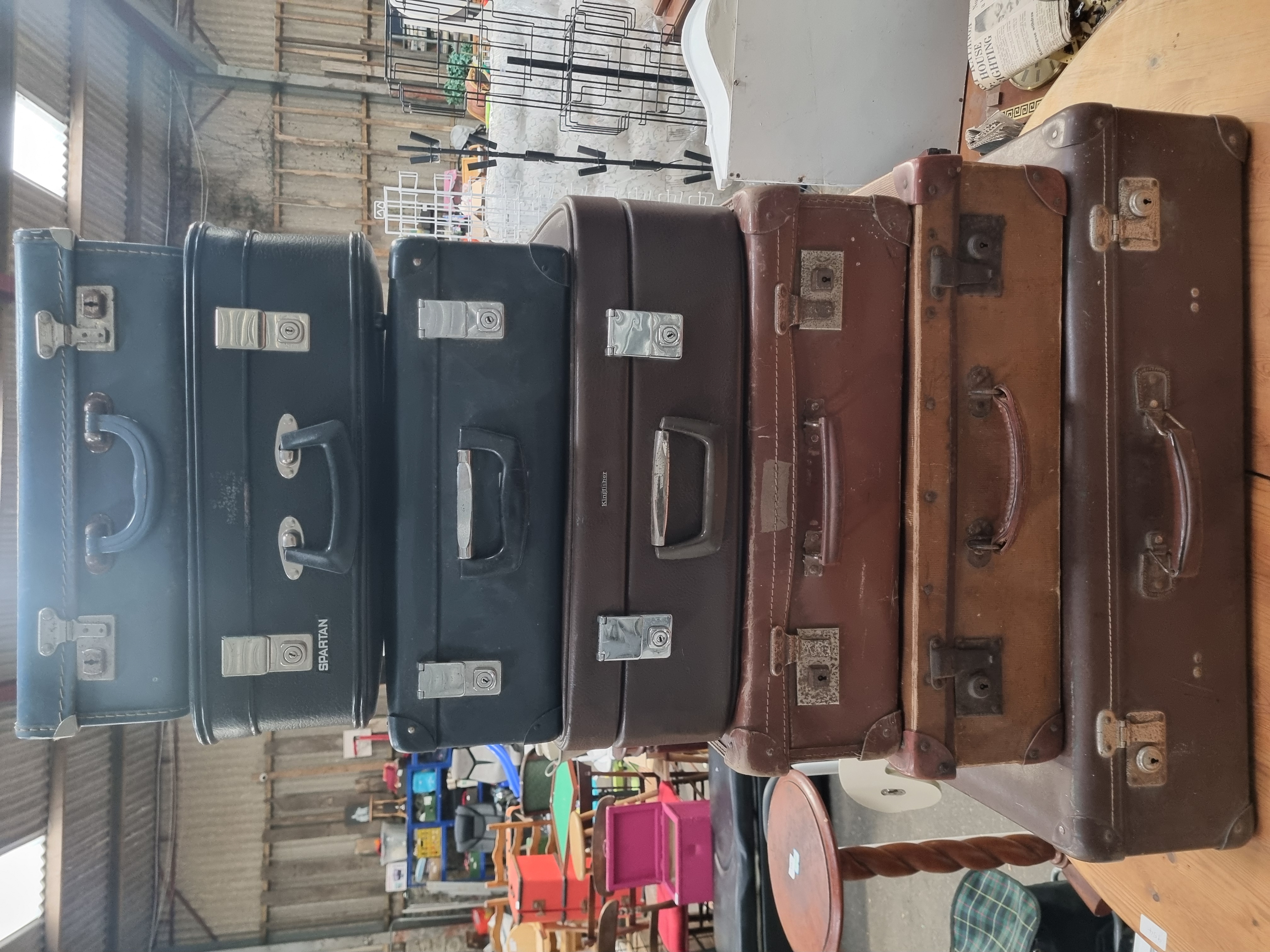 A collection of vintage and mid-century suitcases in varying sizes and colours, including shades of blue, black, and brown. The group comprises items constructed from fibreboard, faux leather, and textured vinyl. Specific examples include a black suitcase marked Spartan and a brown textured vinyl suitcase bearing the Kingfisher brand name. One brown fibreboard suitcase retains a vintage paper label printed with Southern Railway Passenger’s Luggage. The cases feature traditional metal latches, reinforced protective corners, and integrated carry handles. Several items display auction lot stickers from Liskeard Auction Rooms.