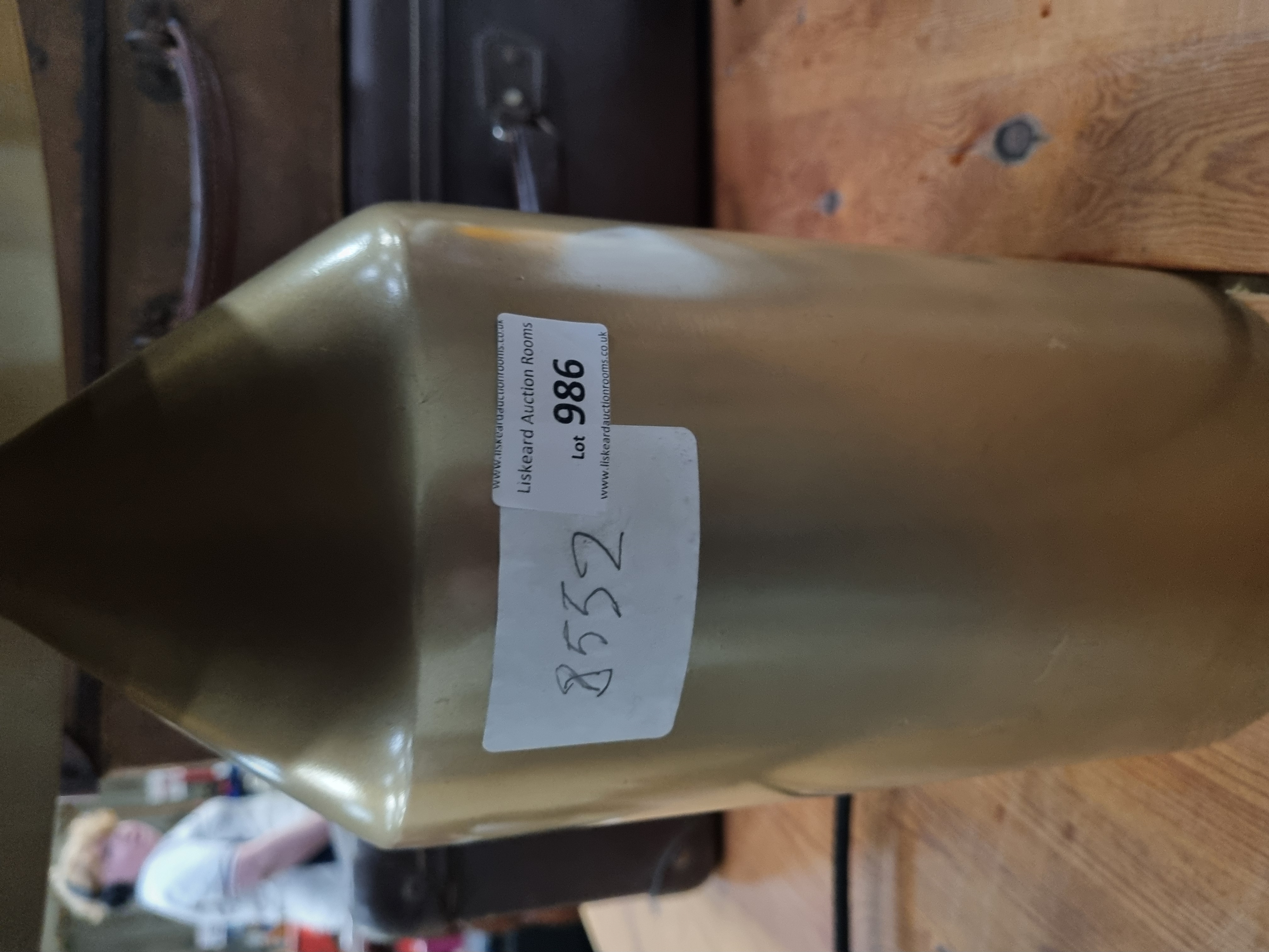 A table lamp in the mid-century modern style, featuring a mushroom-inspired design. The lamp consists of a large hemispherical metal dome shade topped with a small spherical finial. The shade is supported by a thick cylindrical base that tapers to a conical point at the neck. The entire piece is finished in a brushed gold-toned or brass-effect metal. The lamp is fitted with a black power cable and an integrated thumb-slide switch. Marks include a printed auction house label from Liskeard Auction Rooms (Lot 986) and a handwritten sticker numbered 8532 to the base. No manufacturer’s stamps or maker’s marks are visible.