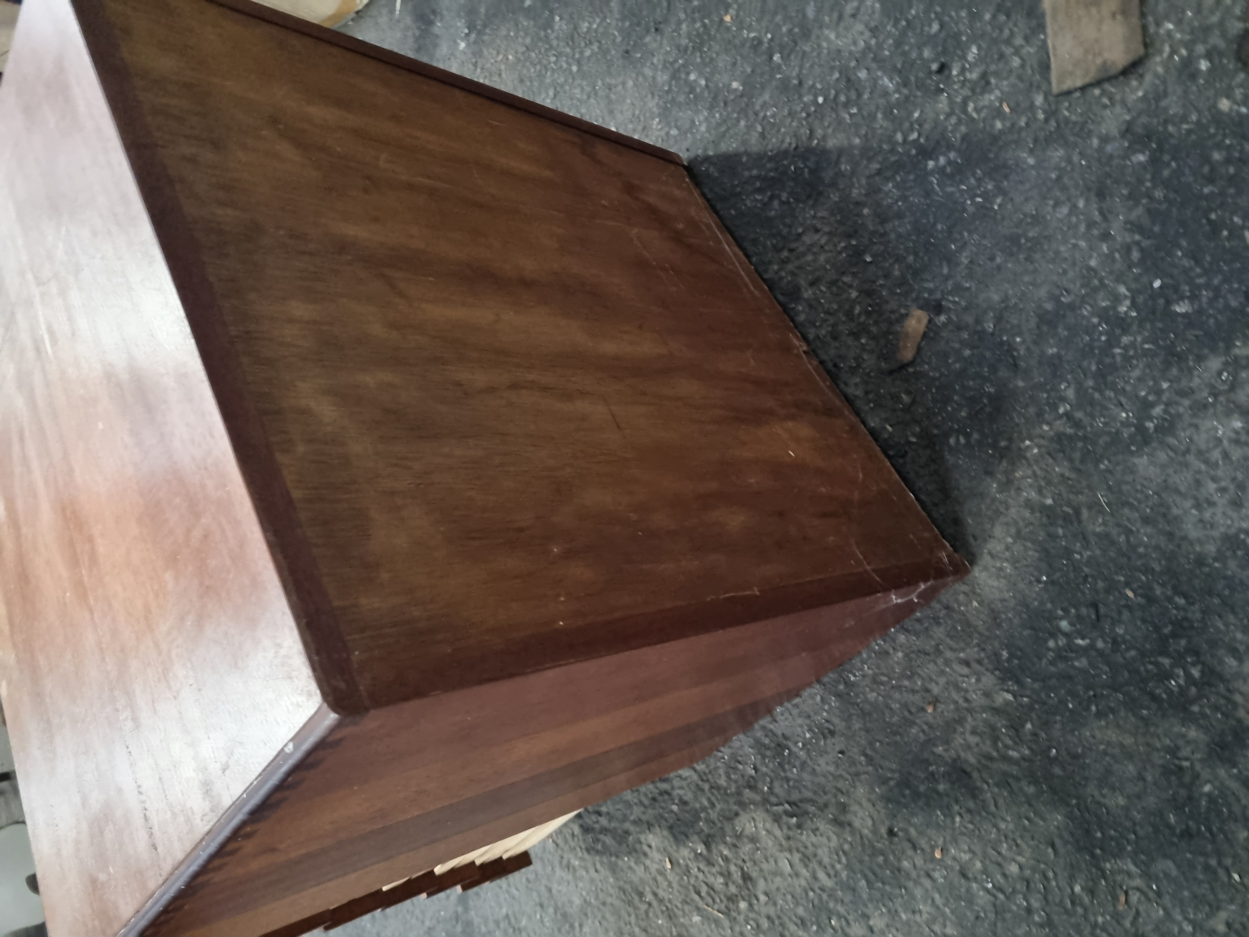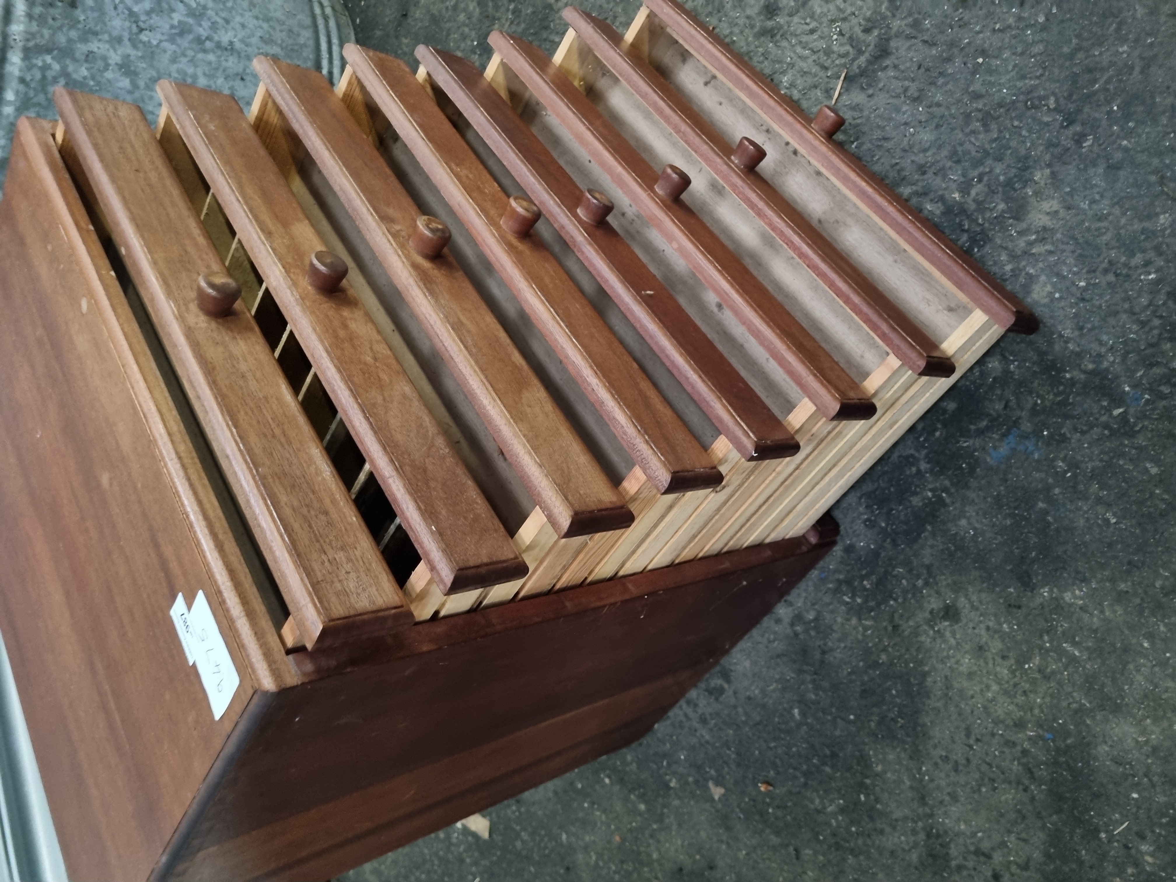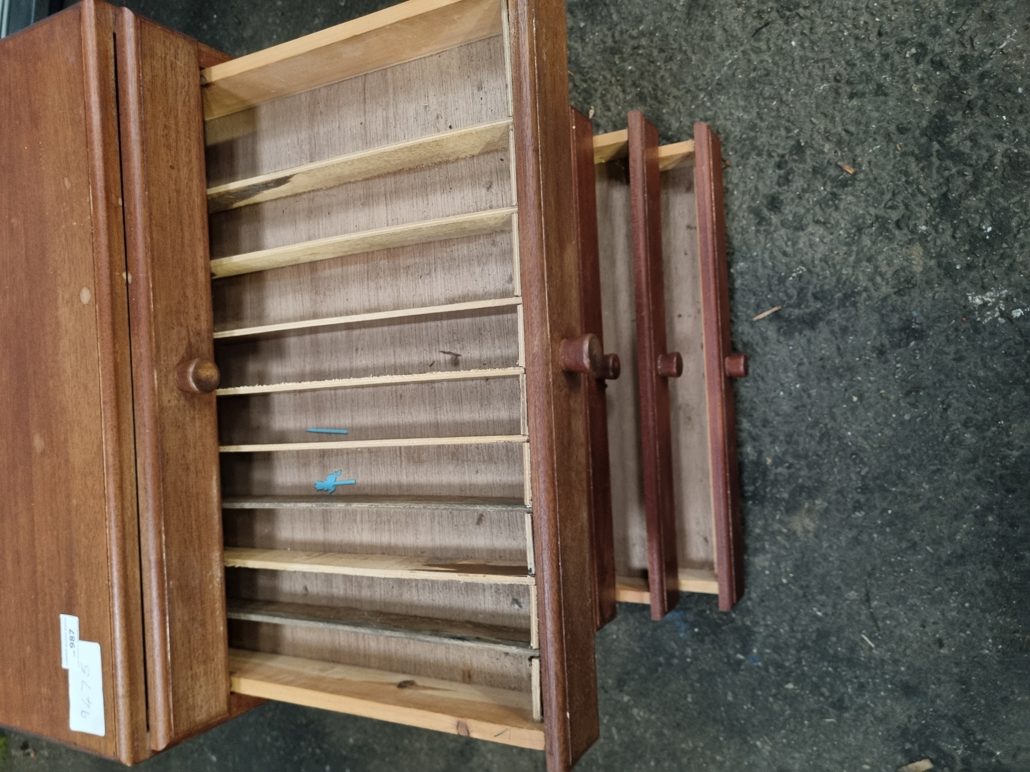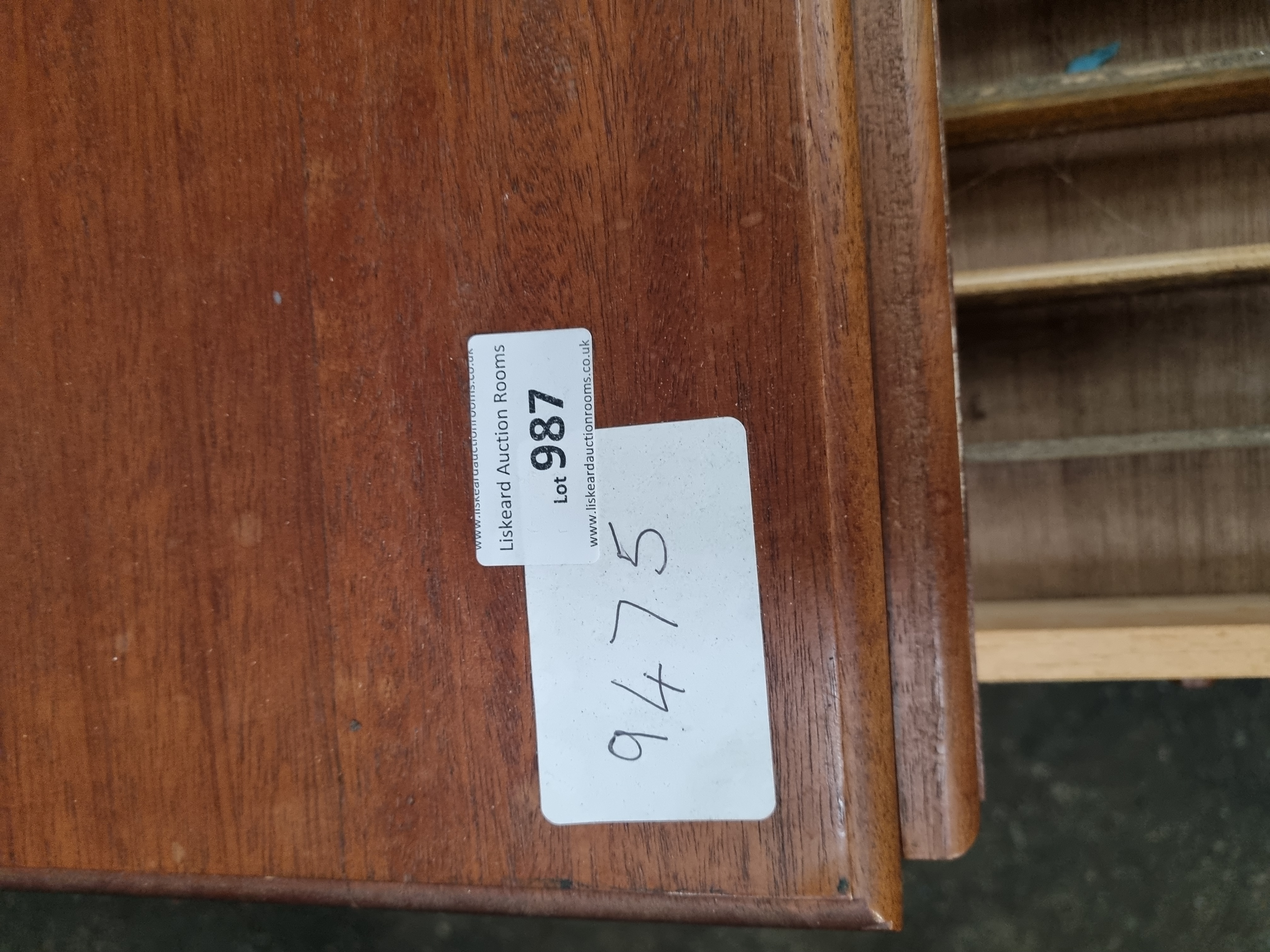 A mid-20th-century mahogany collector’s chest or specimen cabinet of utilitarian design. The rectangular carcass is constructed with exposed finger joints at the top corners and houses eight shallow, graduated drawers. Each drawer is fitted with a single turned wooden knob. The interior of one drawer features thin longitudinal dividers intended for the organisation of small, narrow items. The primary timber is mahogany with a warm reddish-brown finish, while secondary components include light-coloured wood for the drawer sides and plywood for the drawer bottoms. The exterior features an adhesive label from Liskeard Auction Rooms for Lot 987 and a handwritten label numbered 9475.