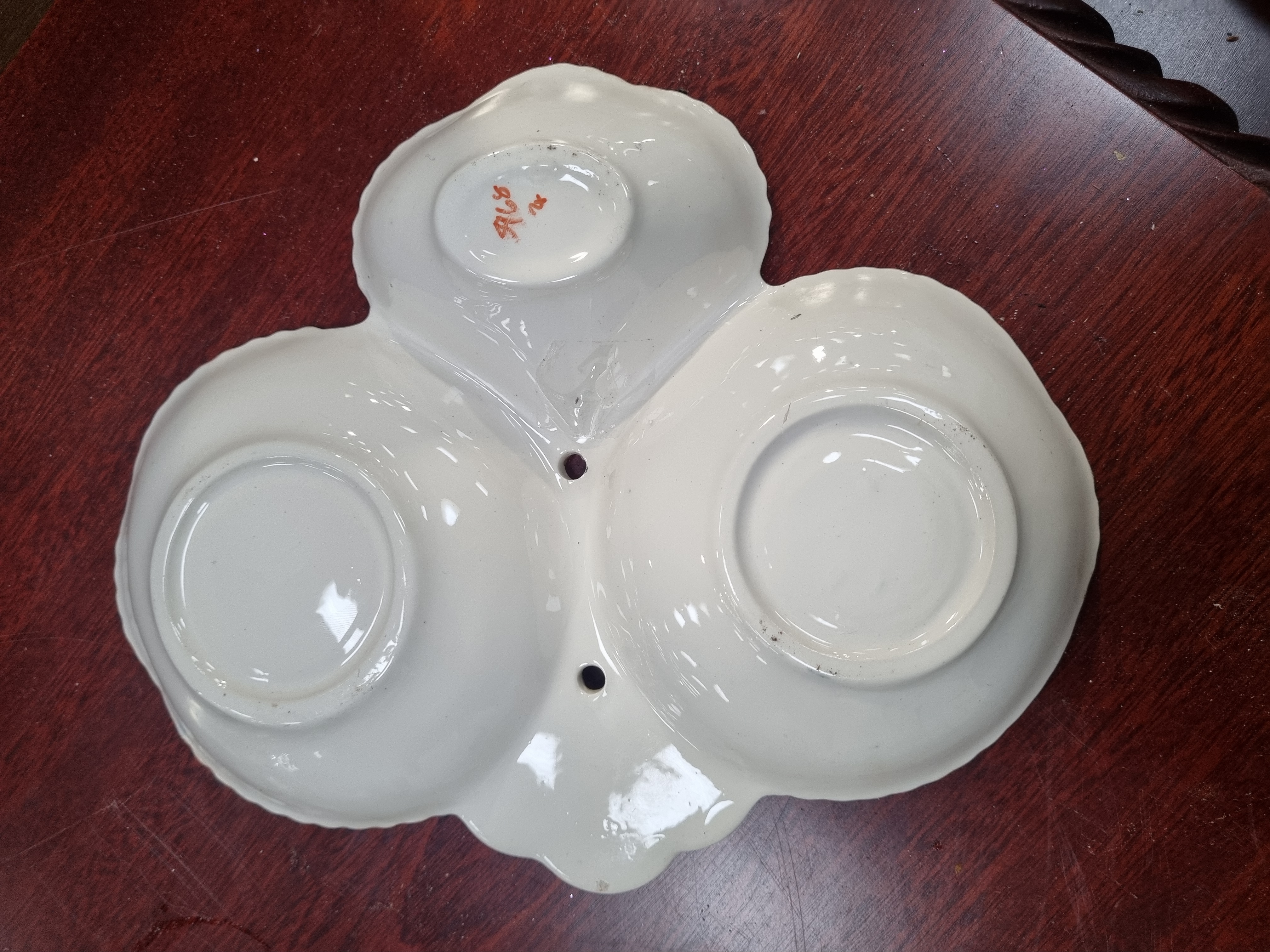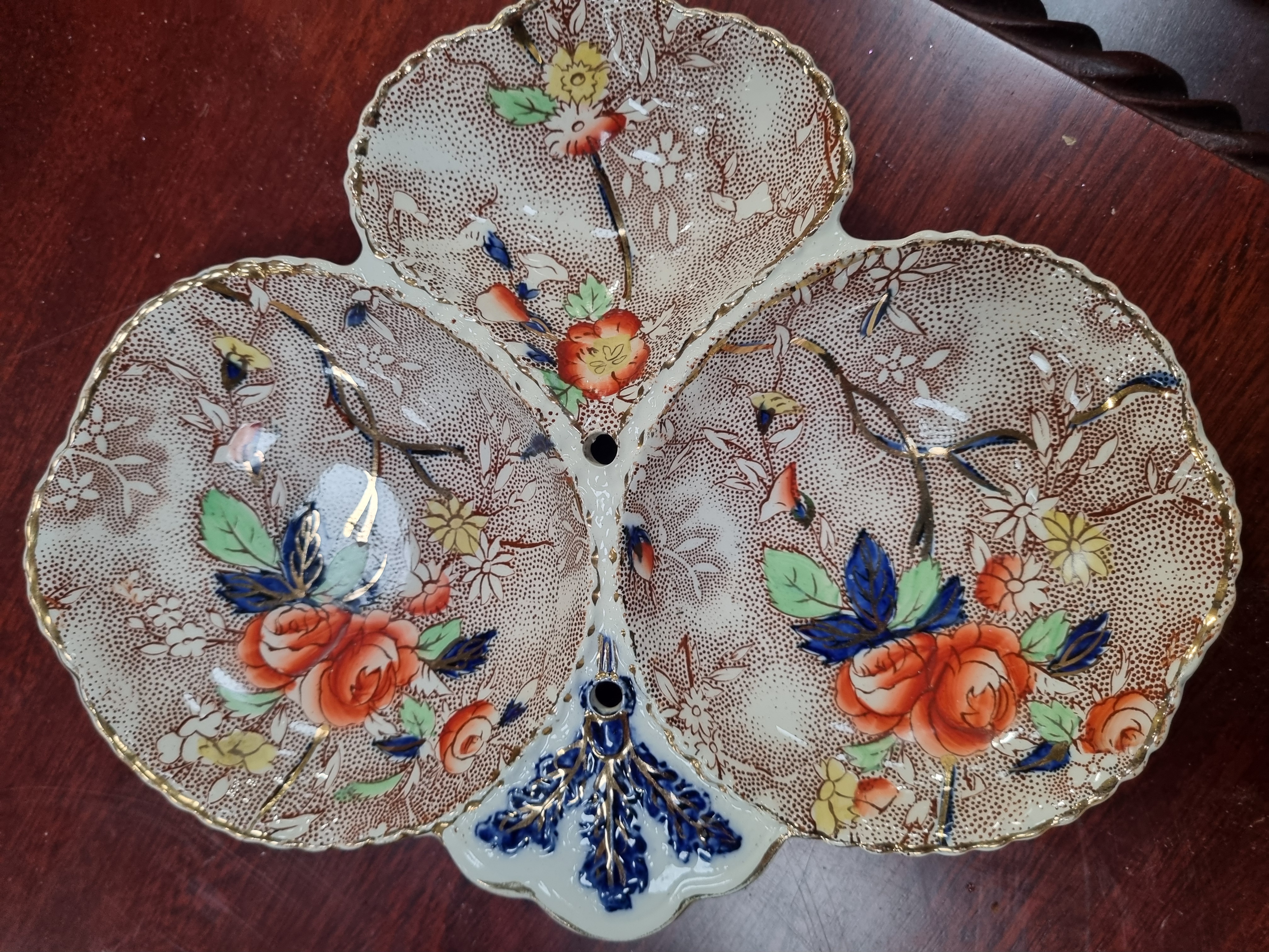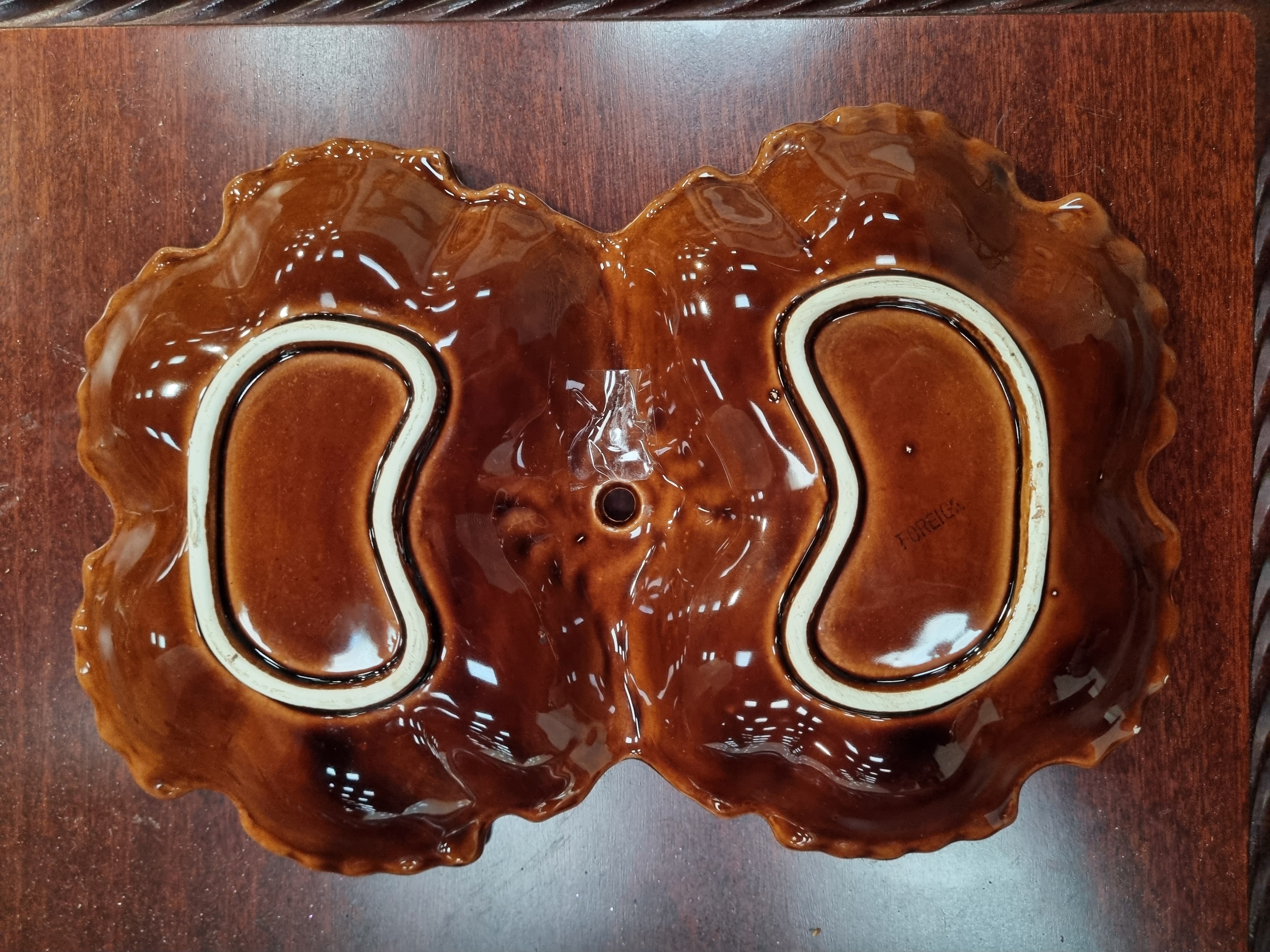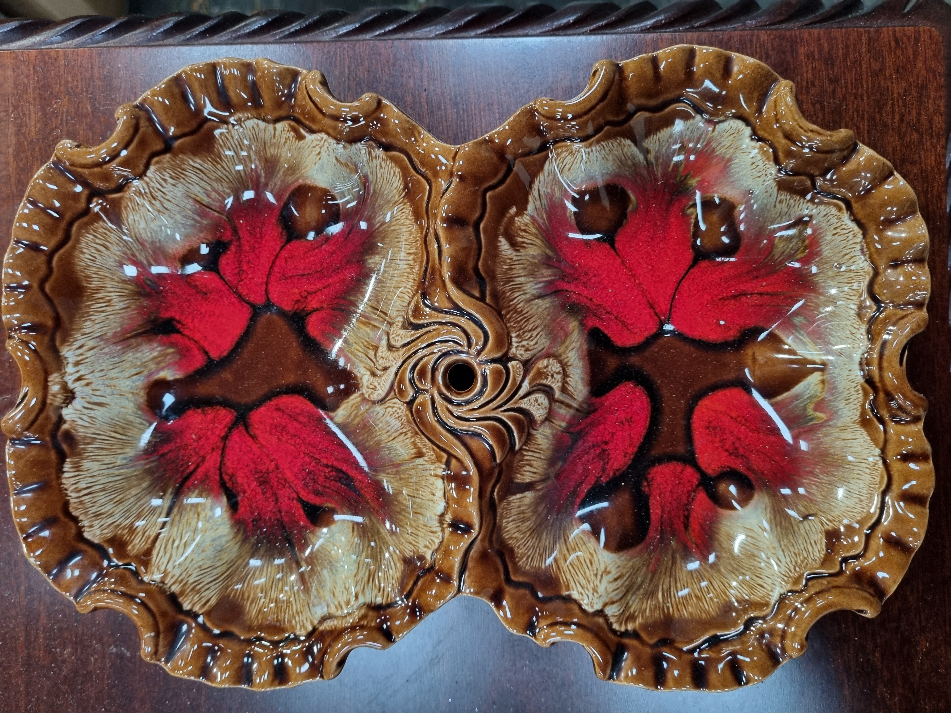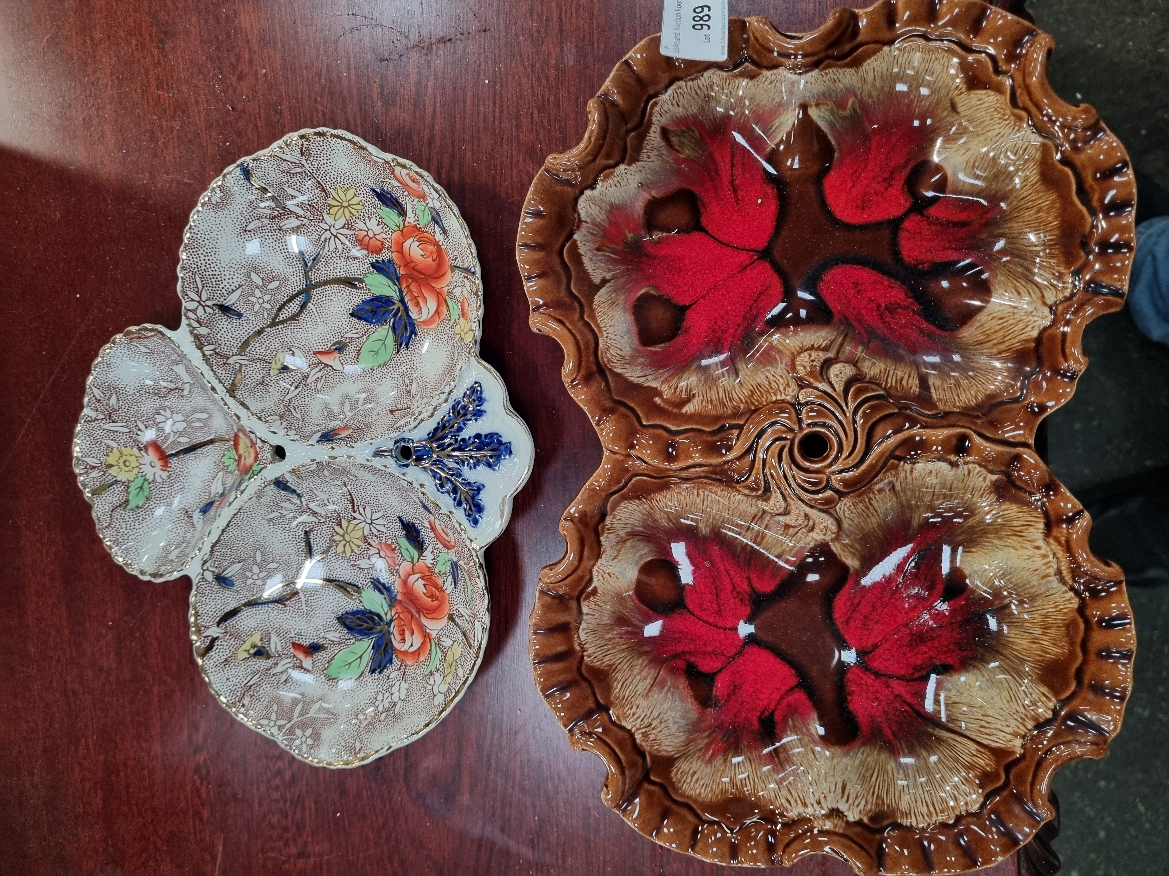 This lot comprises two distinct multi-compartment ceramic dishes. The first is a triple-lobed porcelain dish featuring a scalloped rim with gilt edging. It is decorated with hand-painted sprays of orange roses and yellow blossoms among cobalt blue and green foliage, set against a dense brown stippled ground. A relief-moulded foliate element at the base of one lobe is finished in blue and gold. The base is marked with the hand-painted characters 469/x in red. The second is a double-lobed earthenware dish with a deeply ruffled rim. It features a high-gloss drip glaze with abstract red motifs over a chocolate brown and ochre ground. The base is impressed with the mark FOREIGN. Both dishes feature central apertures designed to accommodate a carrying handle.