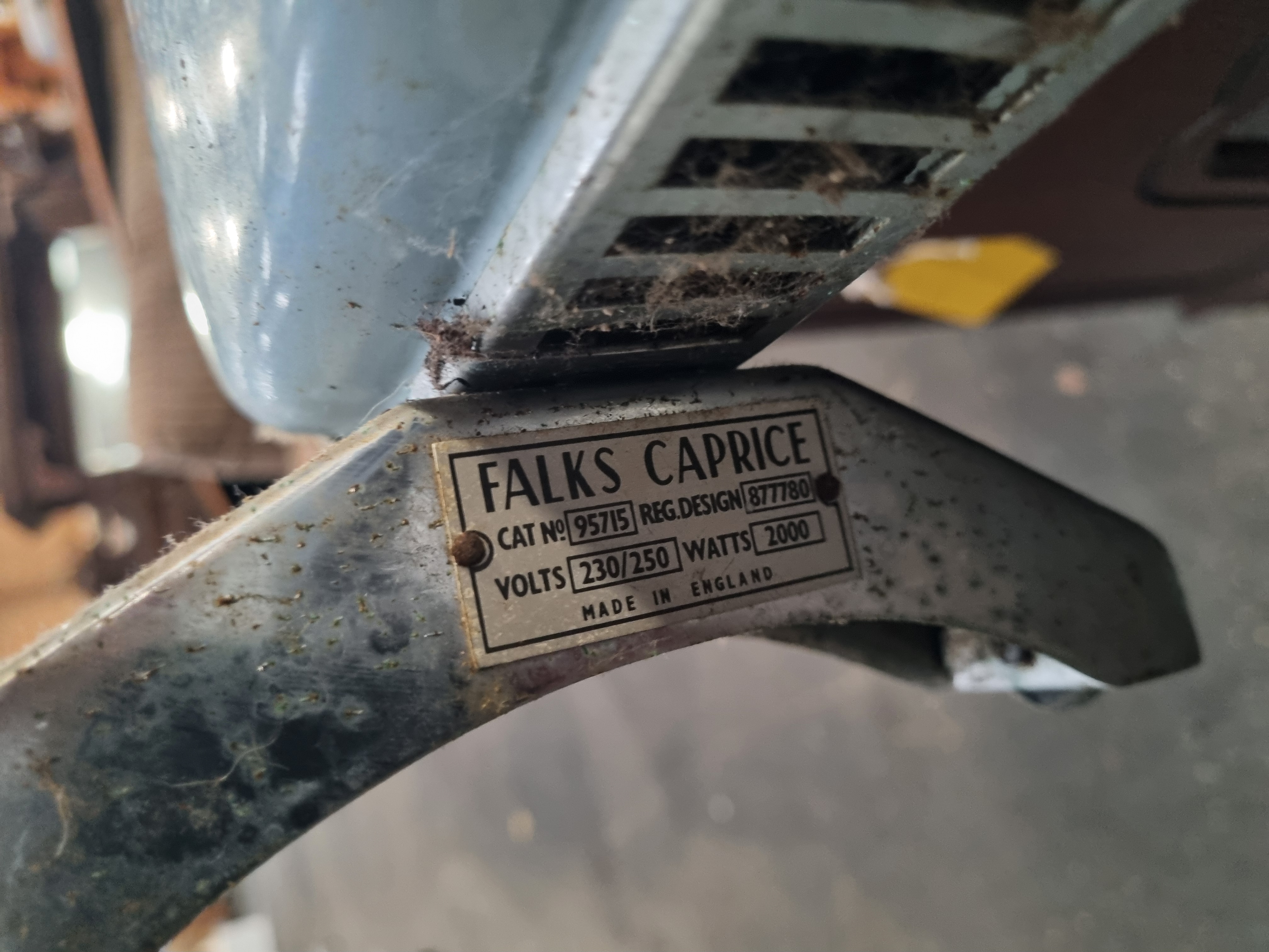 A mid-century portable electric convection heater, model Caprice, manufactured by Falks (Falk, Stadelmann & Co. Ltd.) in England. The unit features a streamlined, triangular-profile body with pale blue enamelled front and back panels set within a chrome-plated metal frame. It is supported by two splayed cast metal feet and incorporates a circular chrome-plated ring handle at the top. Ventilation slats are located along the upper edge for heat dissipation. The side frame houses a control interface consisting of a red plastic indicator light and a metal toggle switch. The manufacturer’s identification plate is riveted to the lower part of the frame and reads: FALKS CAPRICE, CAT No 95715, REG.DESIGN 877780, VOLTS 230/250, WATTS 2000, MADE IN ENGLAND. Based on the registered design number, the item dates to the mid-1950s.