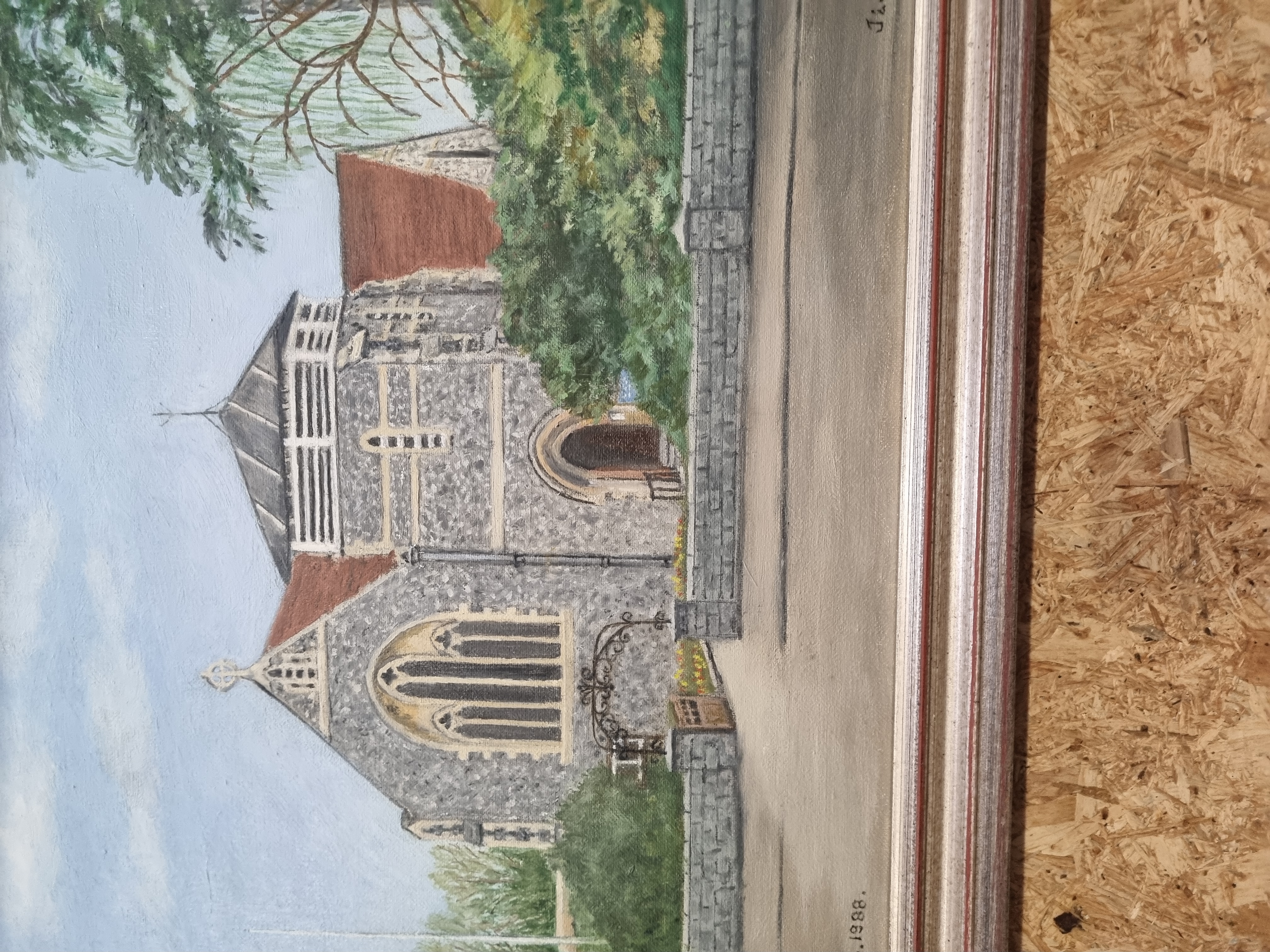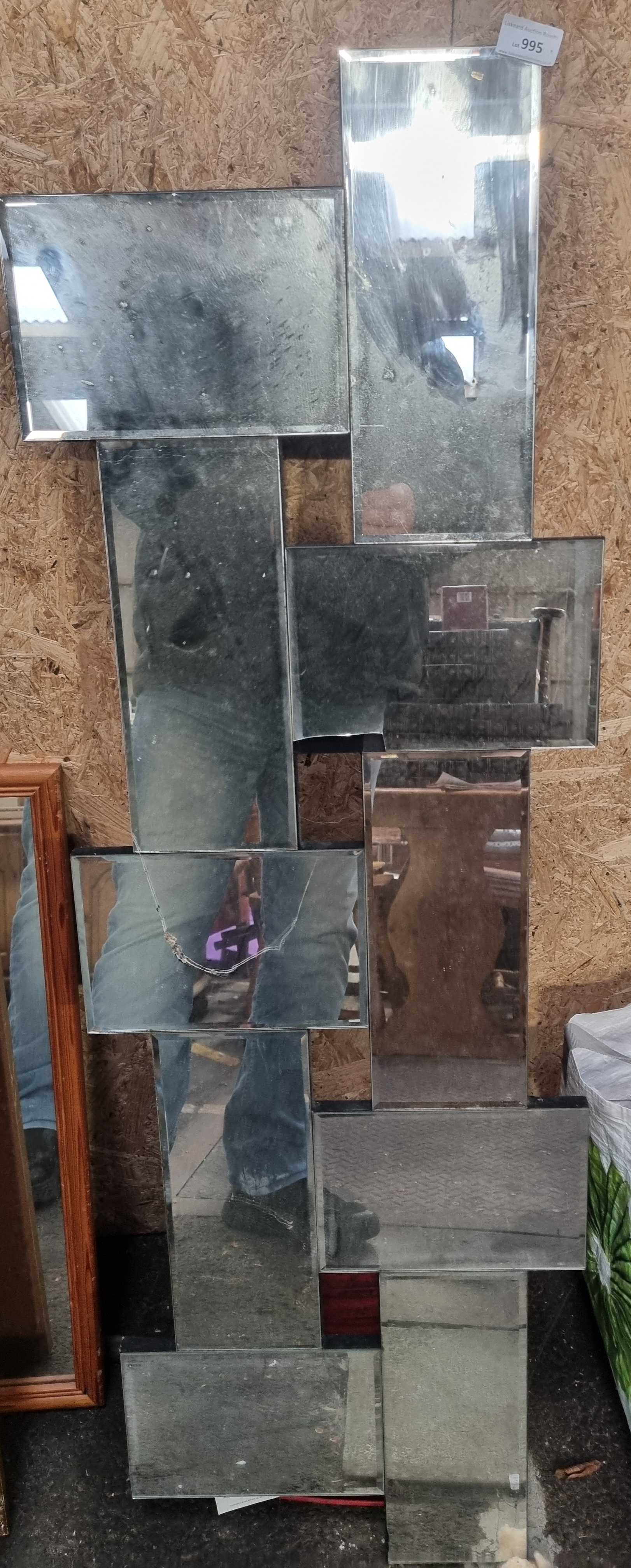 A large modernist geometric multi-panelled wall mirror in the style of Neal Small, featuring eleven interlocking rectangular and square bevelled glass panels of various dimensions and orientations. The mirror plates are fixed to a dark-painted wooden backing board with exposed black edges. A lot sticker for Liskeard Auction Rooms numbered 995 is present to the upper right corner. Accompanying the mirror is an architectural landscape painting, likely oil or acrylic on board, depicting a traditional stone church with flint-work masonry and a prominent square tower. The painting is signed with initials J.L. and dated 1988 to the lower right corner and is housed in a contemporary silver-toned stepped wooden frame.