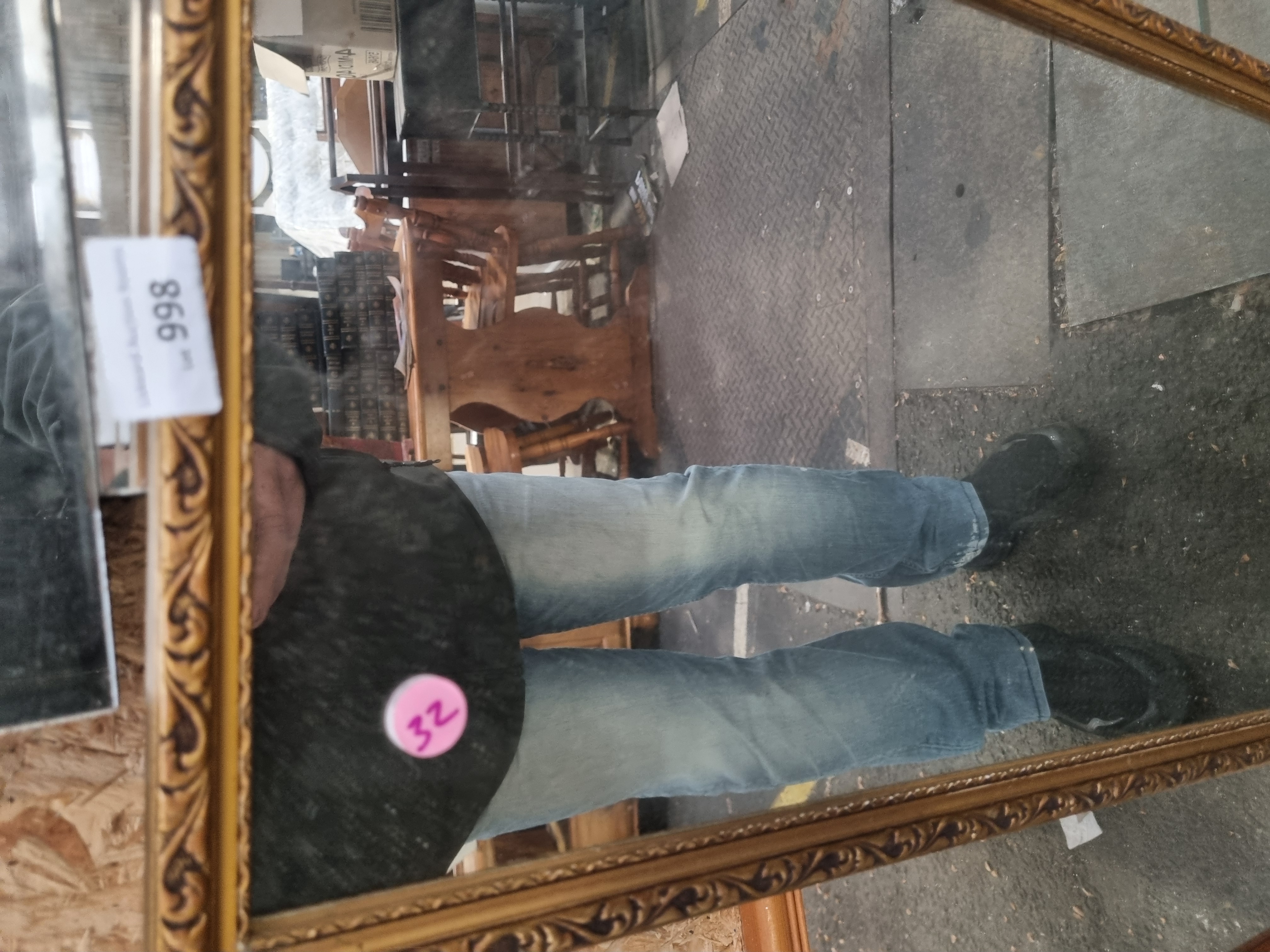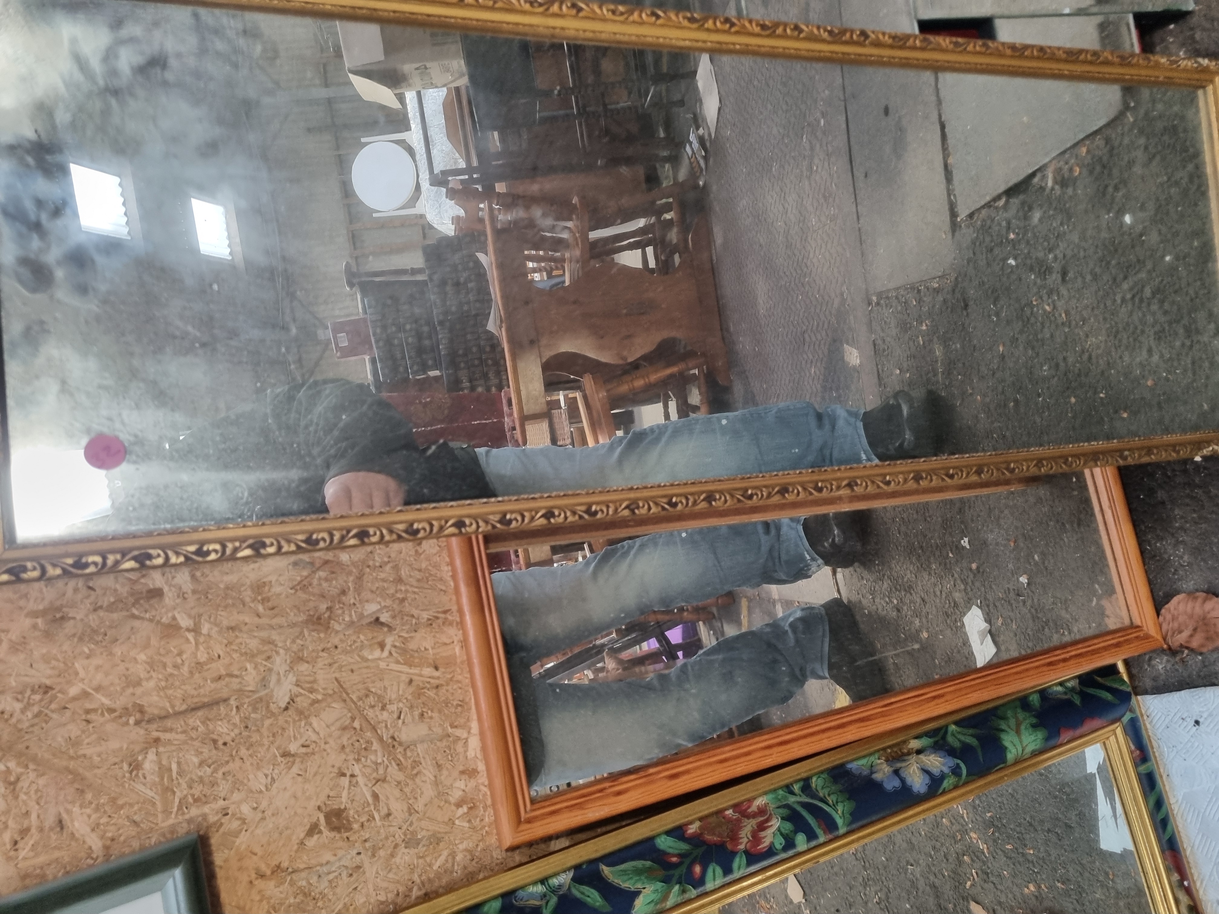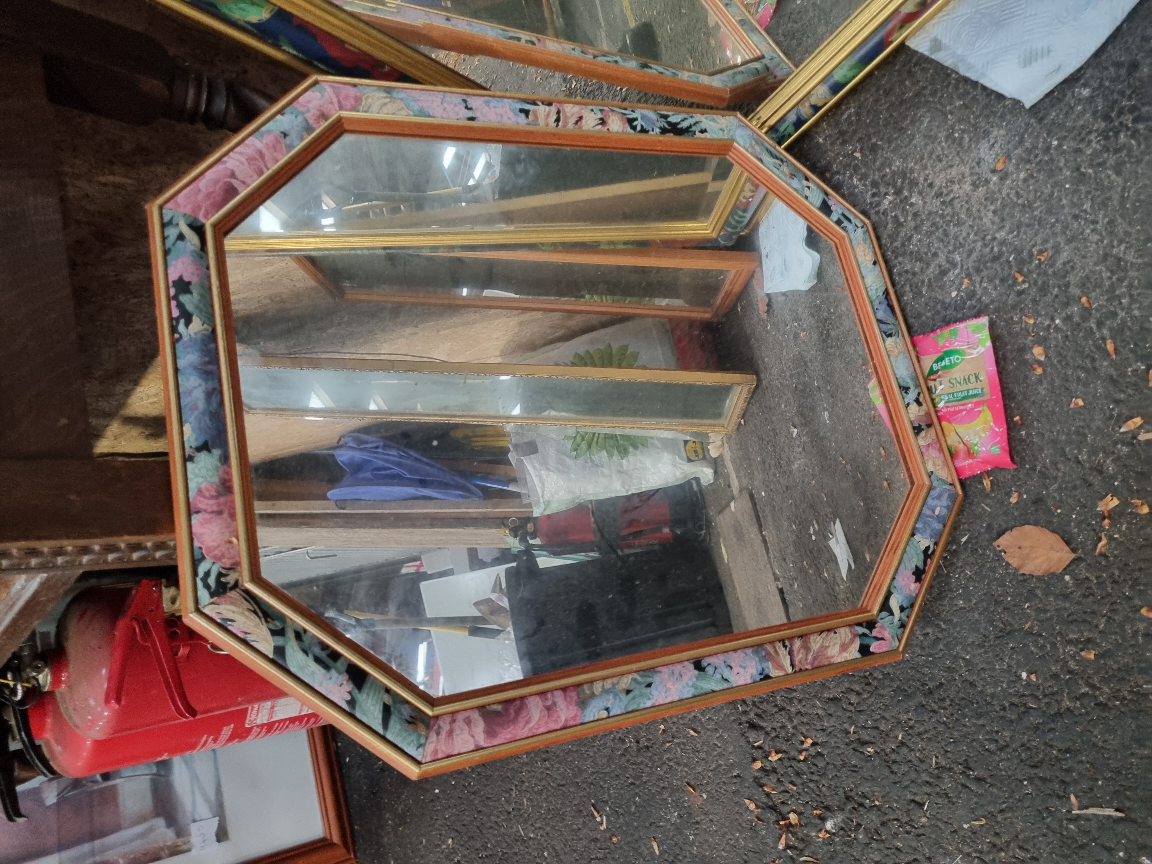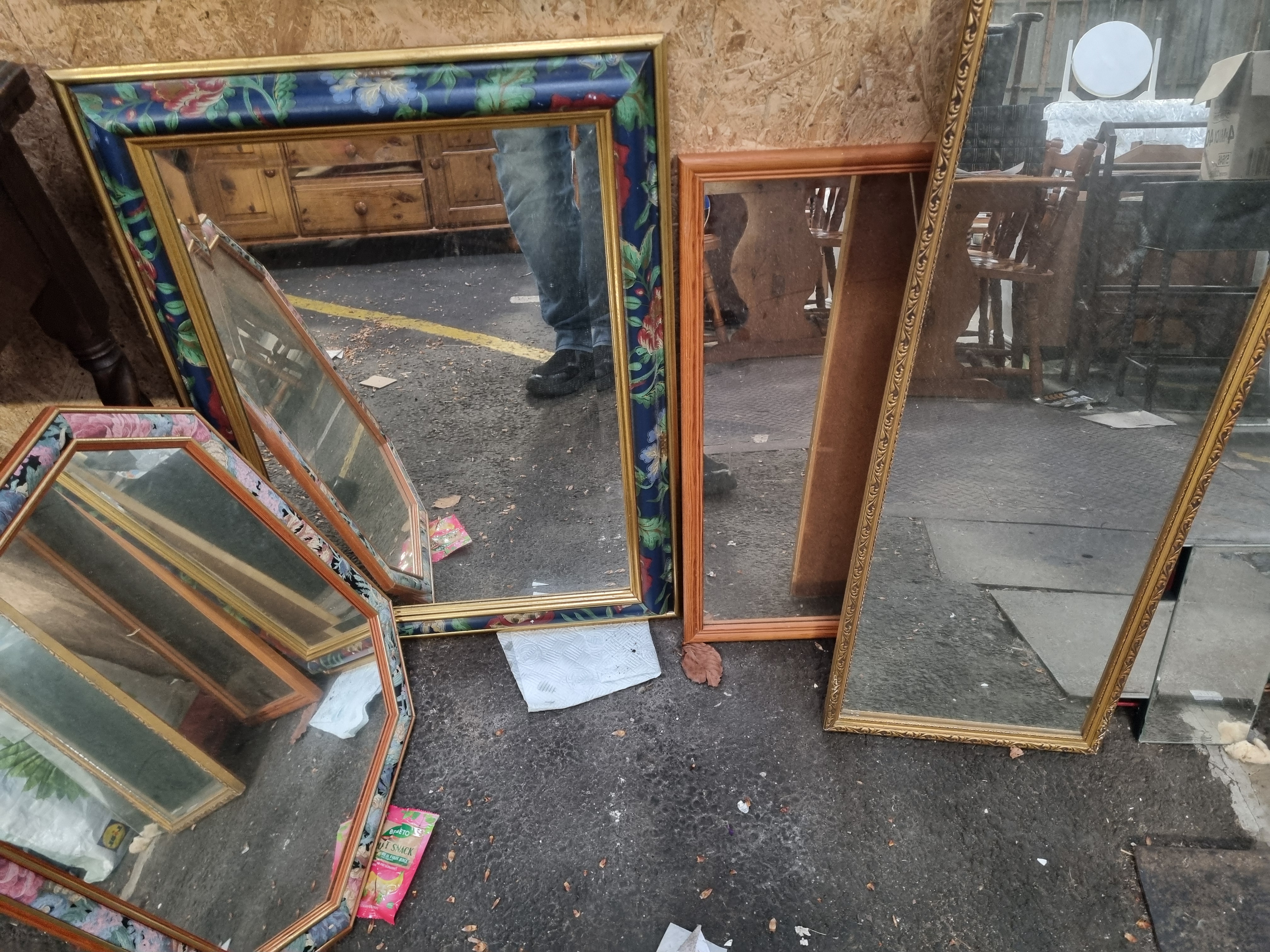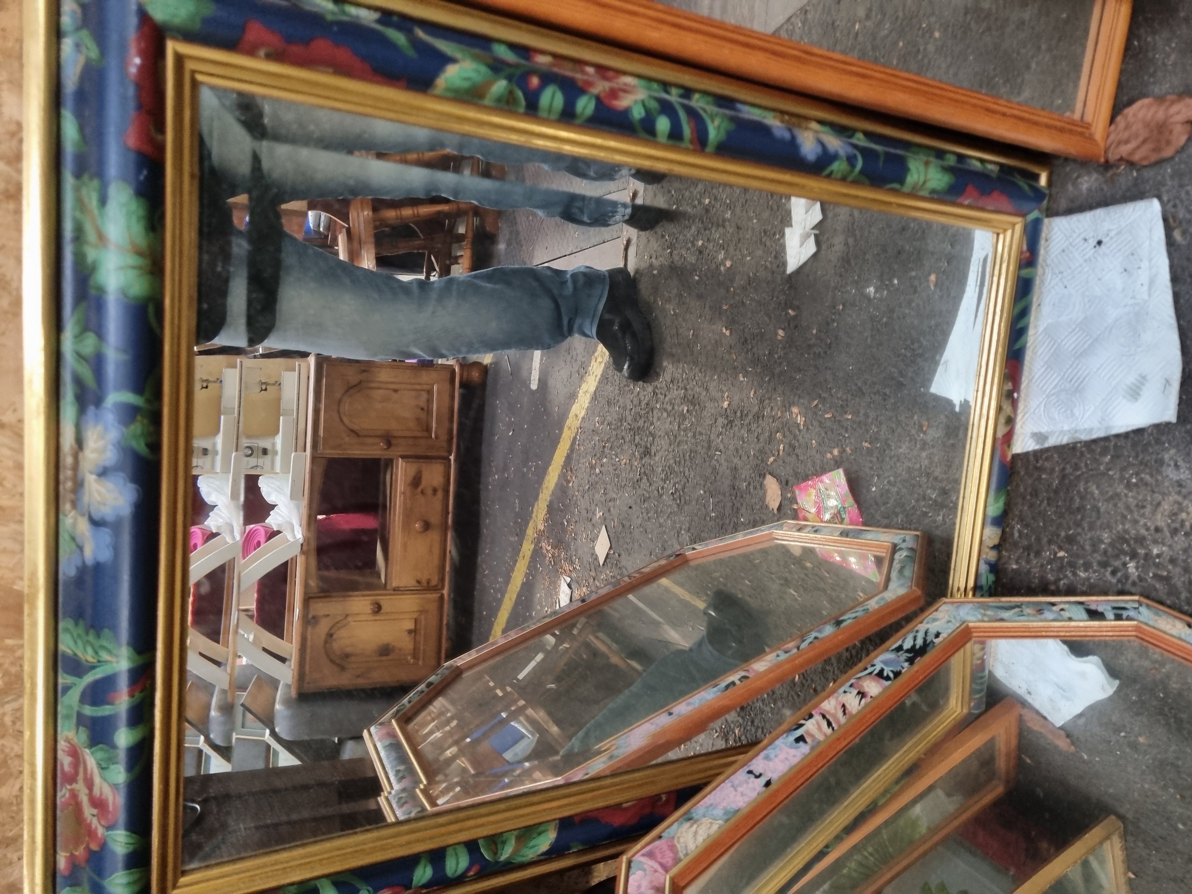 An assortment of late 20th-century wall mirrors of various shapes and styles. The collection includes a large rectangular wall mirror featuring a navy blue floral chintz-style wrap frame with gold-coloured bead-effect inner and outer borders. Included is an octagonal mirror decorated with a pink floral chintz pattern, set within a narrow wooden outer frame with a gilt inner slip. The lot also contains a rectangular wall mirror with a simple light-coloured wooden frame and two tall, narrow rectangular mirrors with gilt-finished moulded frames. One of these gilt frames features a repetitive scrolled decorative pattern. All mirrors contain clear glass plates. One mirror bears a white rectangular auction tag with the printed number 998, and another displays a circular pink sticker with the handwritten number 32.